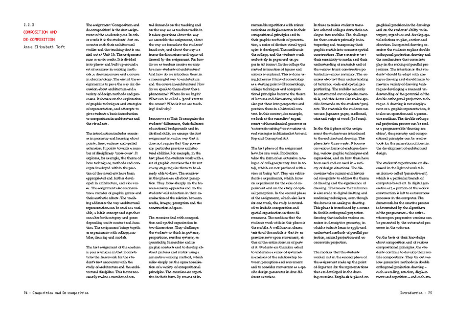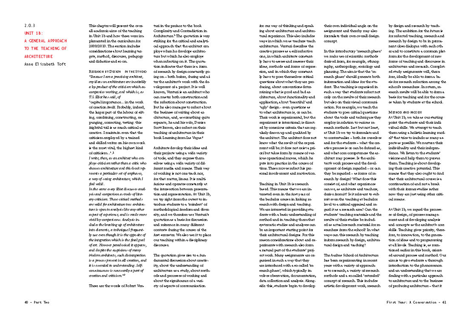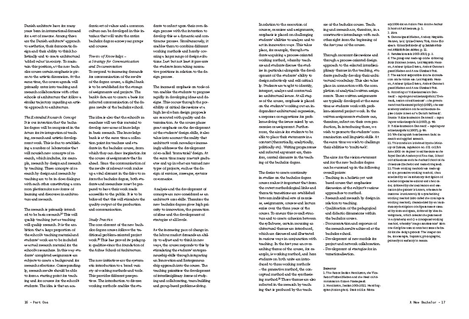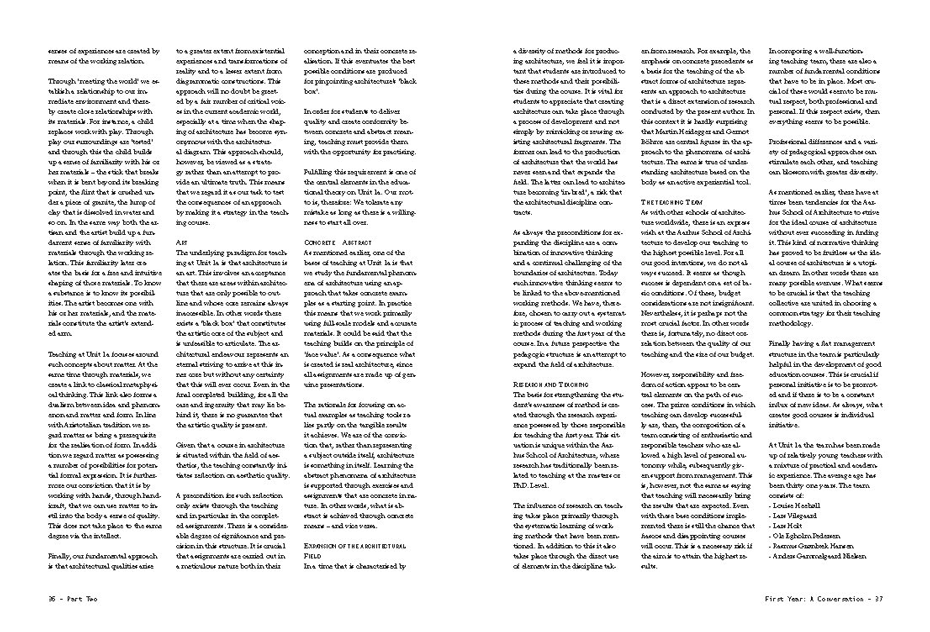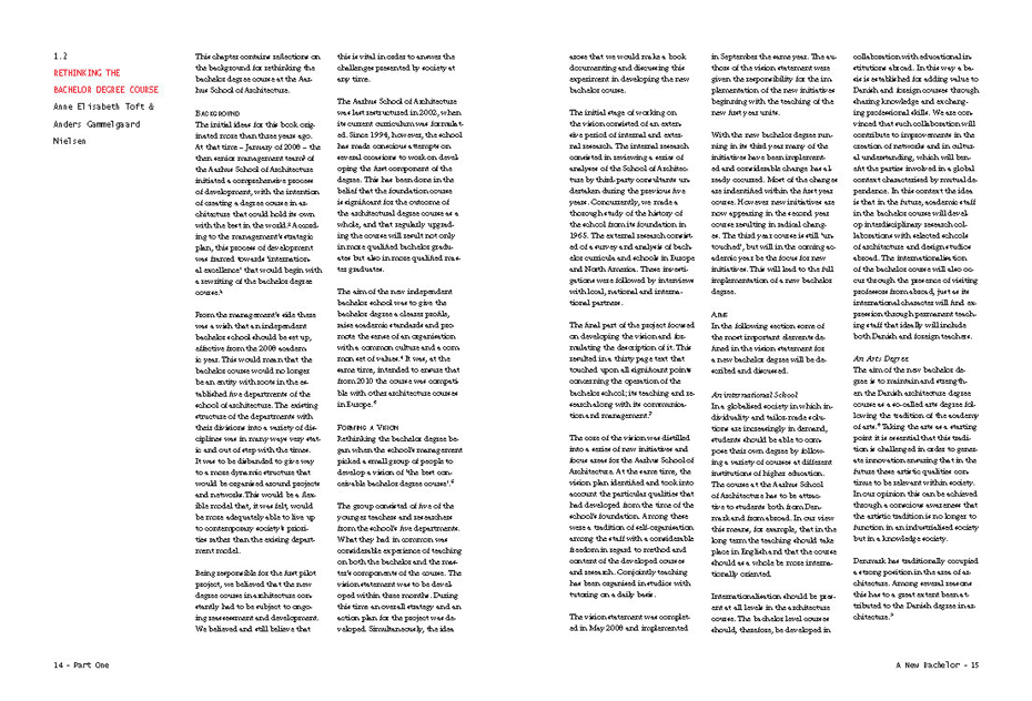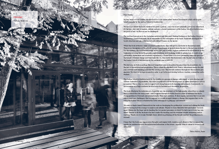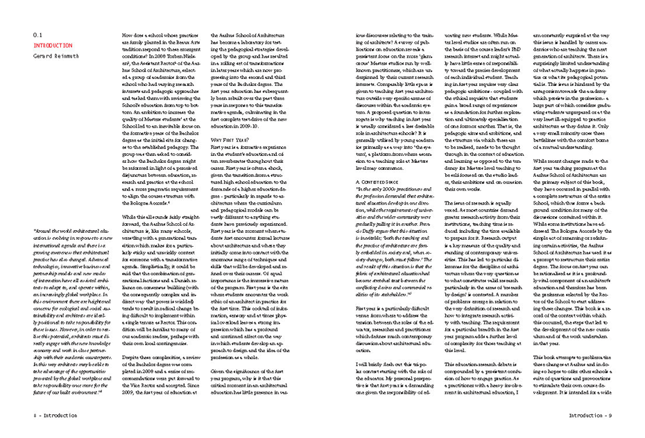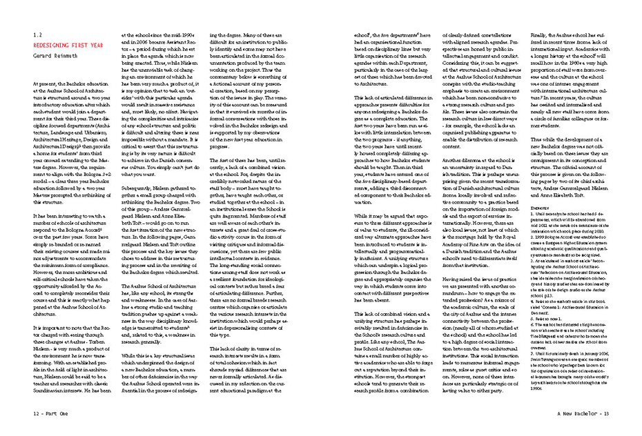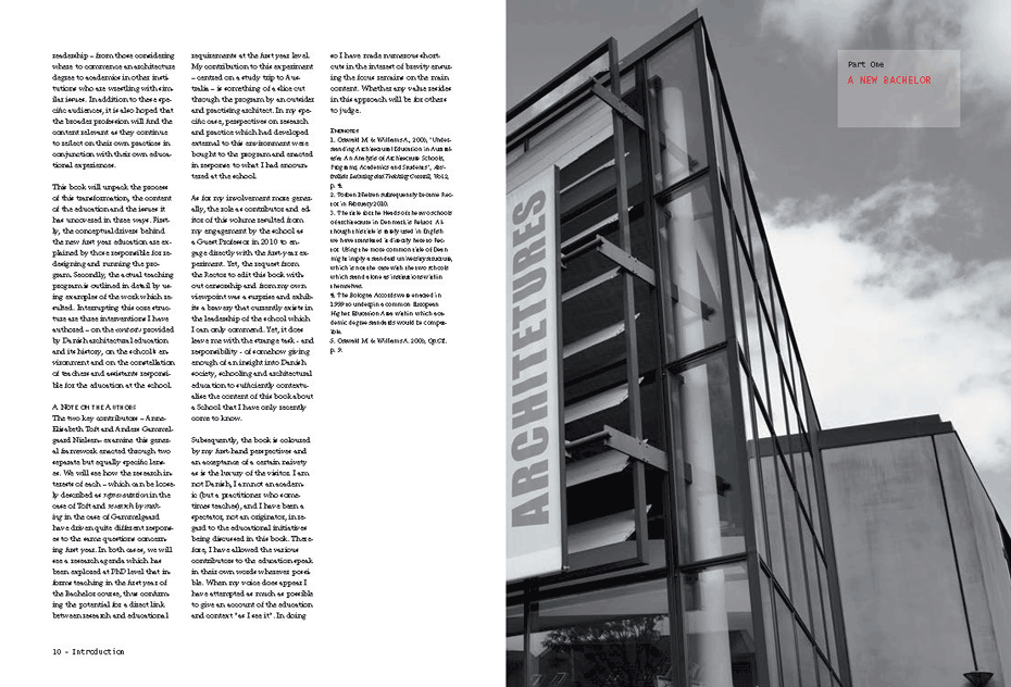 In 2008 Torben Nielsen, the dean of the Aarhus School of Architecture, selected a group of academics from the school who had varying research interests and pedagogic approaches and tasked them with reviewing the School's education from top to bottom. The group was then asked to consider how the Bachelor degree might be reformed in light of a perceived dis-juncture between education, research and practice at the school and to start implementing these changes in the first year program. The first year education at the school has subsequently been rebuilt over the past three years, culminating in the complete test-drive of the new education in 2009-10. This book is a record of the context within which this occurred, the steps that led to the development of the new curriculum and of the work undertaken in that year.