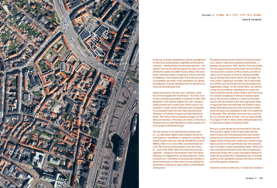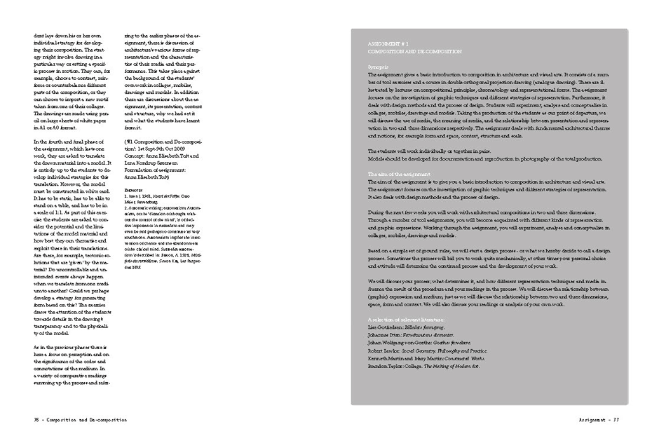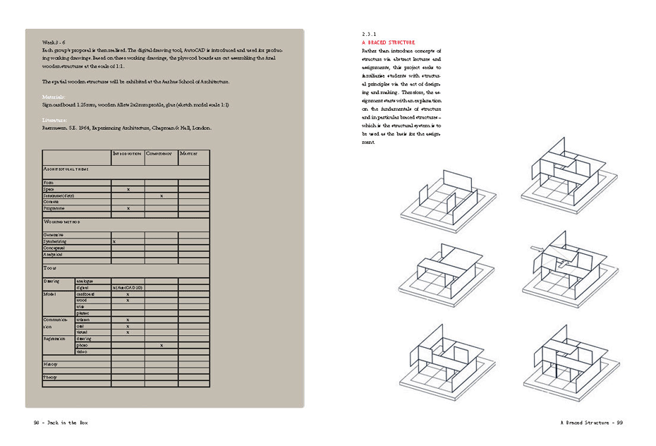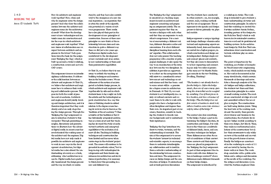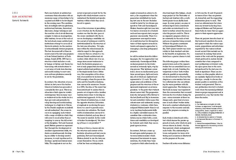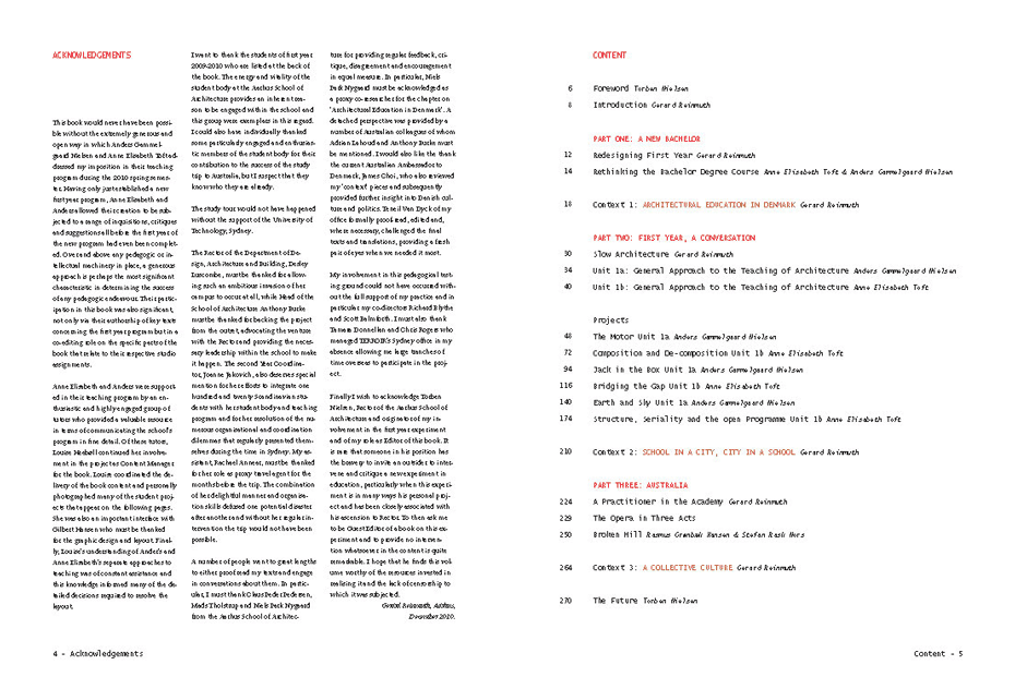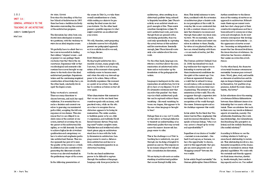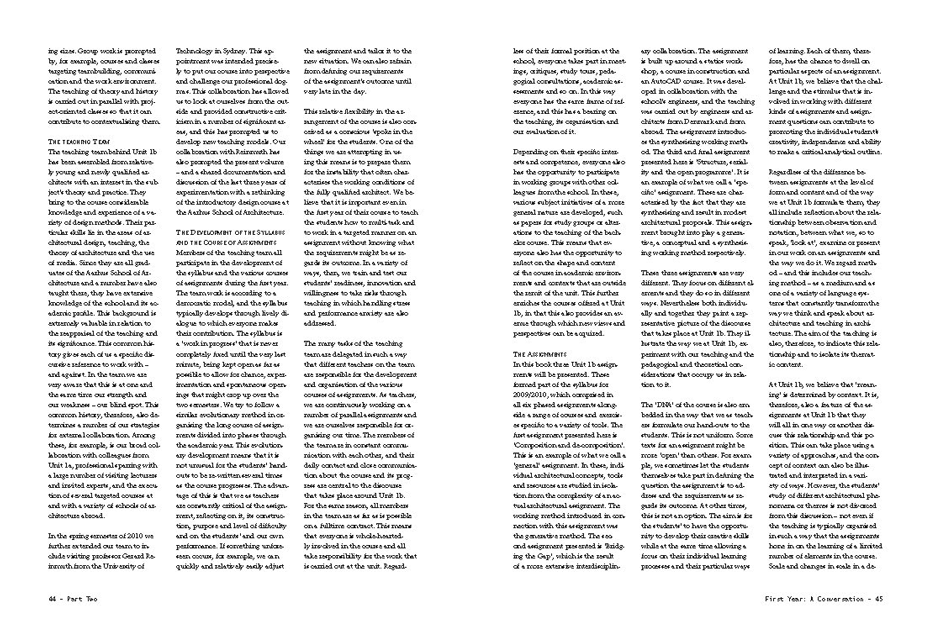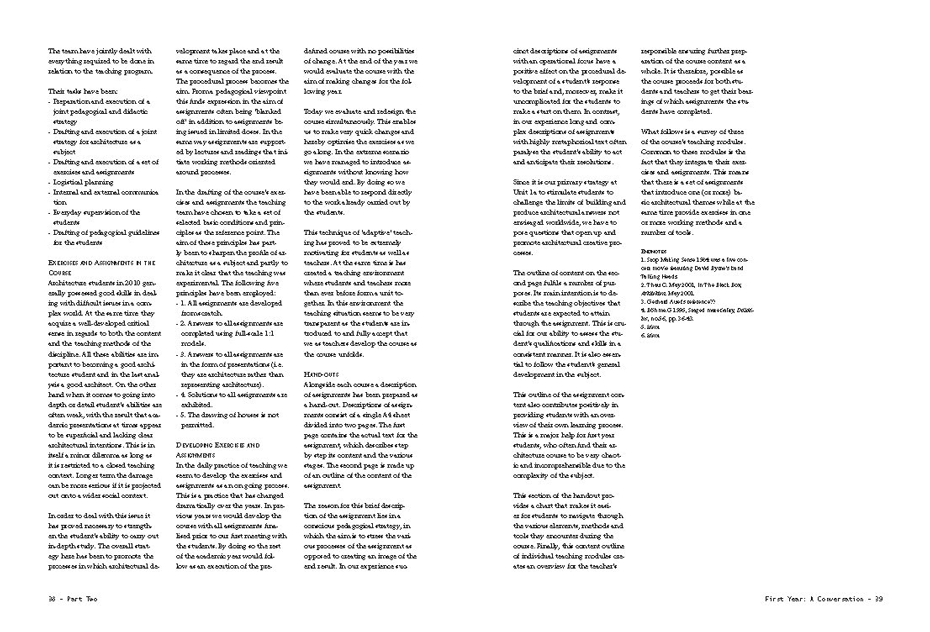 In 2008 Torben Nielsen, the dean of the Aarhus School of Architecture, selected a group of academics from the school who had varying research interests and pedagogic approaches and tasked them with reviewing the School's education from top to bottom. The group was then asked to consider how the Bachelor degree might be reformed in light of a perceived dis-juncture between education, research and practice at the school and to start implementing these changes in the first year program. The first year education at the school has subsequently been rebuilt over the past three years, culminating in the complete test-drive of the new education in 2009-10. This book is a record of the context within which this occurred, the steps that led to the development of the new curriculum and of the work undertaken in that year.