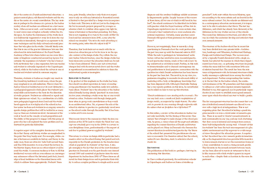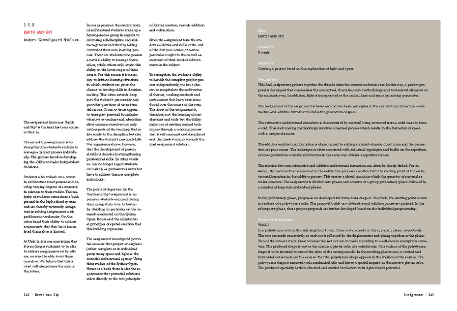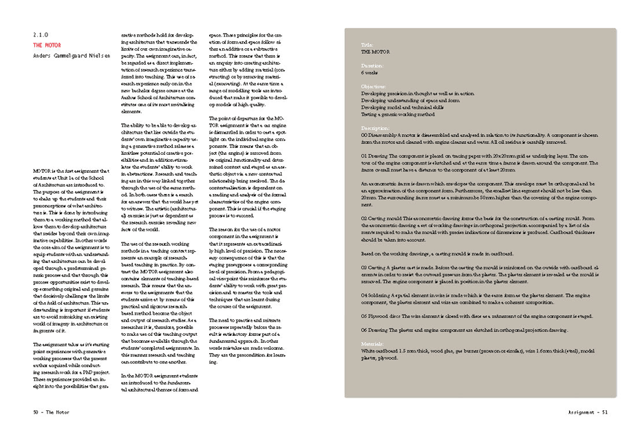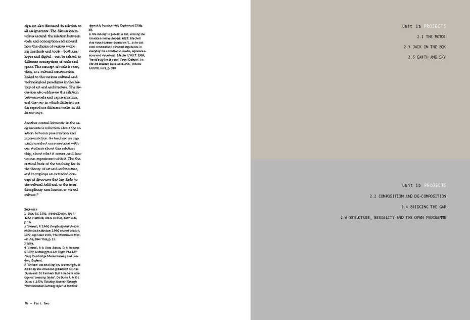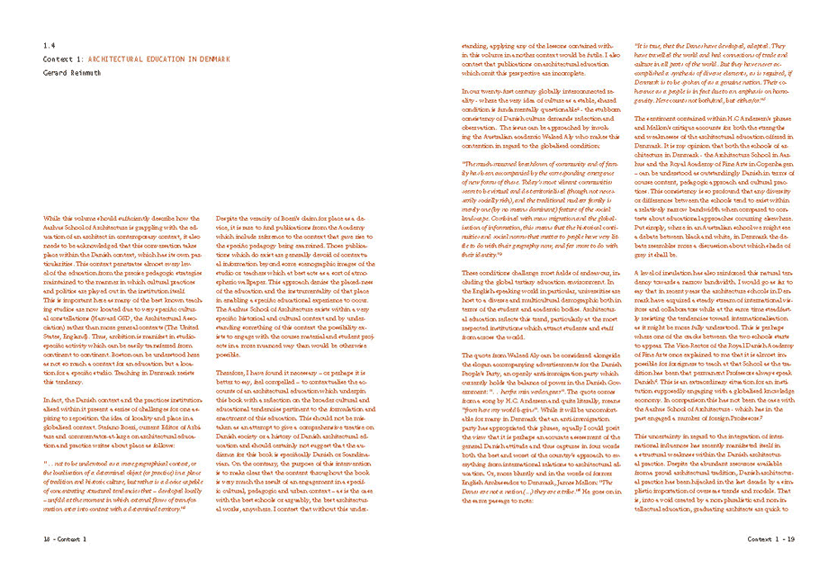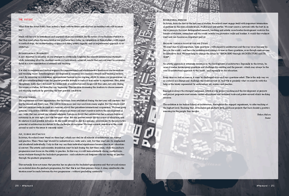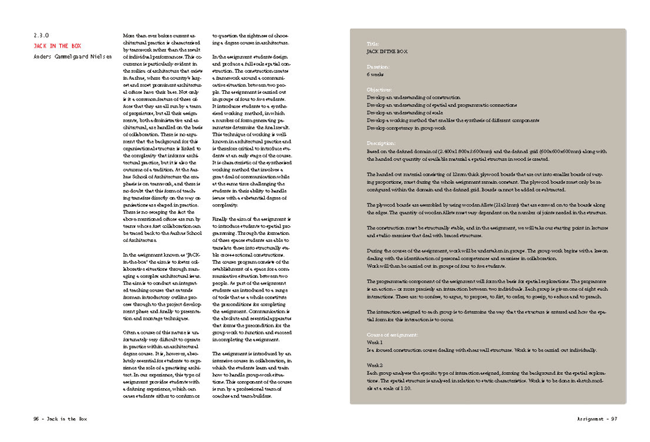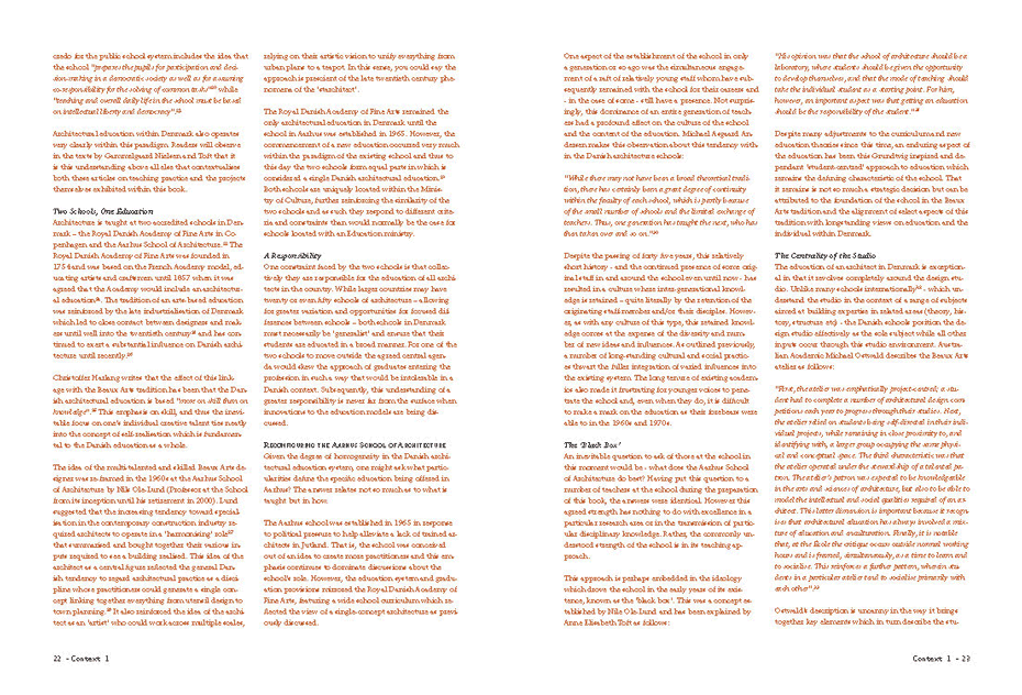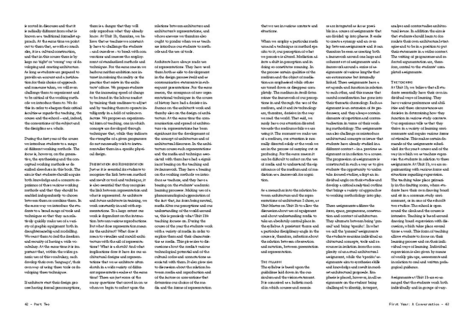In 2008 Torben Nielsen, the dean of the Aarhus School of Architecture, selected a group of academics from the school who had varying research interests and pedagogic approaches and tasked them with reviewing the School's education from top to bottom. The group was then asked to consider how the Bachelor degree might be reformed in light of a perceived dis-juncture between education, research and practice at the school and to start implementing these changes in the first year program. The first year education at the school has subsequently been rebuilt over the past three years, culminating in the complete test-drive of the new education in 2009-10. This book is a record of the context within which this occurred, the steps that led to the development of the new curriculum and of the work undertaken in that year.