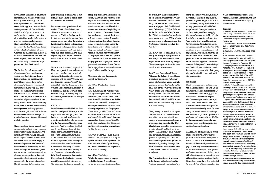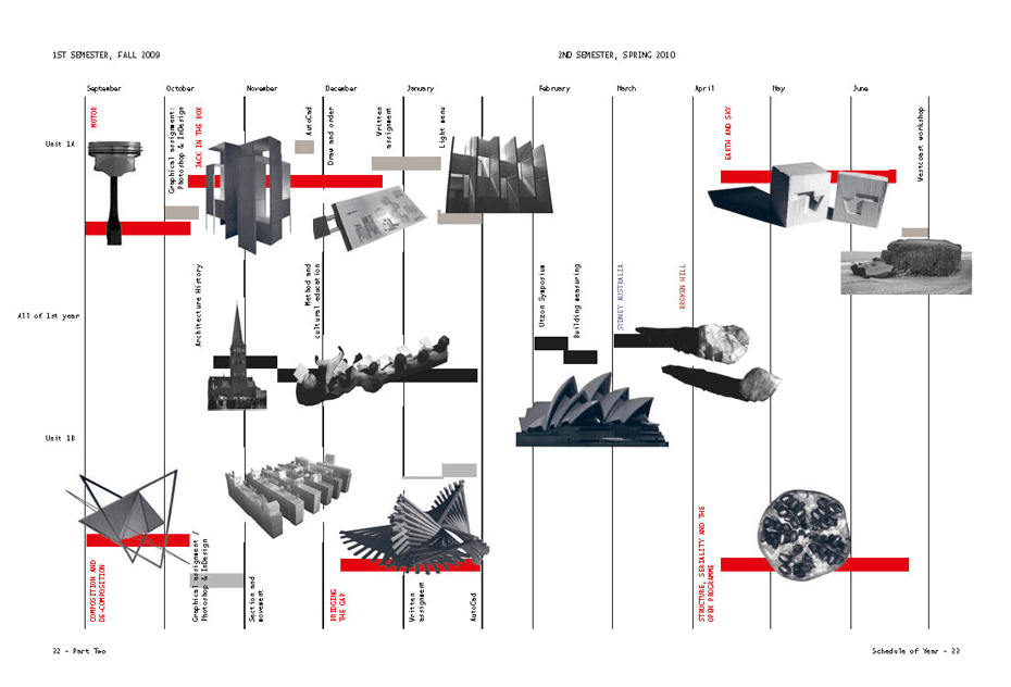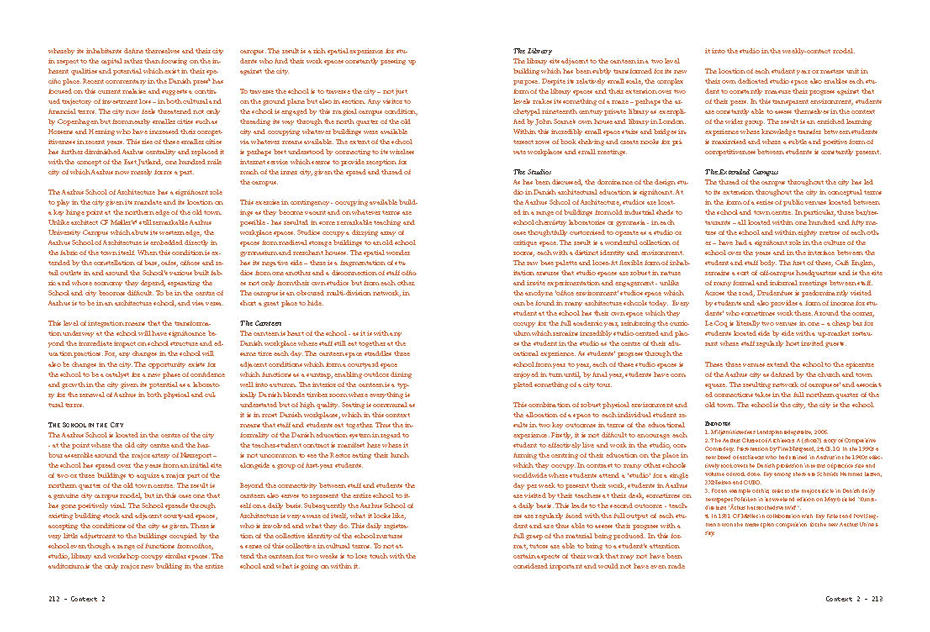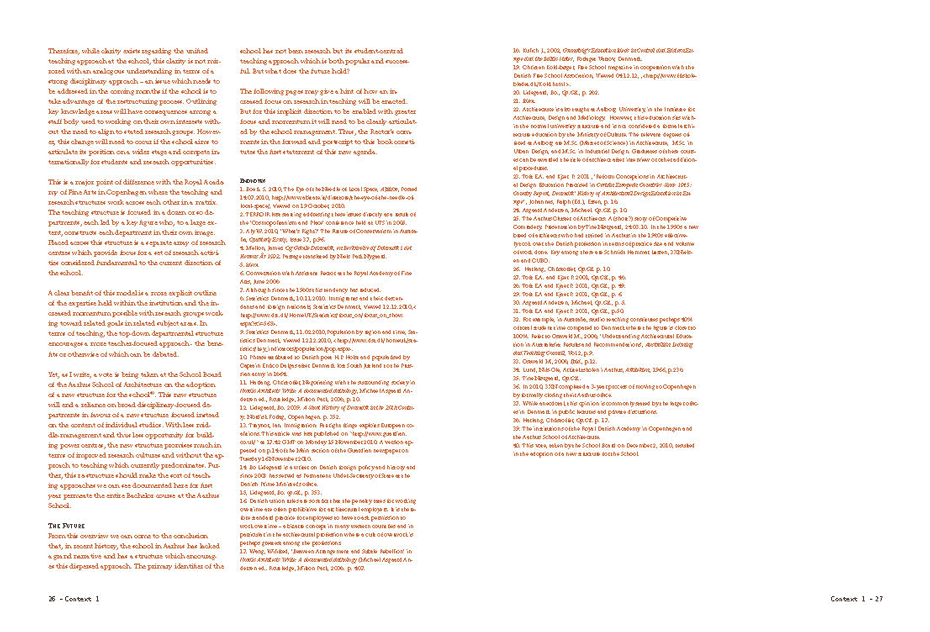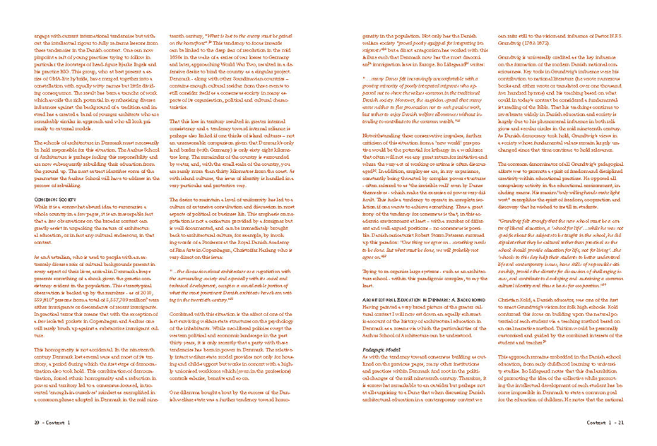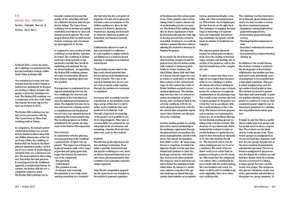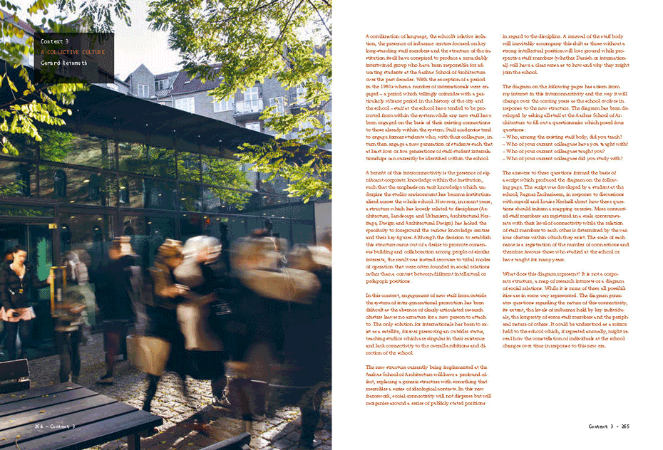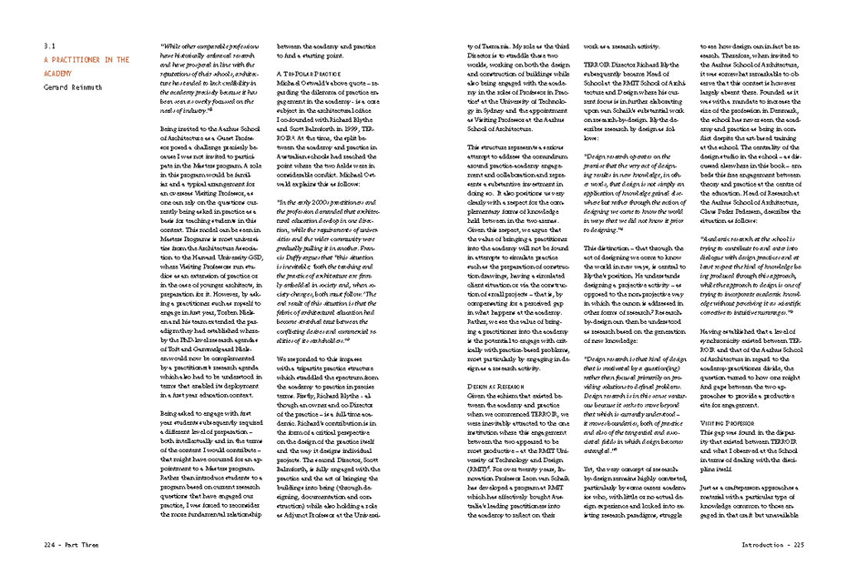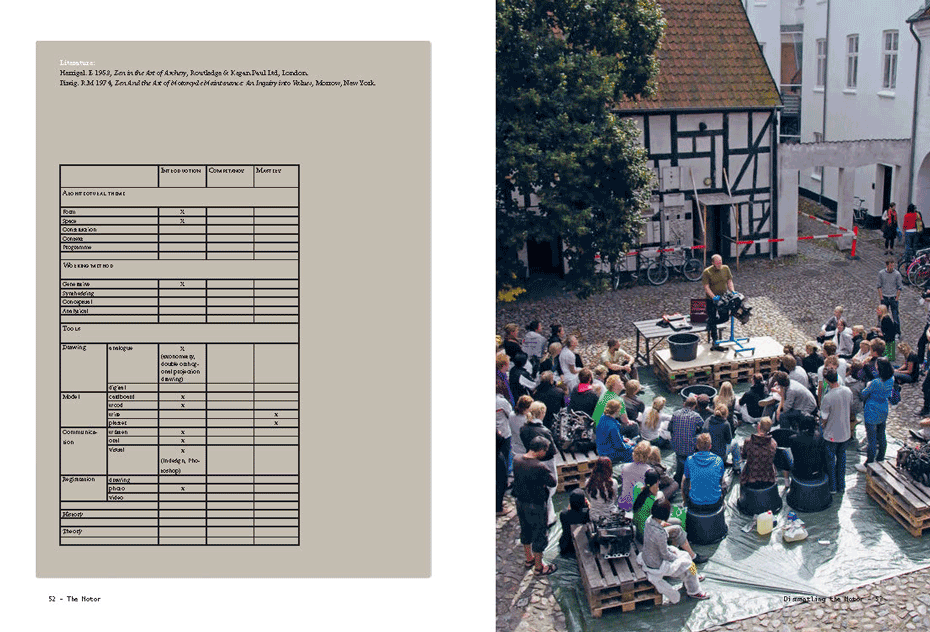 In 2008 Torben Nielsen, the dean of the Aarhus School of Architecture, selected a group of academics from the school who had varying research interests and pedagogic approaches and tasked them with reviewing the School's education from top to bottom. The group was then asked to consider how the Bachelor degree might be reformed in light of a perceived dis-juncture between education, research and practice at the school and to start implementing these changes in the first year program. The first year education at the school has subsequently been rebuilt over the past three years, culminating in the complete test-drive of the new education in 2009-10. This book is a record of the context within which this occurred, the steps that led to the development of the new curriculum and of the work undertaken in that year.