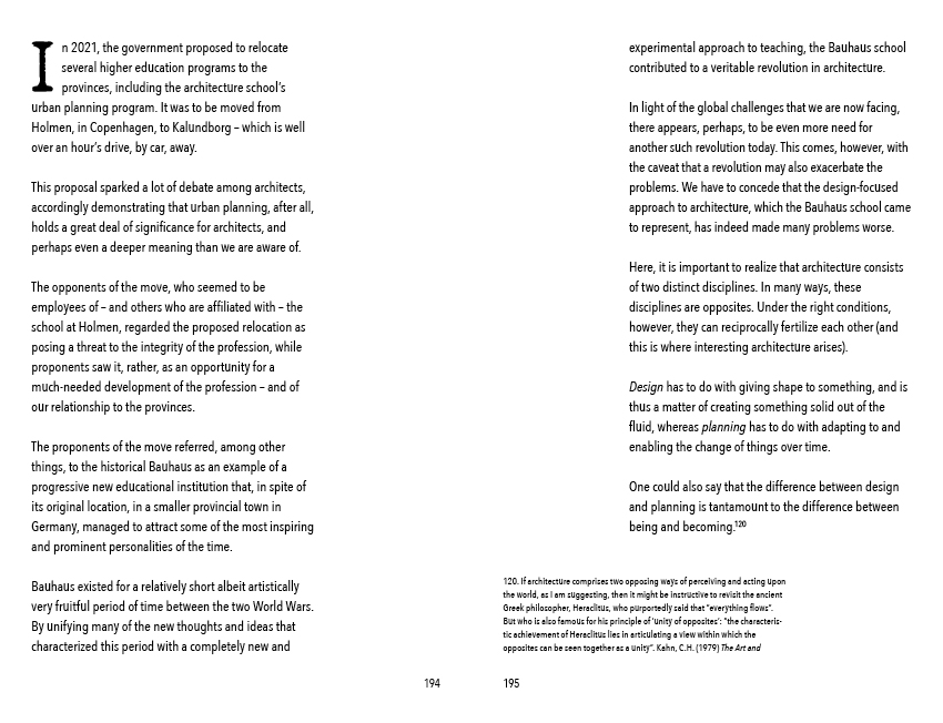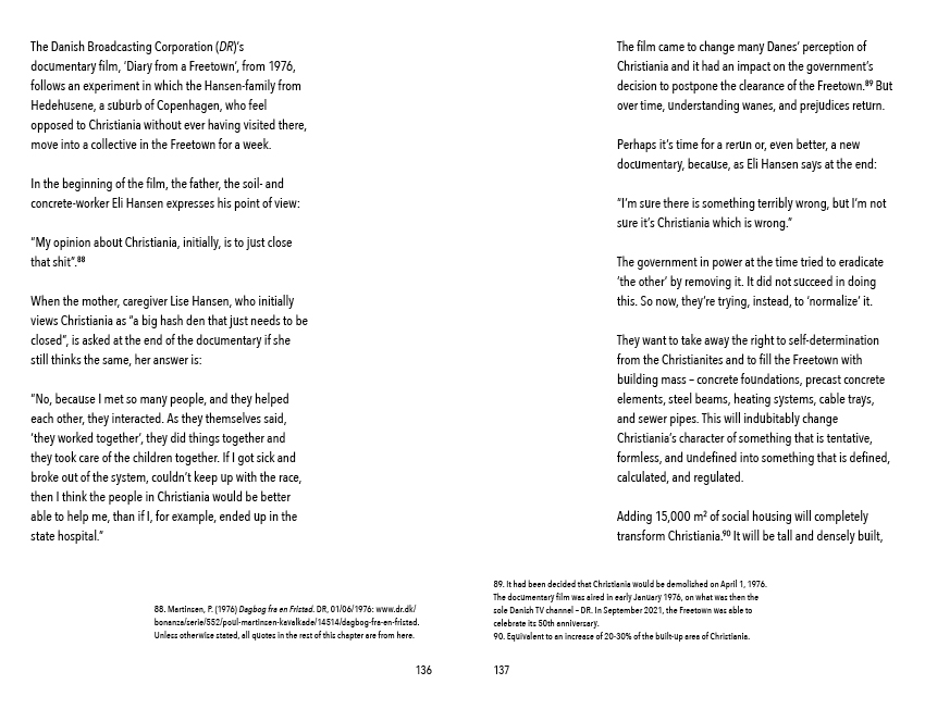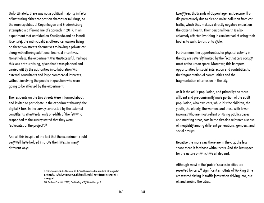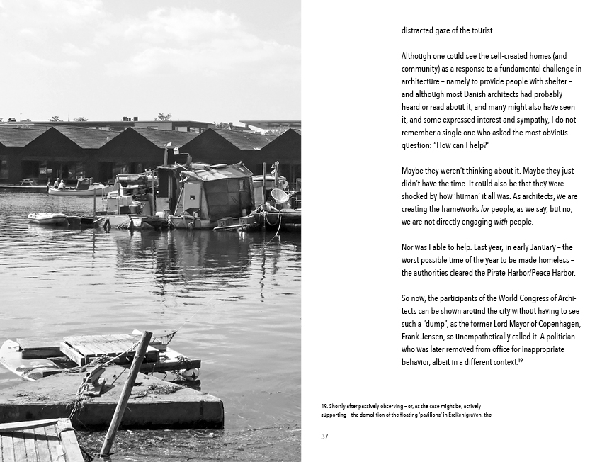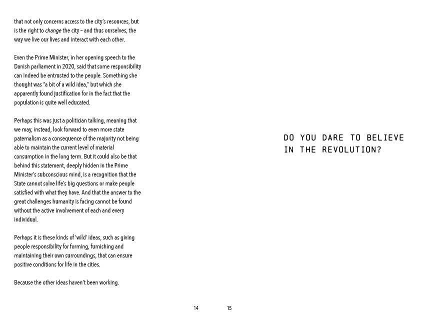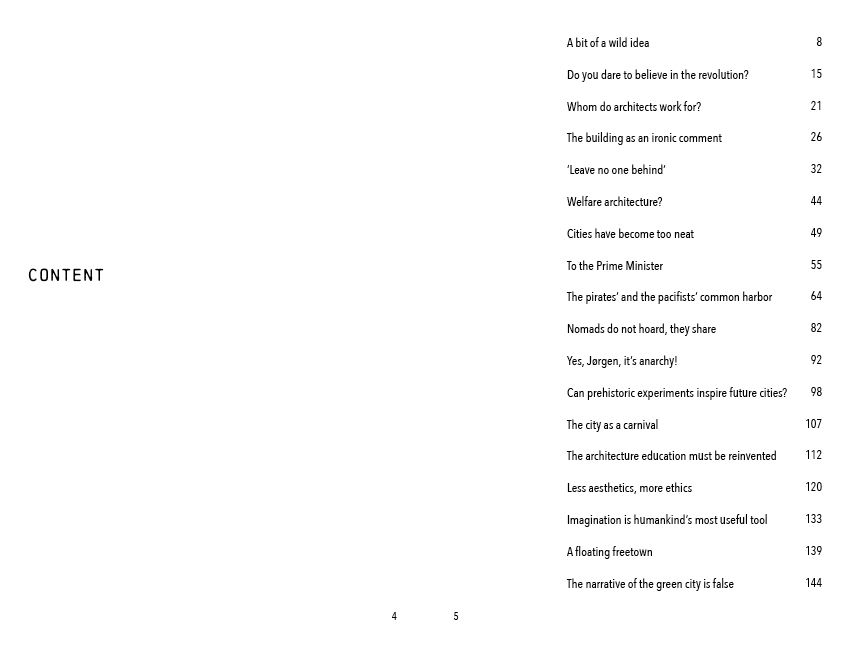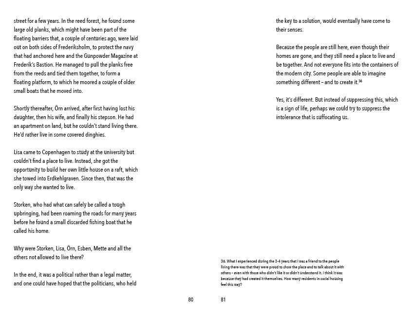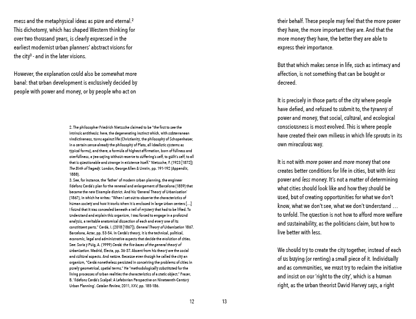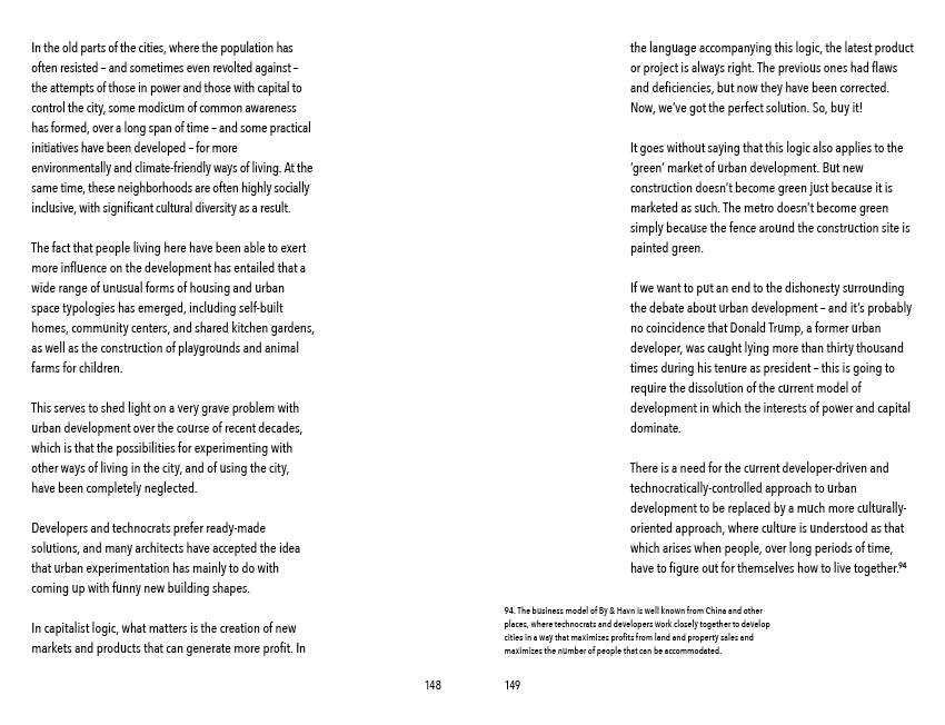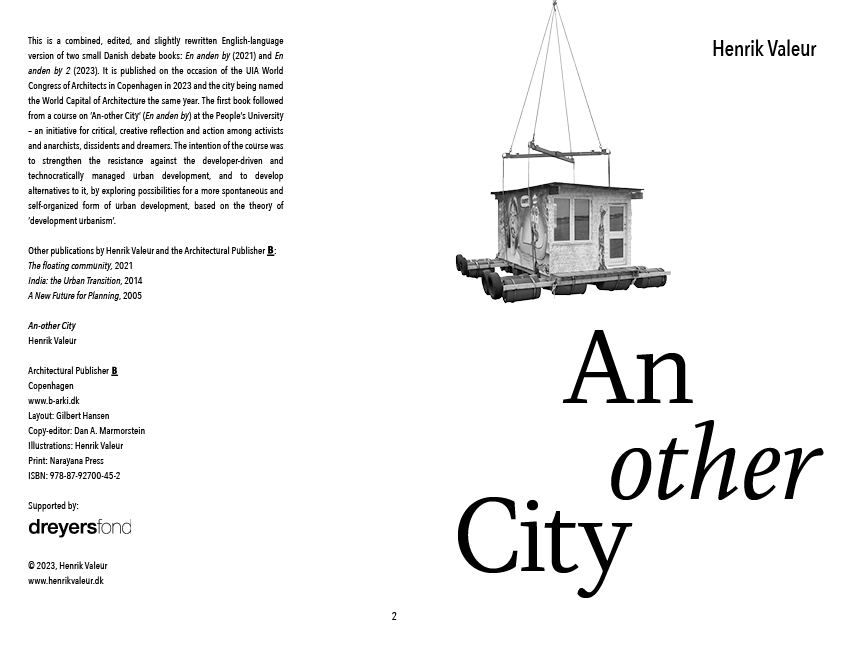 The book is a combined, edited, and slightly rewritten English-language version of two small Danish debate books: En anden by (2021) and En anden by 2 (2023). It is published on the occasion of the UIA World Congress of Architects in Copenhagen in 2023 and the city being named the World Capital of Architecture the same year. The first book followed from a course on ‘An-other City’ (En anden by) at the People’s University – an initiative for critical, creative reflection and action among activists and anarchists, dissidents and dreamers. The intention of the course was to strengthen the resistance against the developer-driven and technocratically managed urban development, and to develop alternatives to it, by exploring possibilities for a more spontaneous and self-organized form of urban development, based on the theory of ‘development urbanism’.
