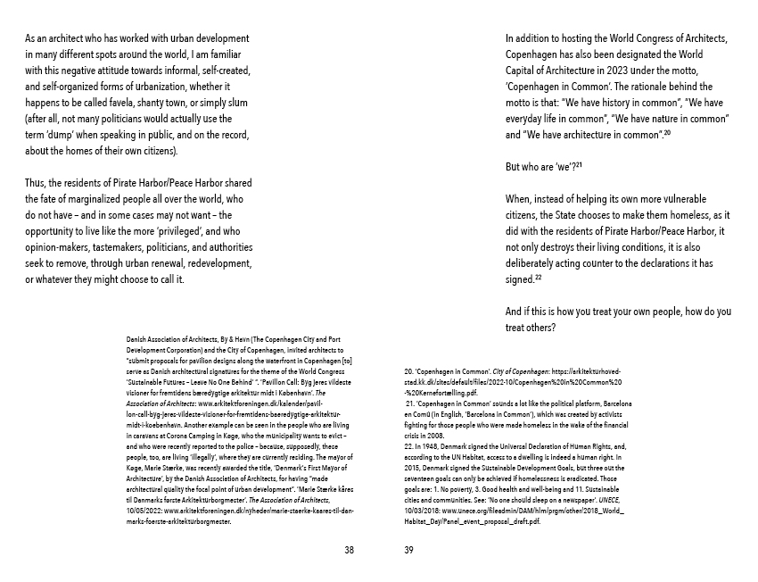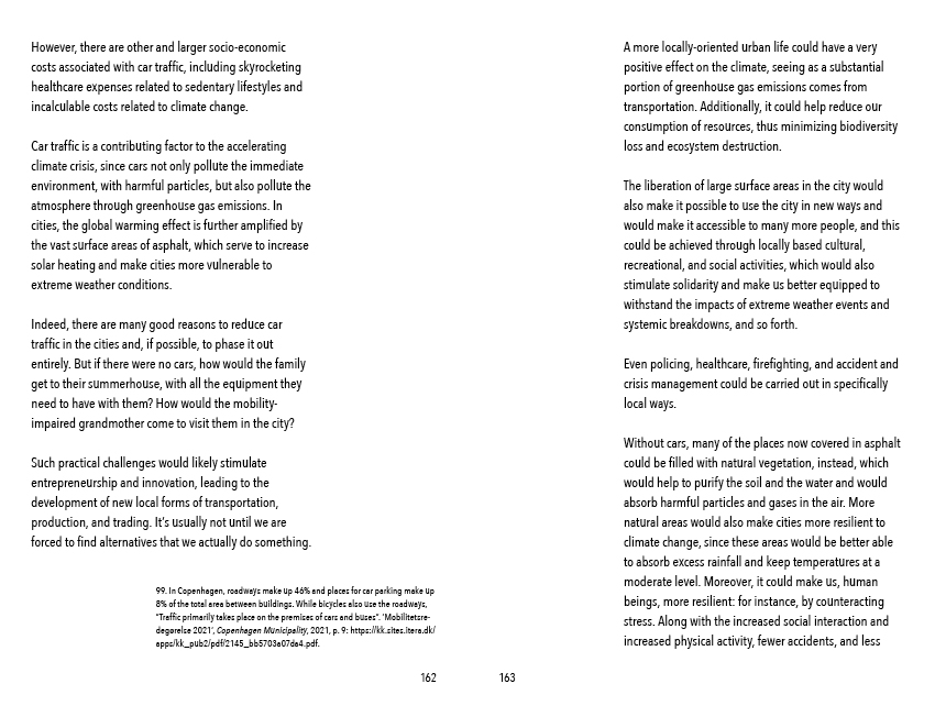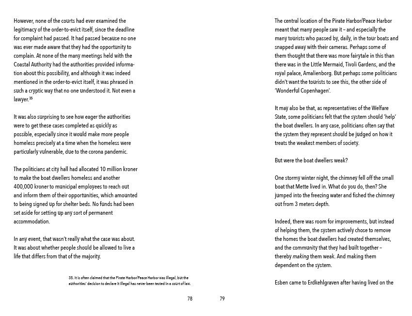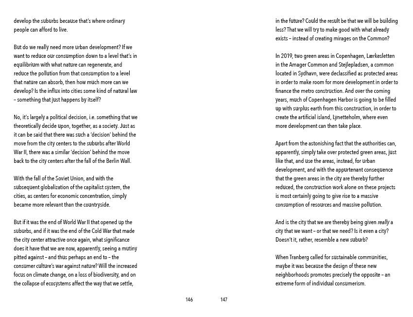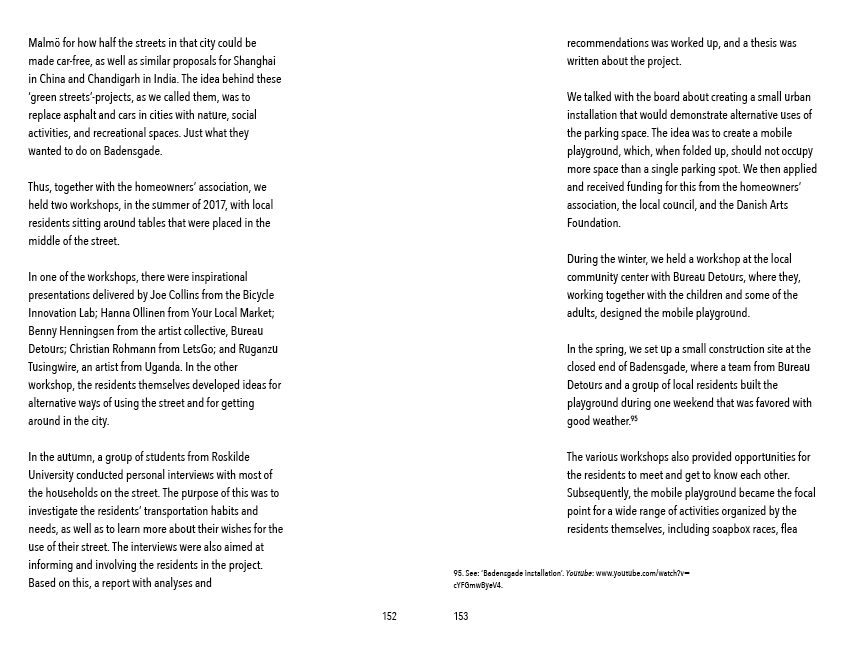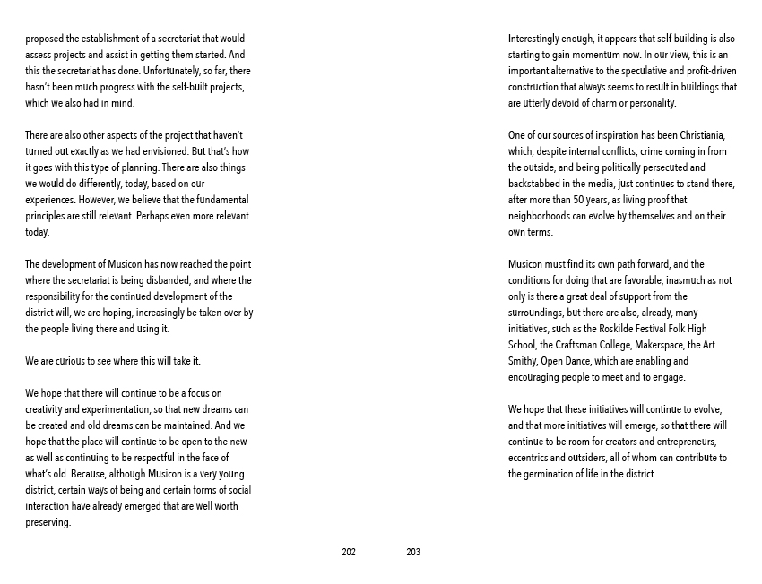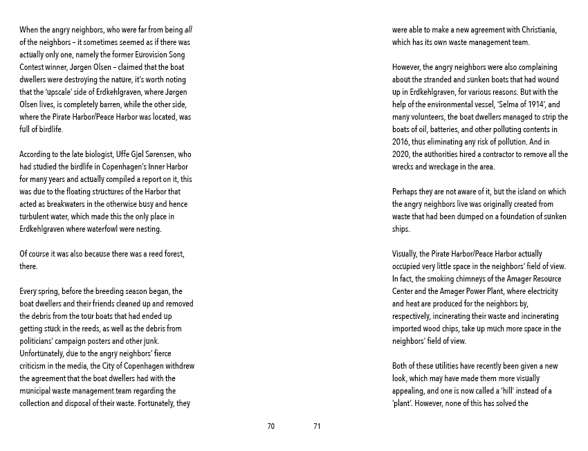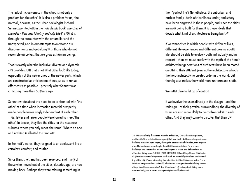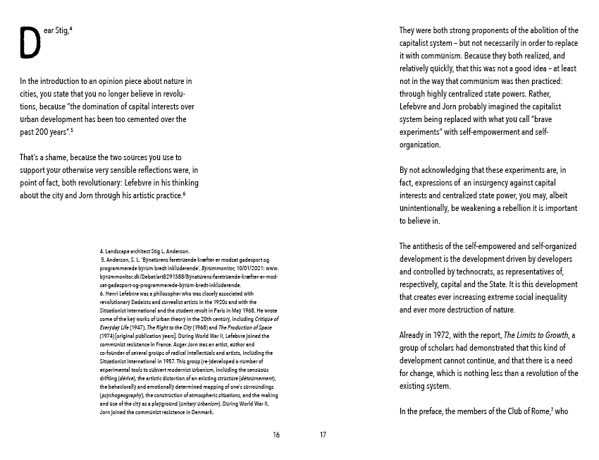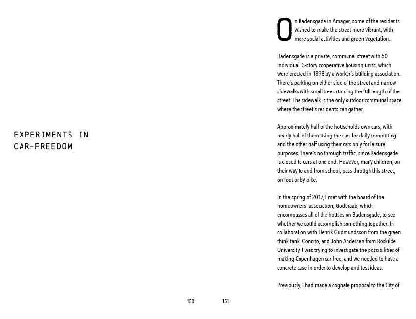 The book is a combined, edited, and slightly rewritten English-language version of two small Danish debate books: En anden by (2021) and En anden by 2 (2023). It is published on the occasion of the UIA World Congress of Architects in Copenhagen in 2023 and the city being named the World Capital of Architecture the same year. The first book followed from a course on ‘An-other City’ (En anden by) at the People’s University – an initiative for critical, creative reflection and action among activists and anarchists, dissidents and dreamers. The intention of the course was to strengthen the resistance against the developer-driven and technocratically managed urban development, and to develop alternatives to it, by exploring possibilities for a more spontaneous and self-organized form of urban development, based on the theory of ‘development urbanism’.