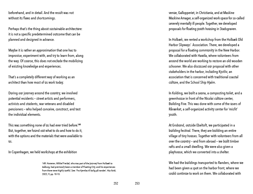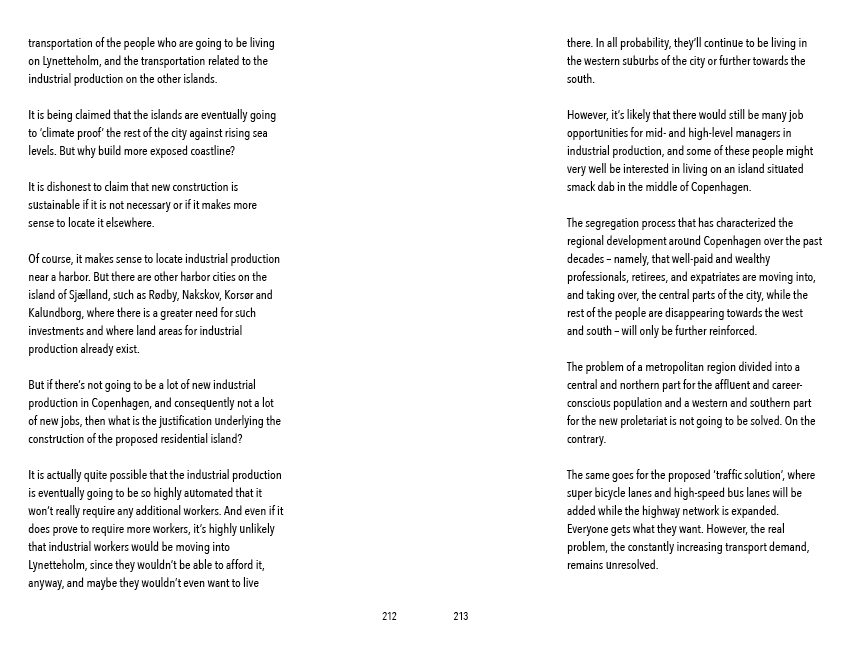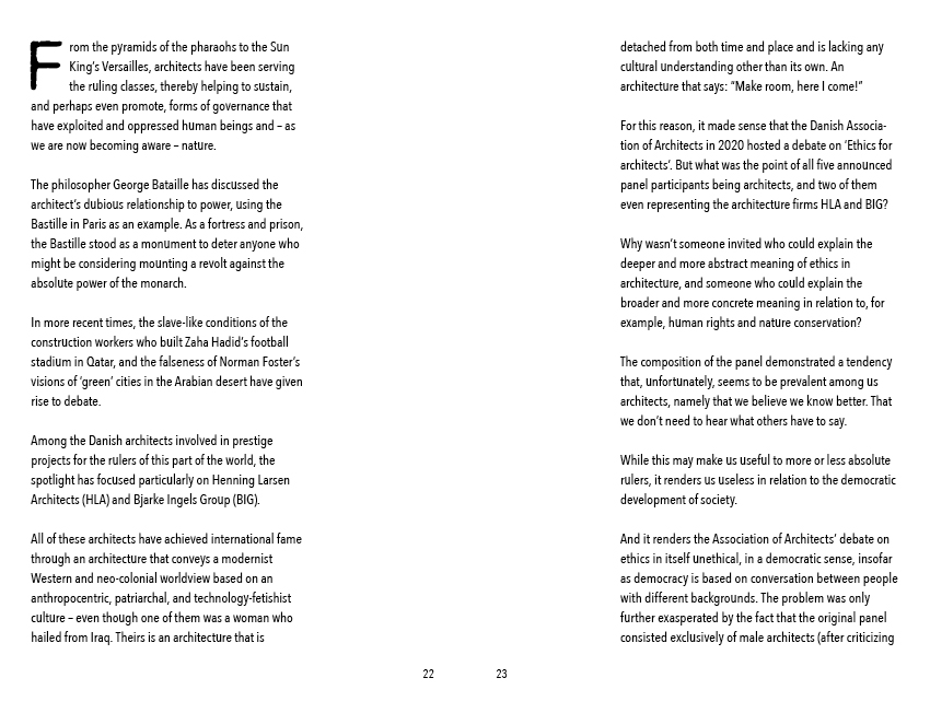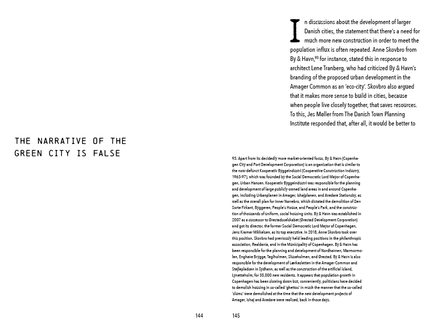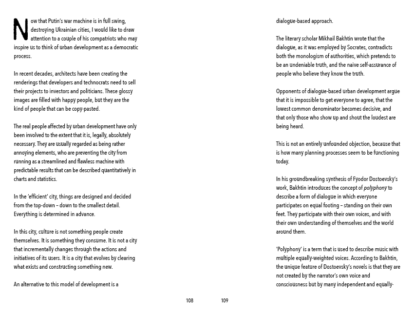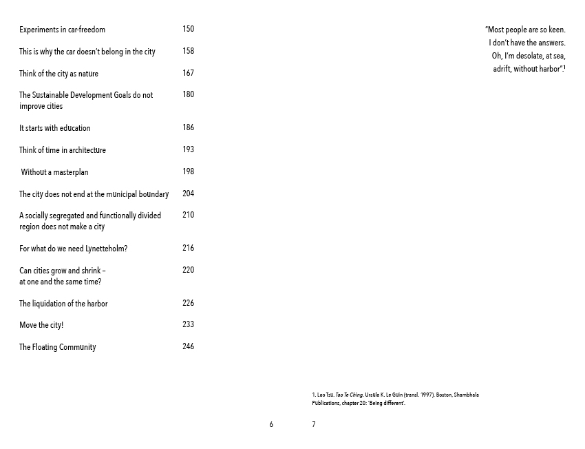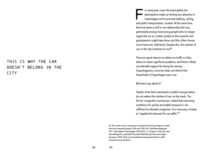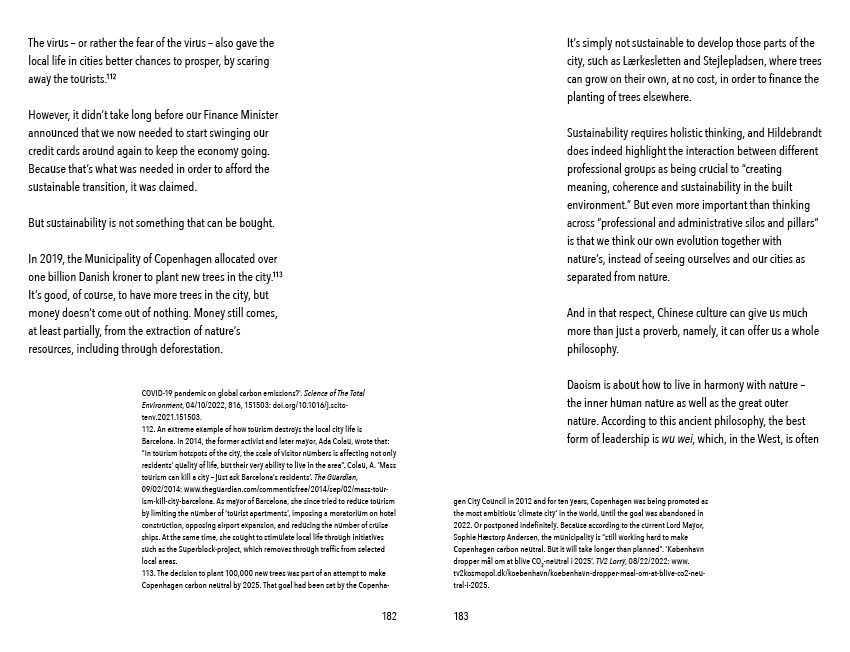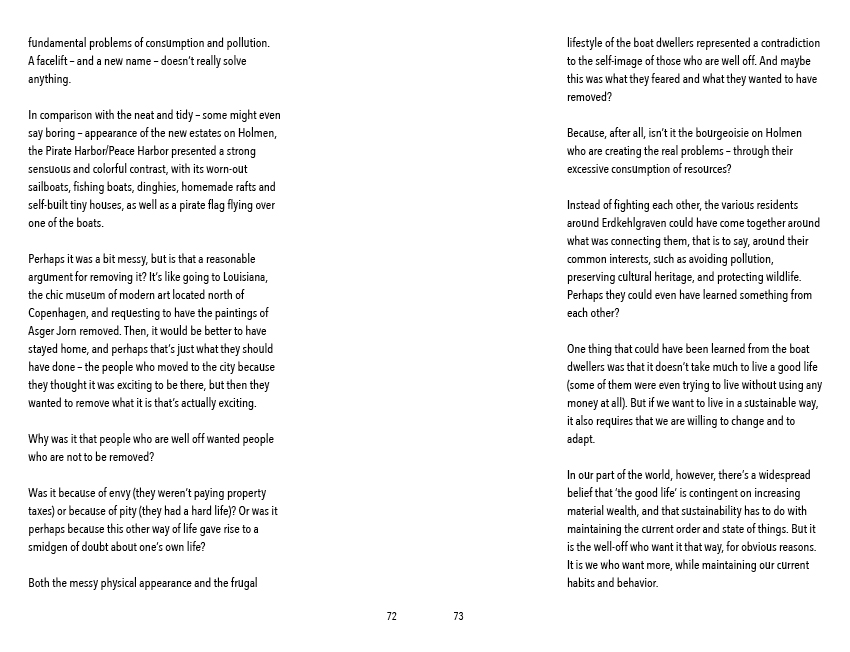 The book is a combined, edited, and slightly rewritten English-language version of two small Danish debate books: En anden by (2021) and En anden by 2 (2023). It is published on the occasion of the UIA World Congress of Architects in Copenhagen in 2023 and the city being named the World Capital of Architecture the same year. The first book followed from a course on ‘An-other City’ (En anden by) at the People’s University – an initiative for critical, creative reflection and action among activists and anarchists, dissidents and dreamers. The intention of the course was to strengthen the resistance against the developer-driven and technocratically managed urban development, and to develop alternatives to it, by exploring possibilities for a more spontaneous and self-organized form of urban development, based on the theory of ‘development urbanism’.