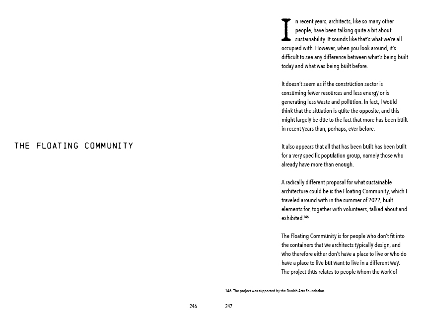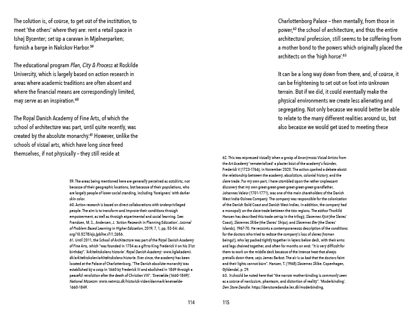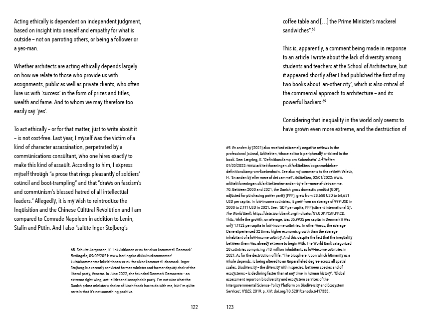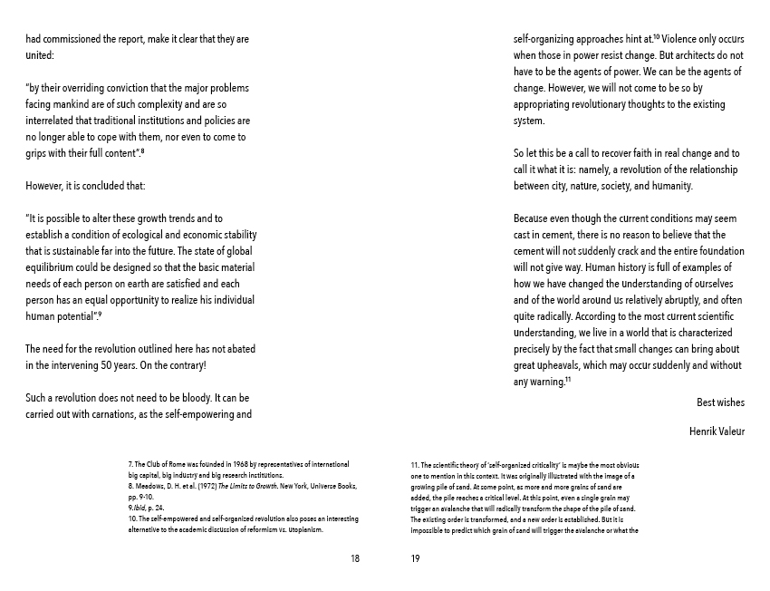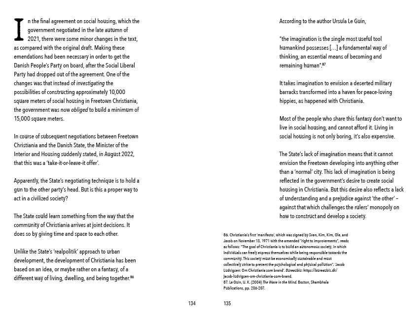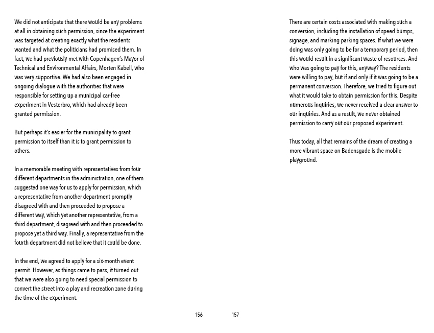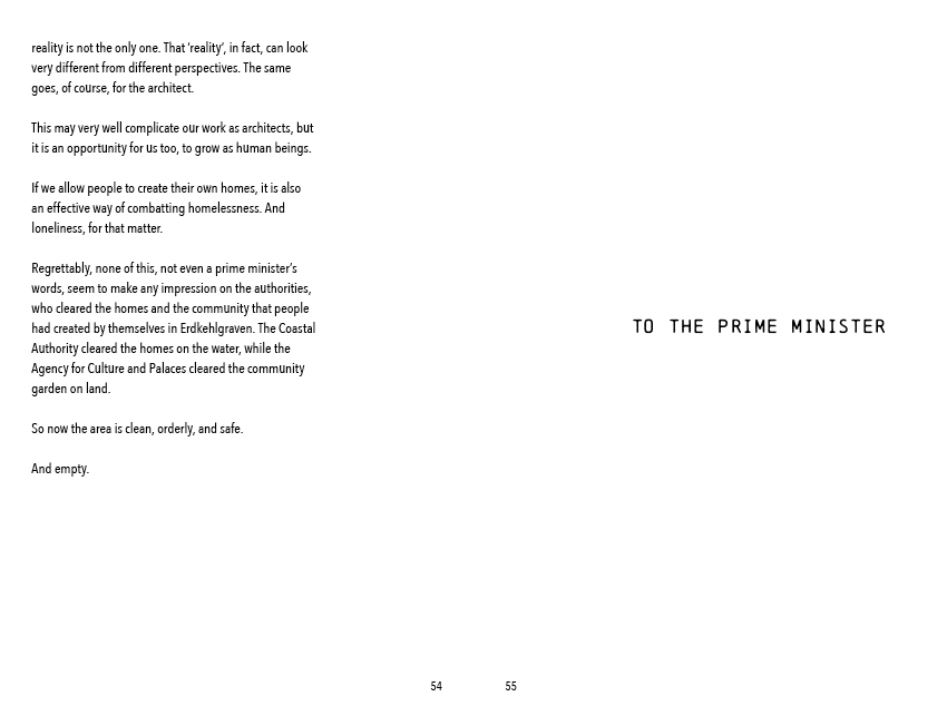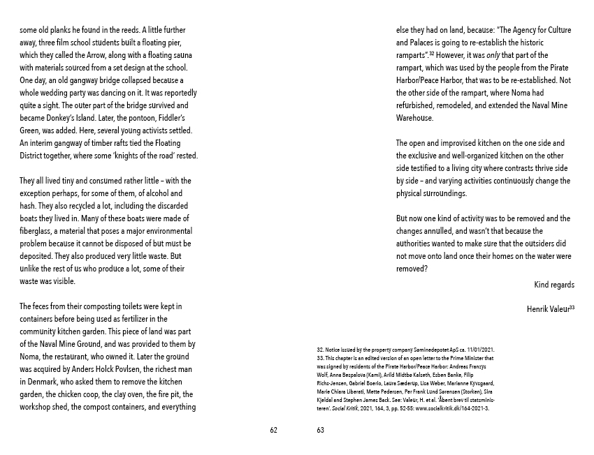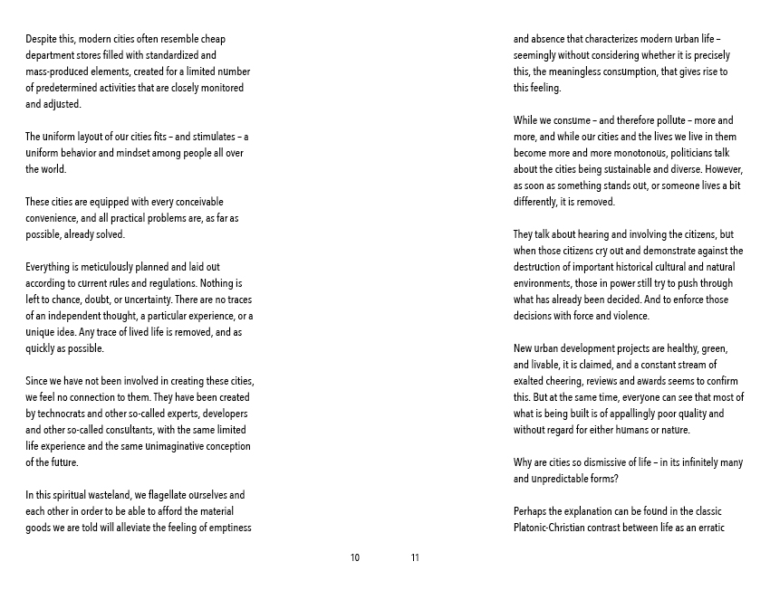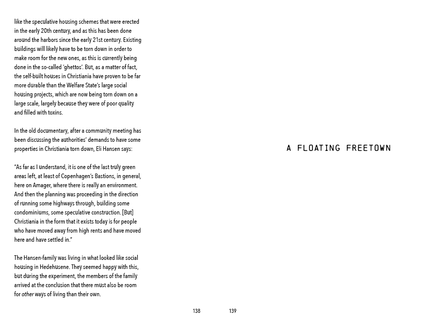 The book is a combined, edited, and slightly rewritten English-language version of two small Danish debate books: En anden by (2021) and En anden by 2 (2023). It is published on the occasion of the UIA World Congress of Architects in Copenhagen in 2023 and the city being named the World Capital of Architecture the same year. The first book followed from a course on ‘An-other City’ (En anden by) at the People’s University – an initiative for critical, creative reflection and action among activists and anarchists, dissidents and dreamers. The intention of the course was to strengthen the resistance against the developer-driven and technocratically managed urban development, and to develop alternatives to it, by exploring possibilities for a more spontaneous and self-organized form of urban development, based on the theory of ‘development urbanism’.