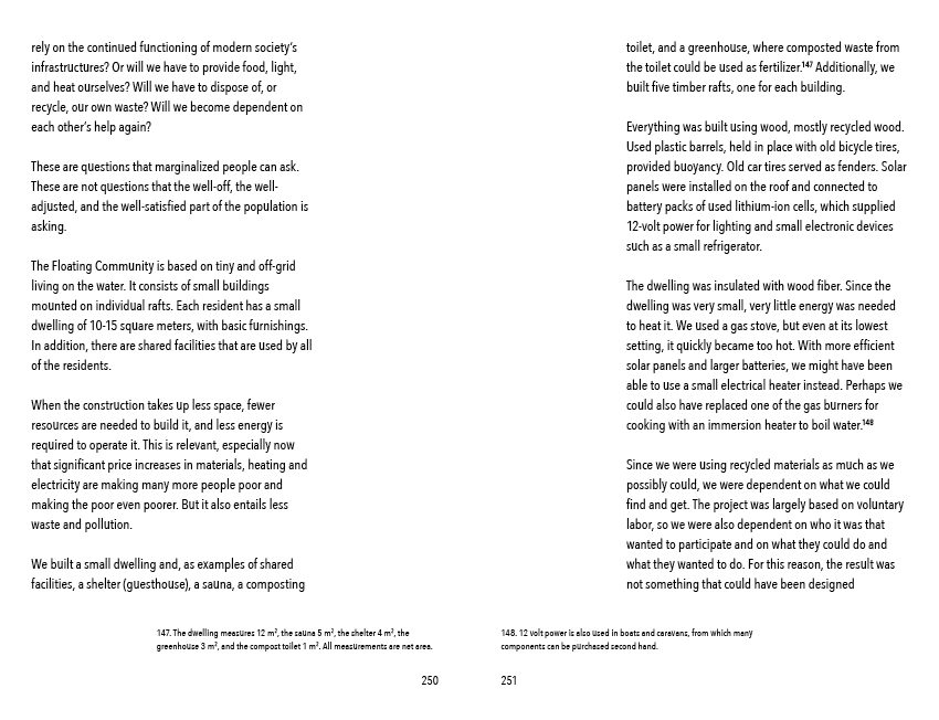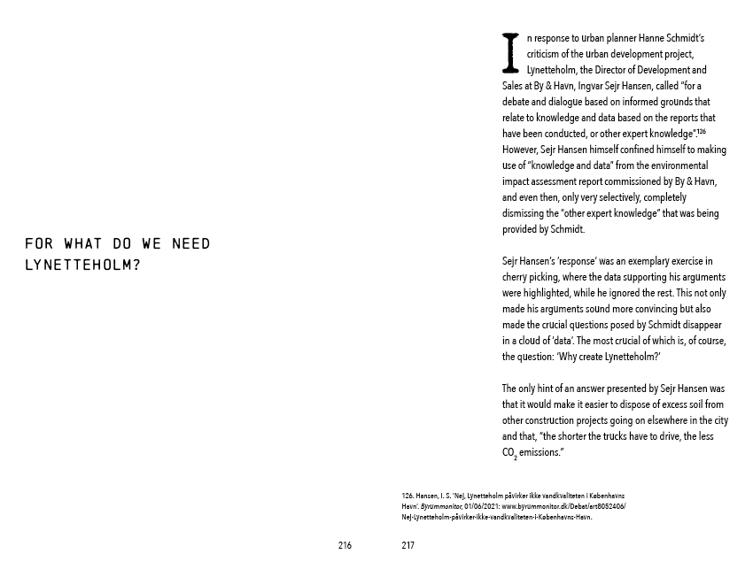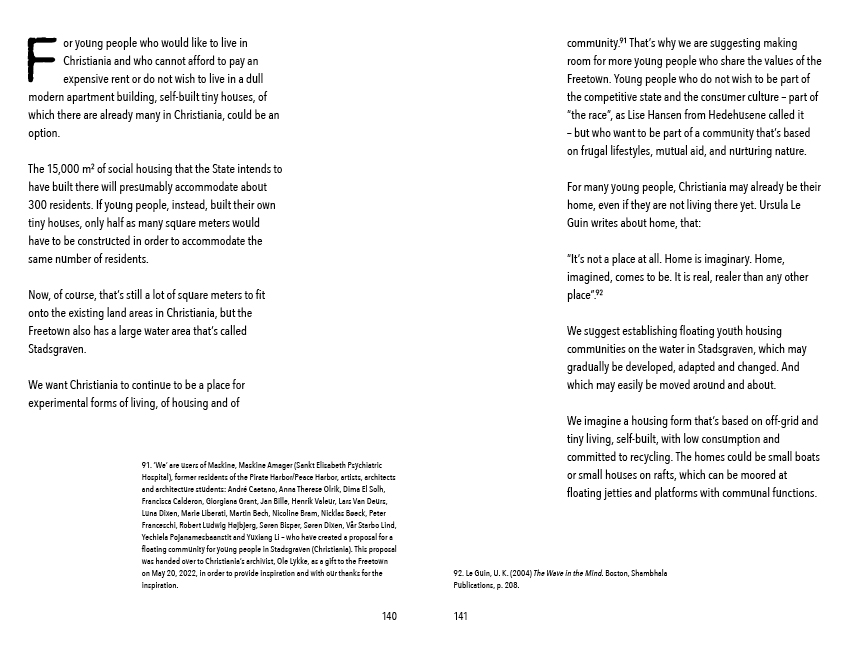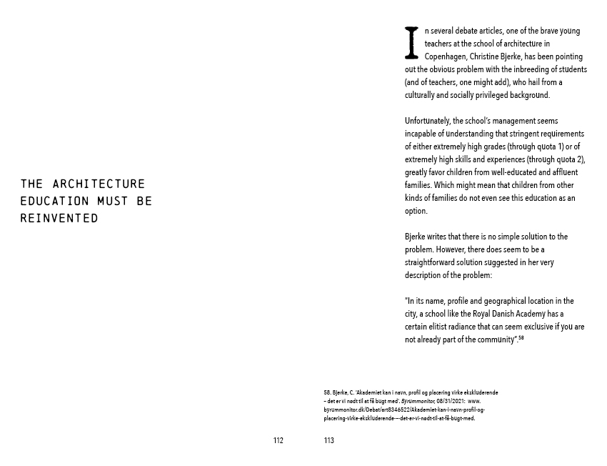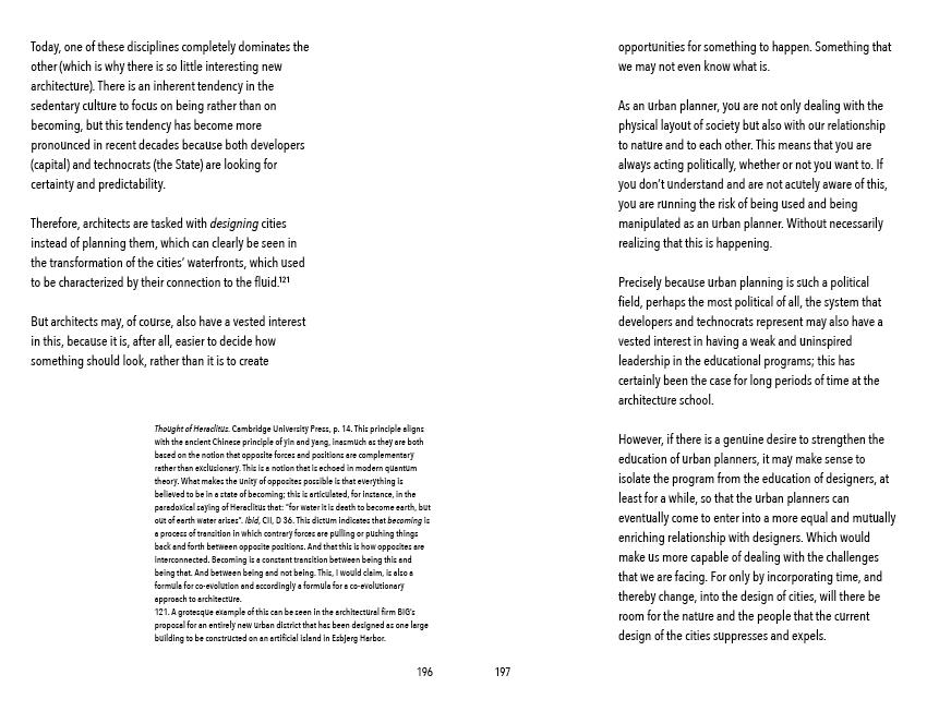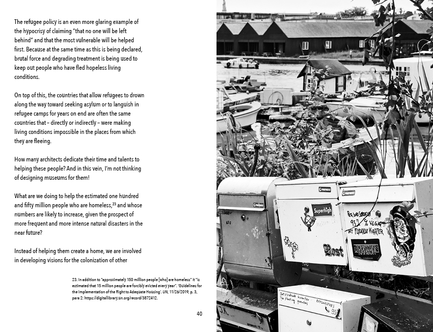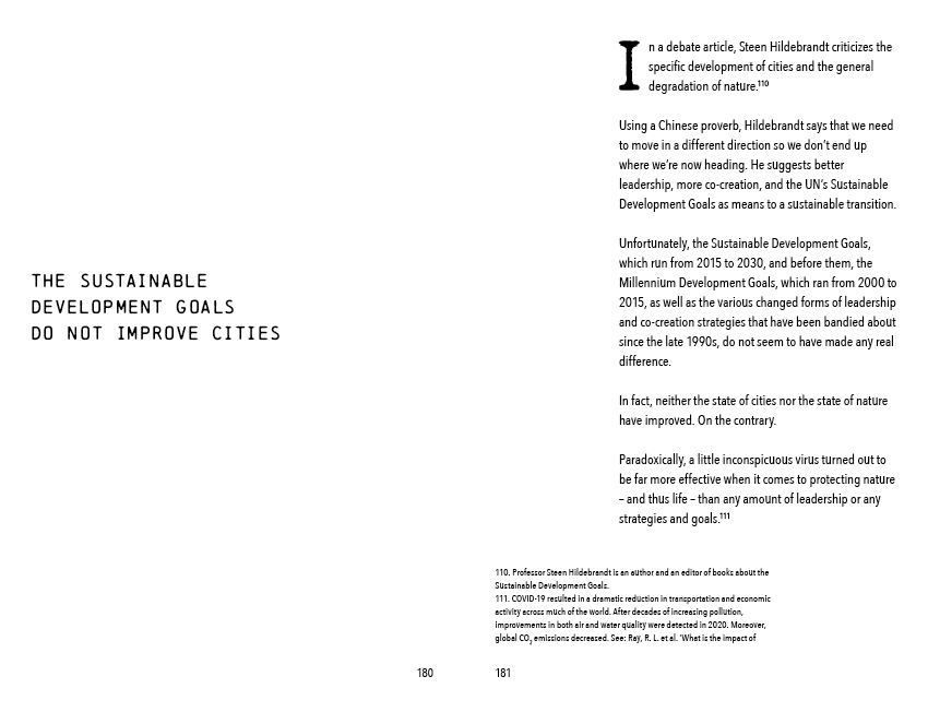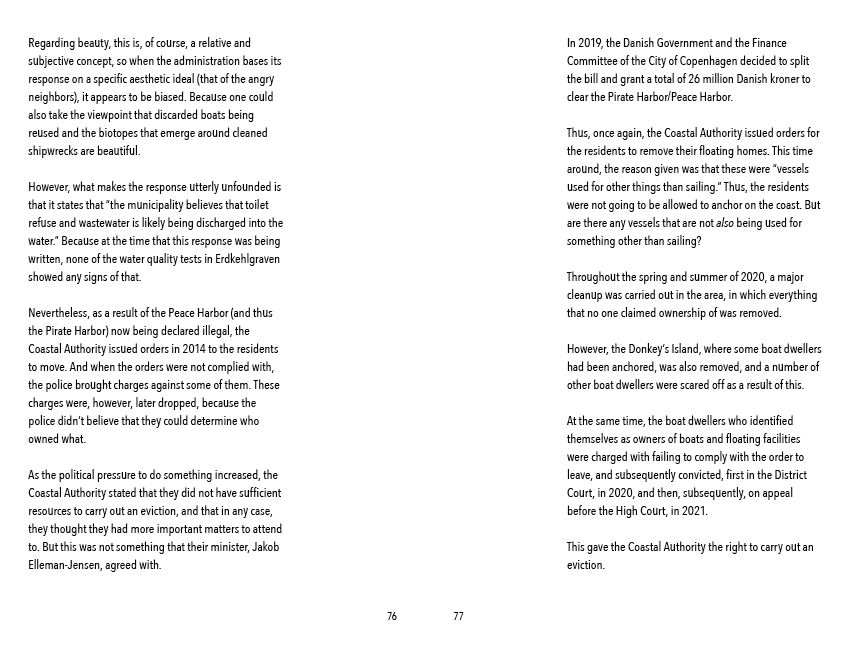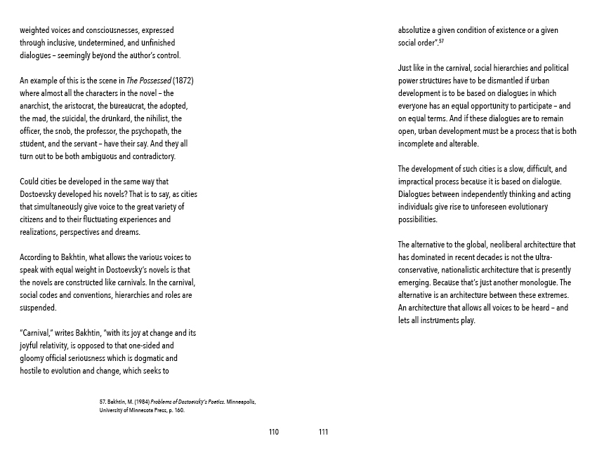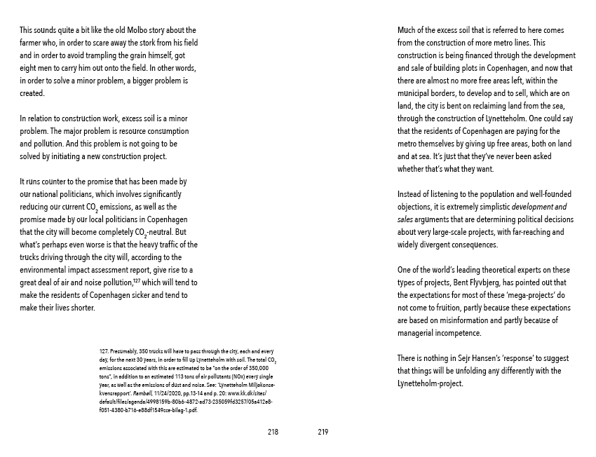 The book is a combined, edited, and slightly rewritten English-language version of two small Danish debate books: En anden by (2021) and En anden by 2 (2023). It is published on the occasion of the UIA World Congress of Architects in Copenhagen in 2023 and the city being named the World Capital of Architecture the same year. The first book followed from a course on ‘An-other City’ (En anden by) at the People’s University – an initiative for critical, creative reflection and action among activists and anarchists, dissidents and dreamers. The intention of the course was to strengthen the resistance against the developer-driven and technocratically managed urban development, and to develop alternatives to it, by exploring possibilities for a more spontaneous and self-organized form of urban development, based on the theory of ‘development urbanism’.
