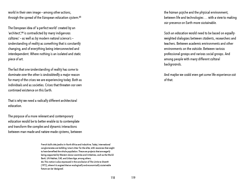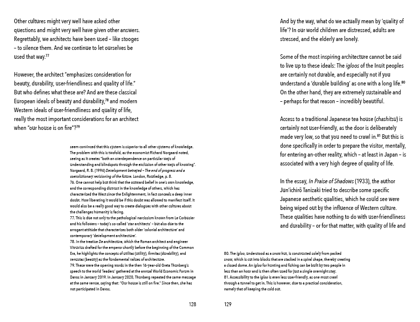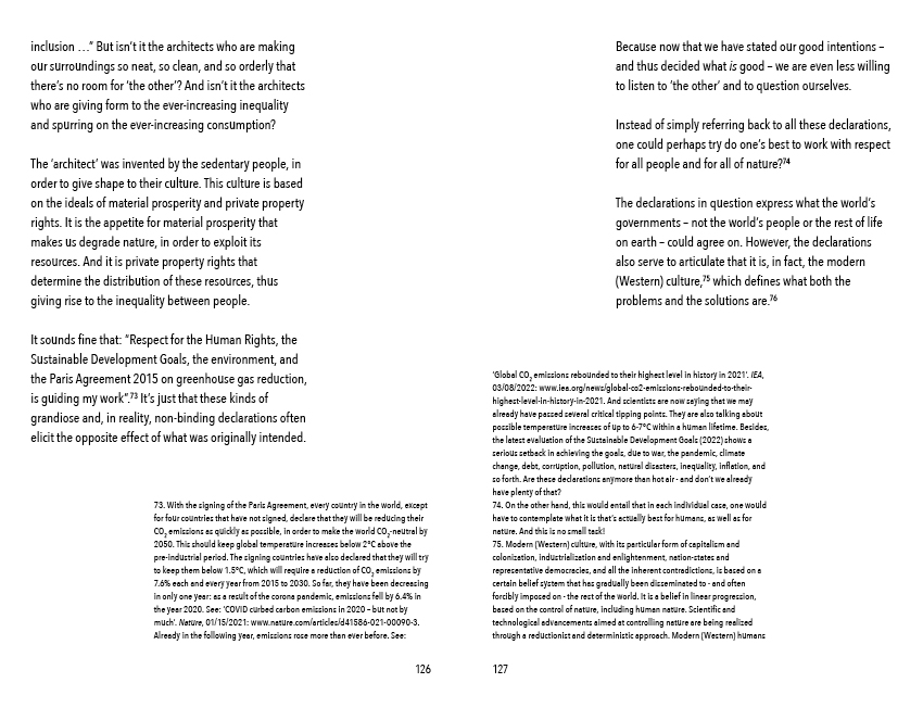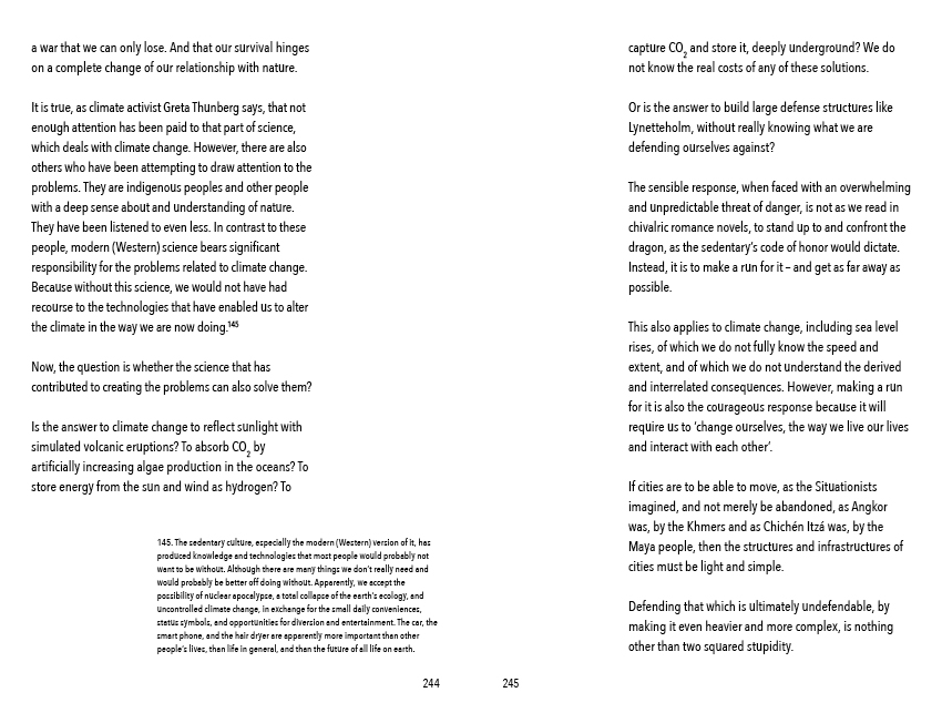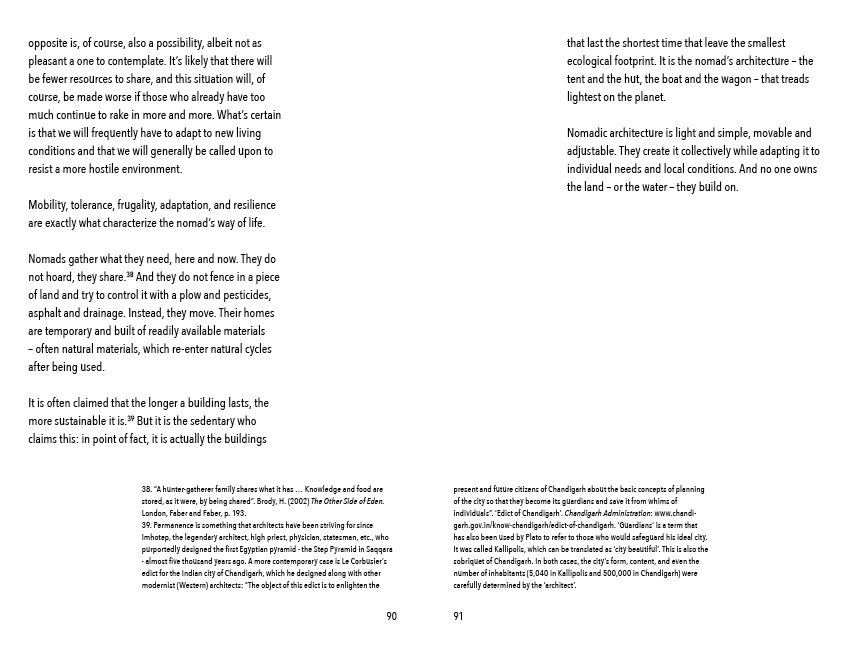 The modern city is the most significant expression of modern (Western) culture, which has its roots in the sedentary’s ideals of material prosperity and private property rights. And in the notion that nature can be controlled. It is this culture that engenders the extreme global inequality and the catastrophic destruction of nature. Does the culture that creates the problems also have the answers? The architect is the sedentary’s invention. Do architects have any credible answers?