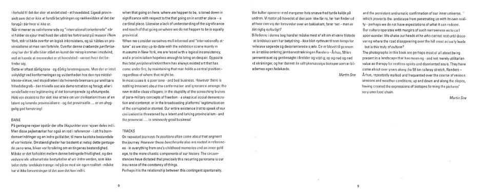 "The photographs in this book are perhaps most of all about a presence in a landscape which has significance - and not merely utilitarian value as therapy for restless spirit and disoriented souls. They have come into being over years along the railway stretch Randers - Århus, 58 km trekked and re-trekked during the course of various seasons and weather conditions; up and down embankments , and have formed expressions of biotopes that are images own food chain.(...)