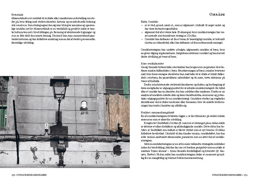 Gennem casestudierne udvikles 5 strategiske redskaber, Akupunktur, Parallelitet, Mnemoteknik, Område samt Performativitet, som konkrete værktøjer til fremtidssikring af byens rum.