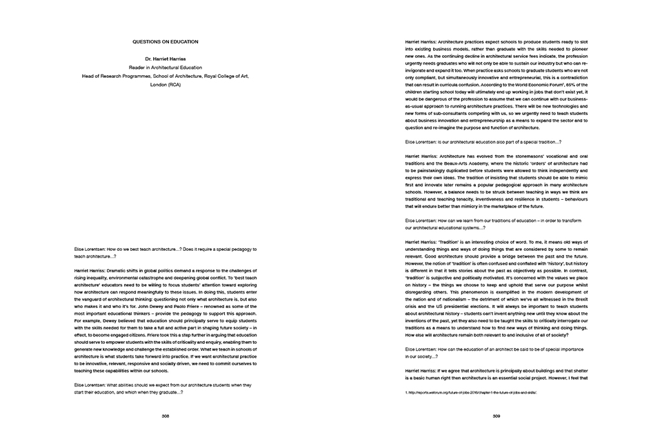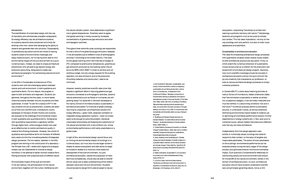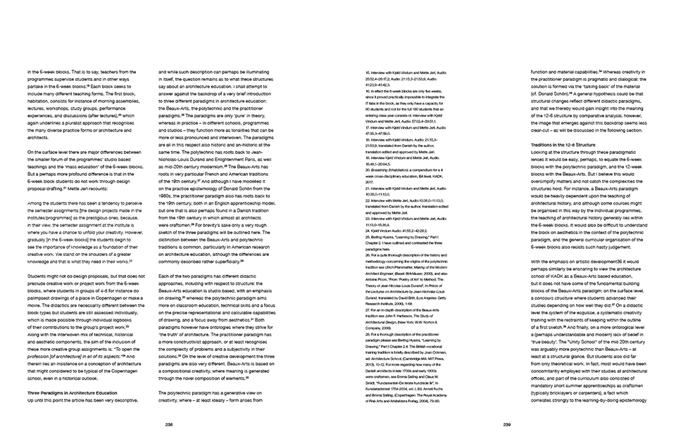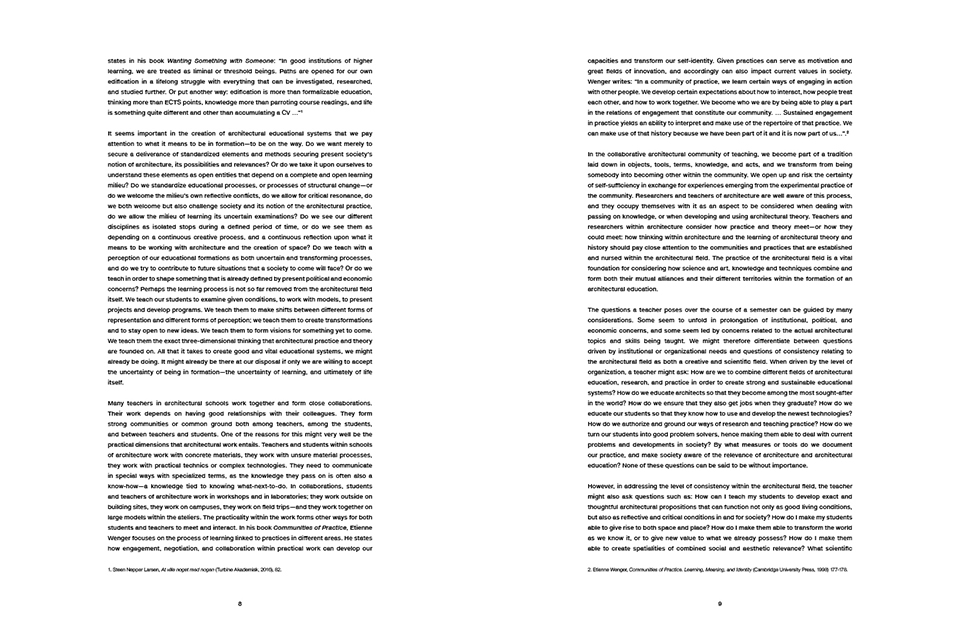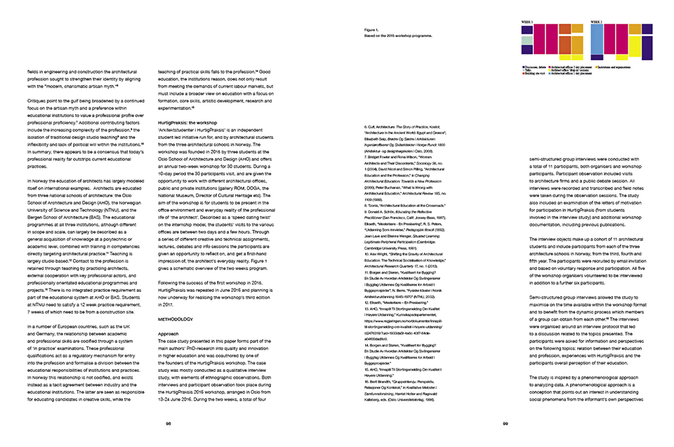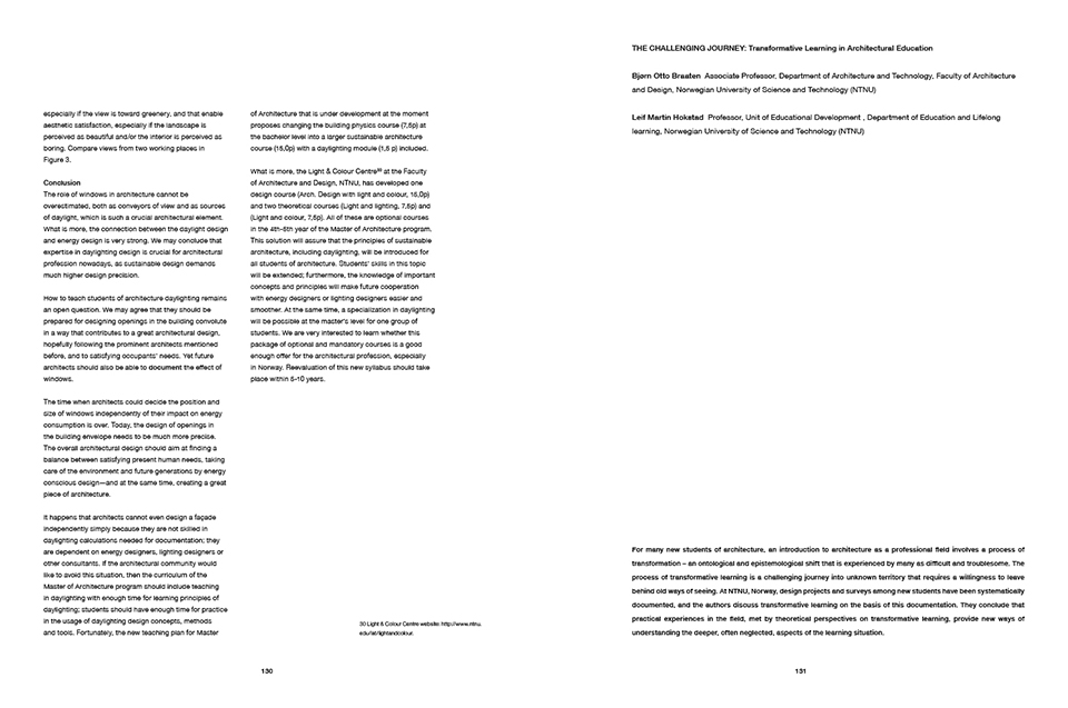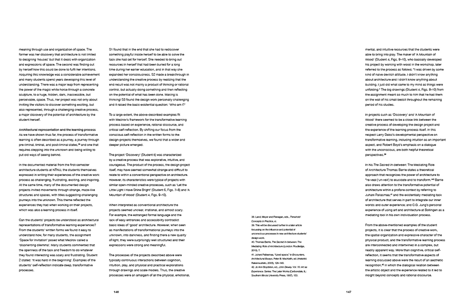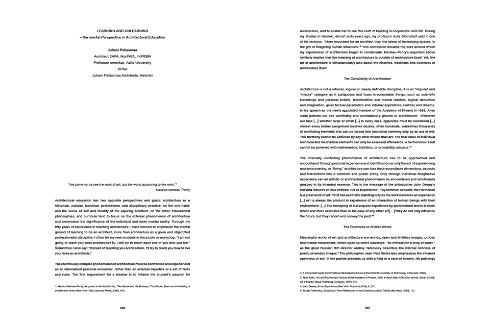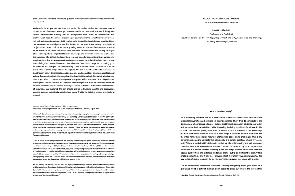 Additionally, there are 5 articles/interviews with international architects, such as Juhani Pallasmaa, William J.R. Curtis, Harriet Harriss, Harald Røstvik and Veronika Valk-Siske, who give their view on teaching architecture.