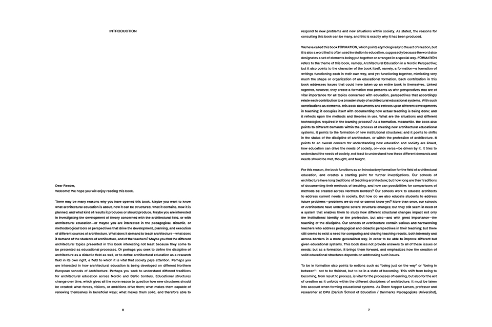 Formation – Architectural Education in a Nordic Perspective is a joint venture of 17 Schools of Architecture in the Nordic and Baltic countries, showing what architectural education is about, how it can be structured, what it contains, how it is planned, and what kind of results it produces or should produce. What does it demand to teach architecture—what does it demand of the students of architecture, and of the teachers? Different architectural topics are presented and educational processes shown, together with works of the students.