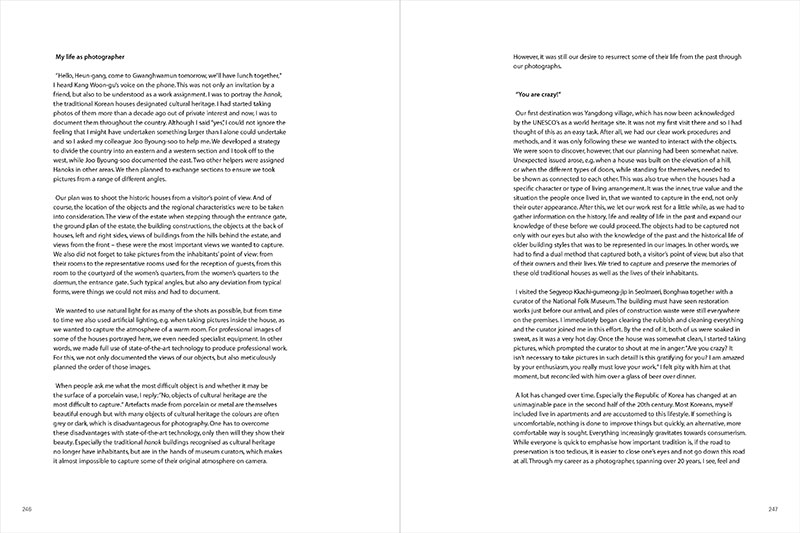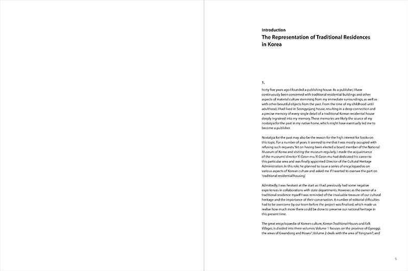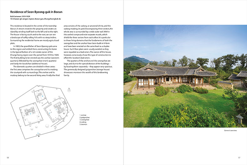 The book gives an overview of the traditional Korean residential house, the Hanok, meaning a ”traditional house”. The Korean hanok style is uniquely different from a Japanese or Western building style, since it was built according to the needs of the country’s very distinct four seasons, with an open veranda for the very warm, humid summers and an under floor heating-system for the harsh, cold winters. With the oldest hanok dating back to 1450 and the most recent built in 1947, the book presents a range of traditional Korean houses over a period of 700 years.