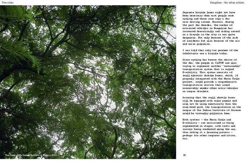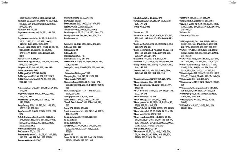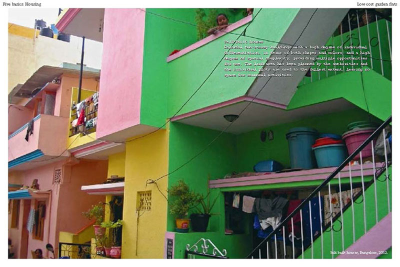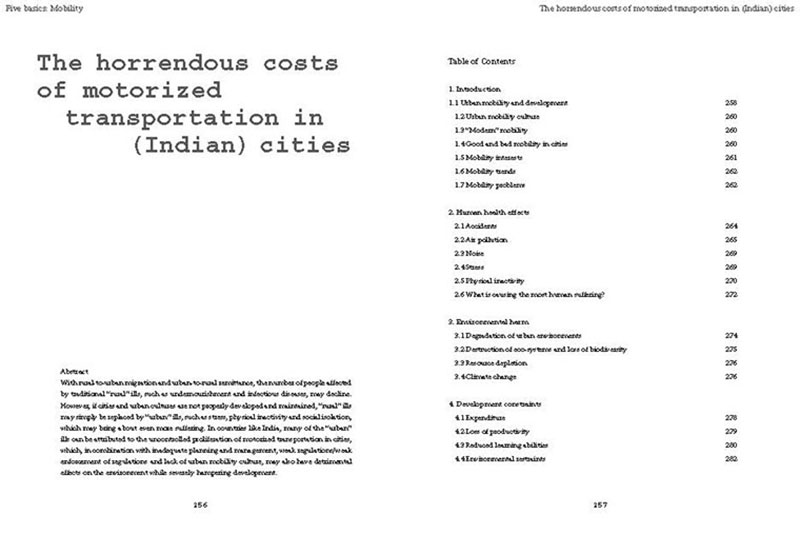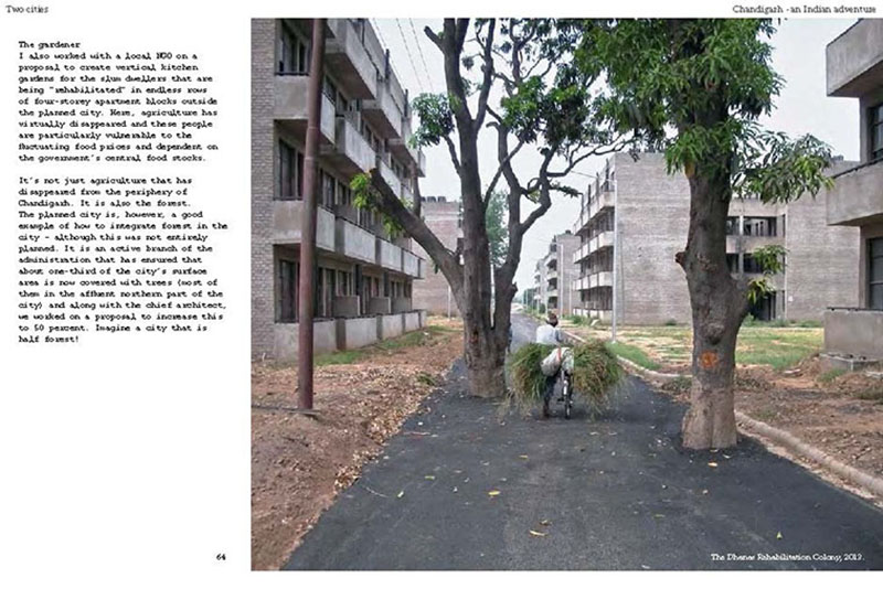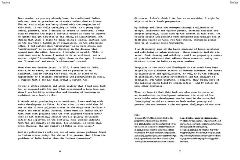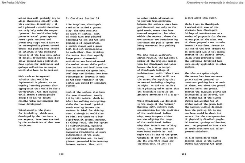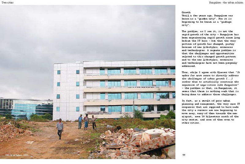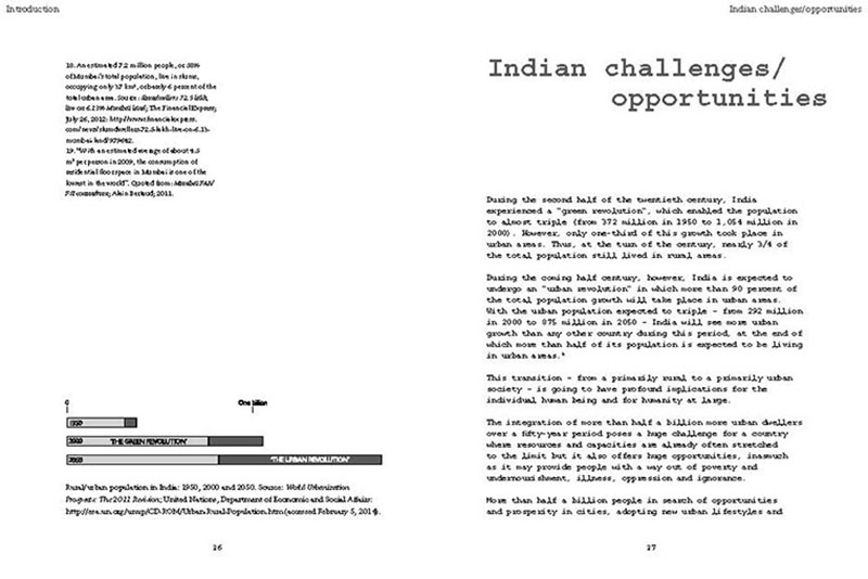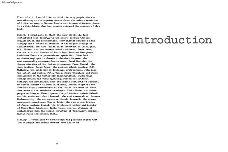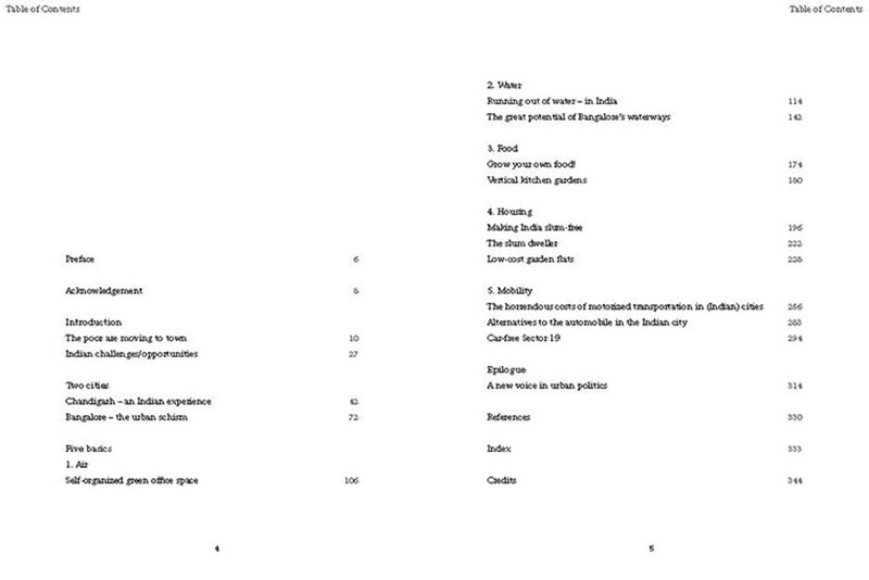 Based on his experiences teaching, researching and practicing in India, the author discusses some of the problems related to the urban transition of India, including the air pollution, the contamination and depletion of fresh water resources, the precarious food situation, the lack of proper housing, and various environmental and human health problems related to motorized transportation. He also proposes a number of possible solutions, including the use of plants and natural ventilation to create clean indoor air, the revitalization of an existing system of water canals, the creation of vertical kitchen gardens in a rehabilitation colony, a strategy for making an entire neighborhood car-free and a design for self-designed, low-cost housing.