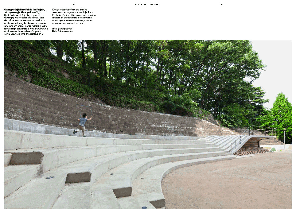 Since the global financial crisis of 2008, the conditions of architectural practice in Korea have fundamentally changed. This new environment has also been a seedbed of architectural creativity, particularly for young architects seeking to establish their foothold in a competitive market. Young innovative architects have responded with a combination of resourcefulness, sophistication and toughness in their interventions into the site and program and into materials and fabrication. Presenting the work of nine architects, two photographers, and a team of designers, Out of the Ordinary is a critical presentation of the contemporary conditions of Korean architecture.