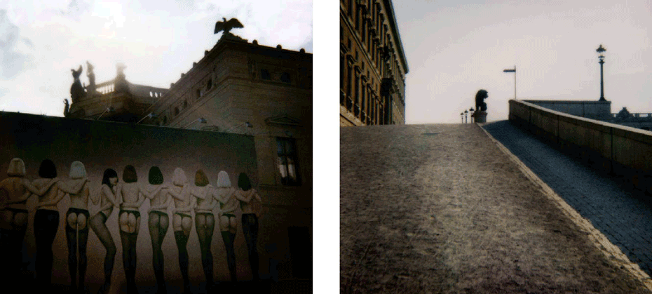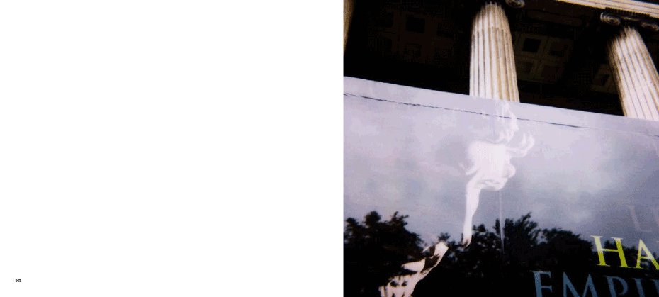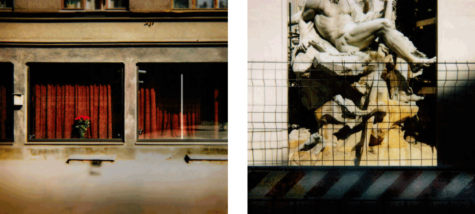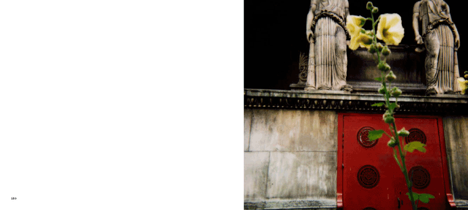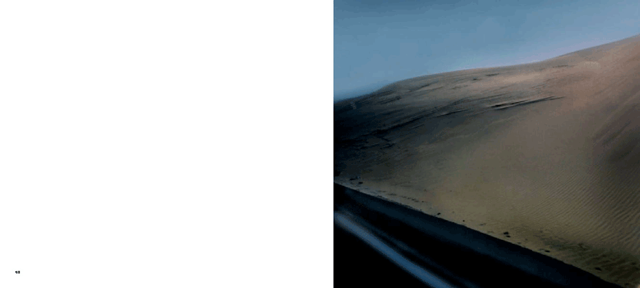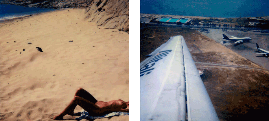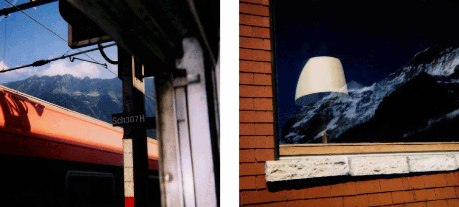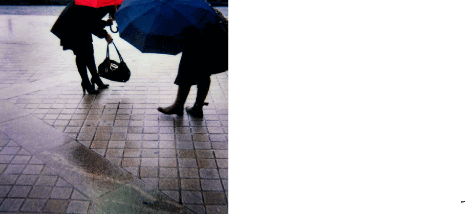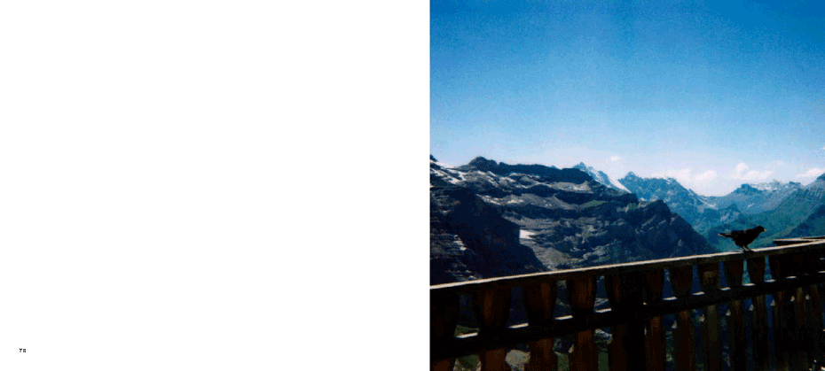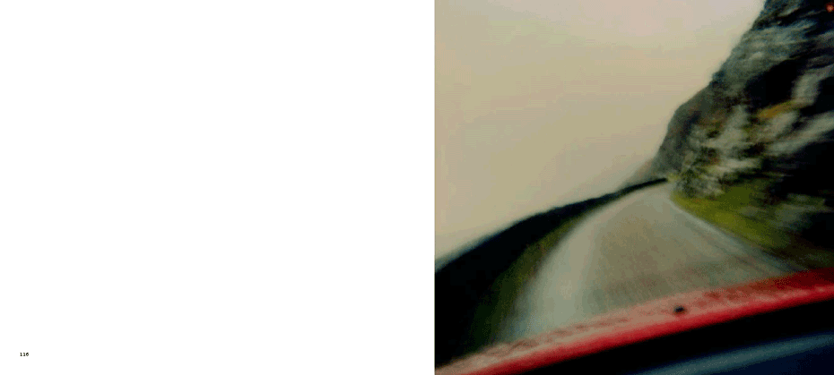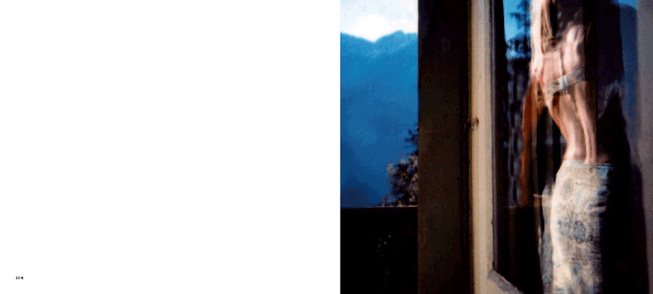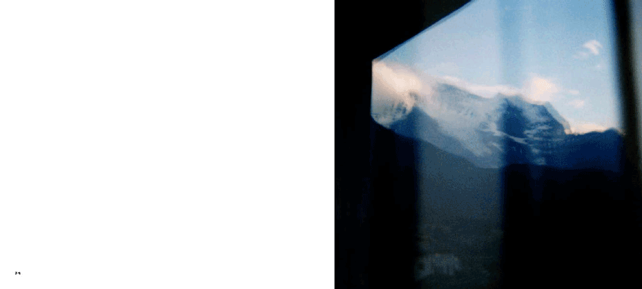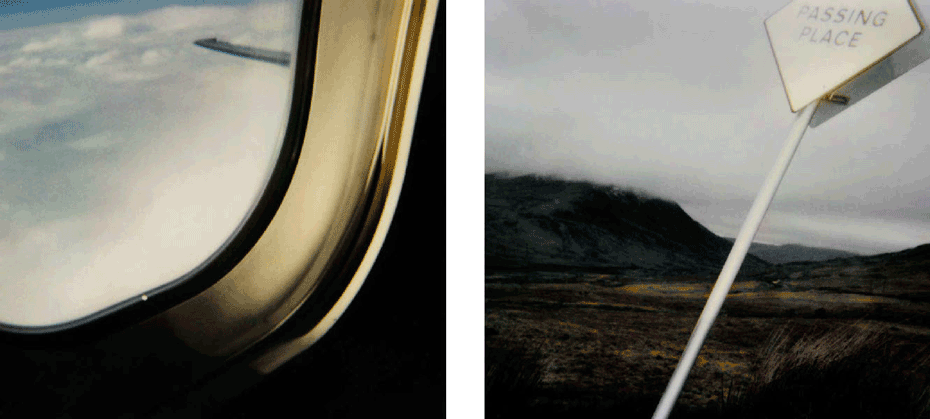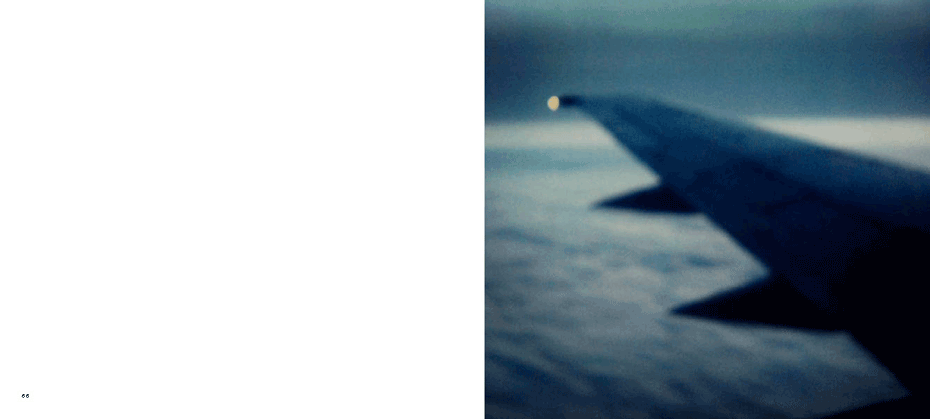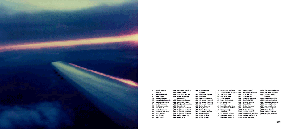 The evidence of a journey is present from the onset, with a mighty jet wing tracing a triangle over the ocean of clouds below, gracing the cover. The same icon concludes the series 80 images on. What we have visited and seen along the way pop up at random between mountains and oceans, between the urban and the rural, between classic and modern and between the erotically inviting and what for lack of better words could be said to be: the doomed"