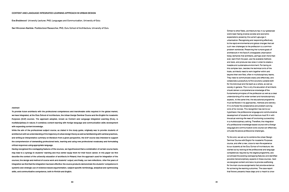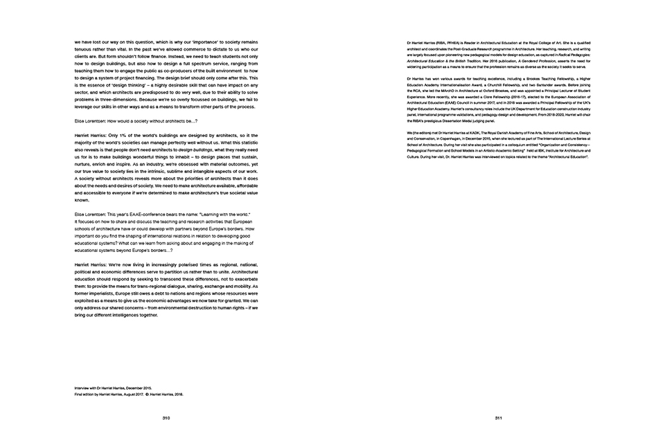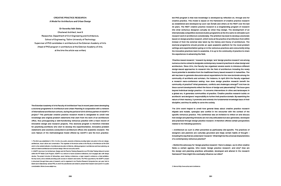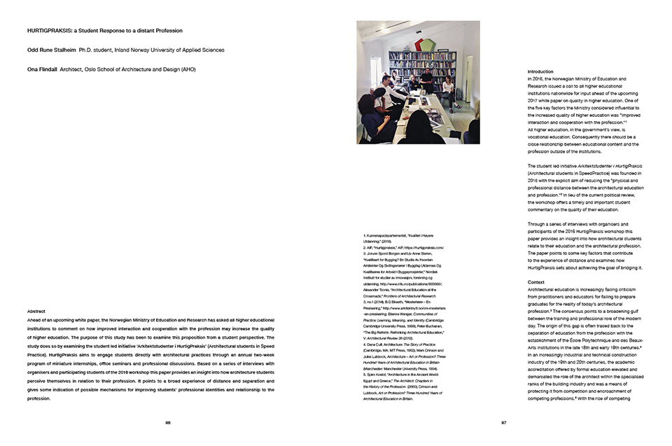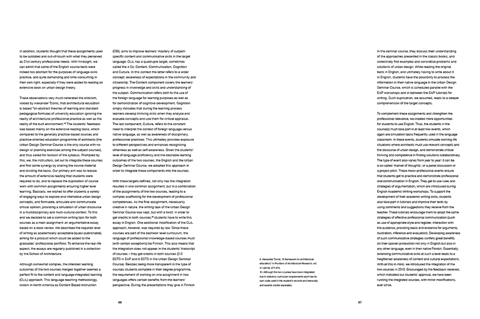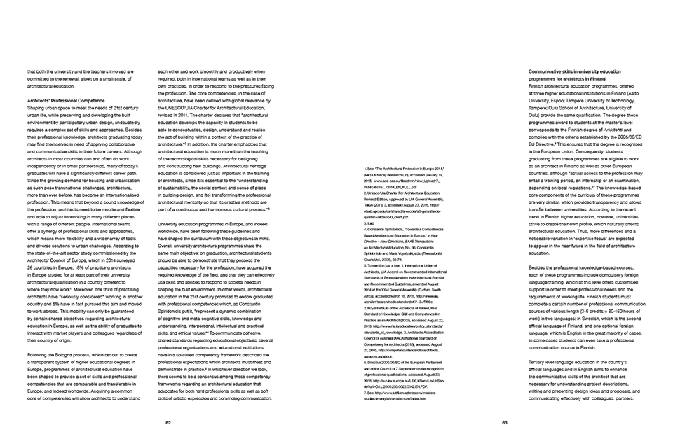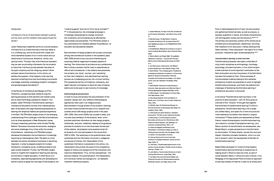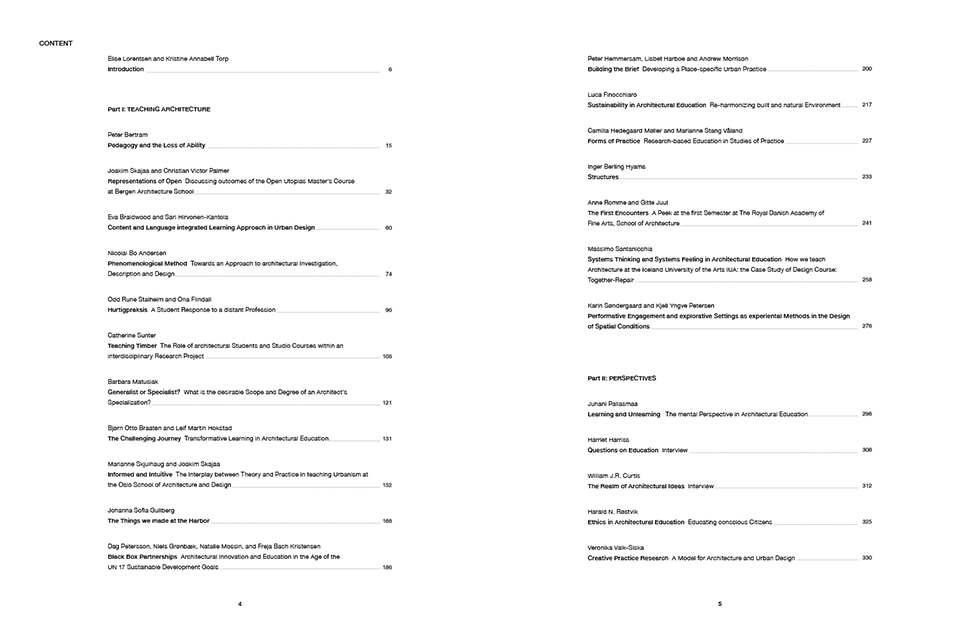 Additionally, there are 5 articles/interviews with international architects, such as Juhani Pallasmaa, William J.R. Curtis, Harriet Harriss, Harald Røstvik and Veronika Valk-Siske, who give their view on teaching architecture.