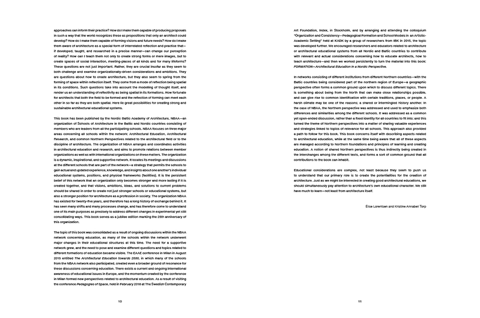Formation – Architectural Education in a Nordic Perspective is a joint venture of 17 Schools of Architecture in the Nordic and Baltic countries, showing what architectural education is about, how it can be structured, what it contains, how it is planned, and what kind of results it produces or should produce. What does it demand to teach architecture—what does it demand of the students of architecture, and of the teachers? Different architectural topics are presented and educational processes shown, together with works of the students.