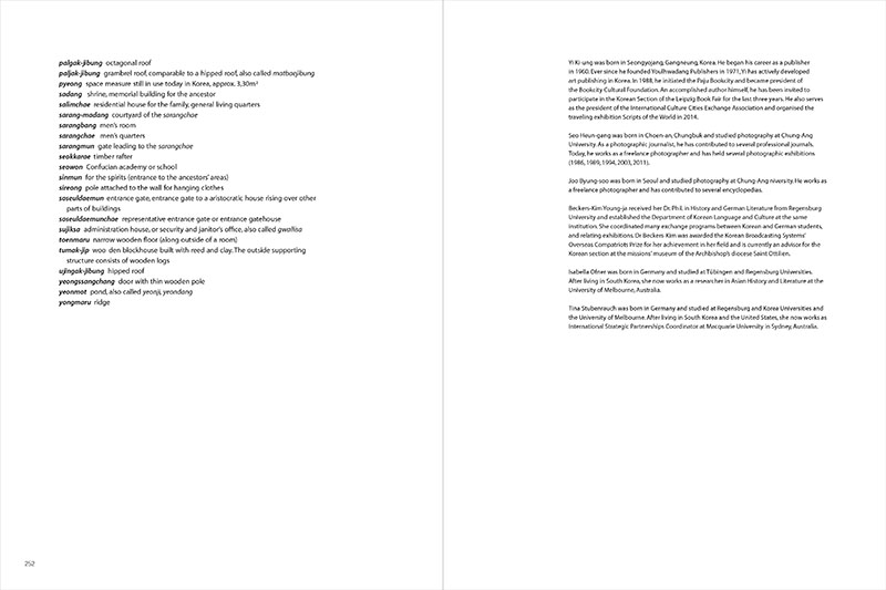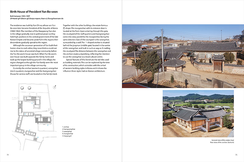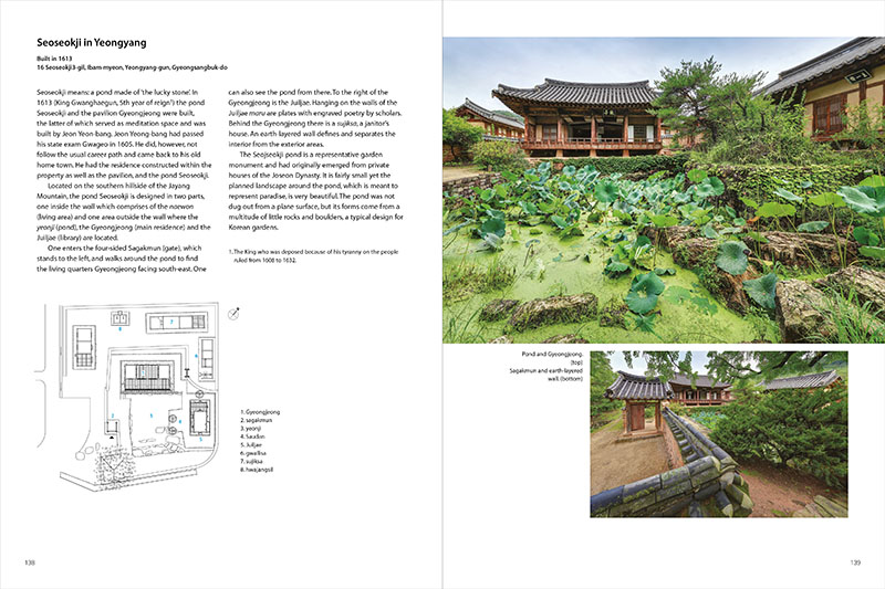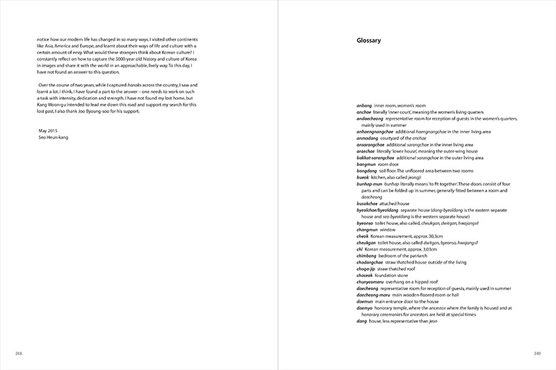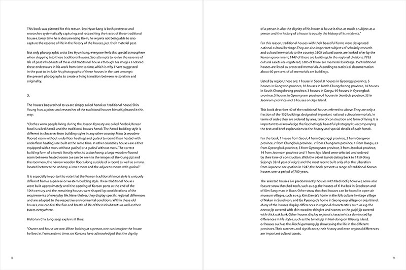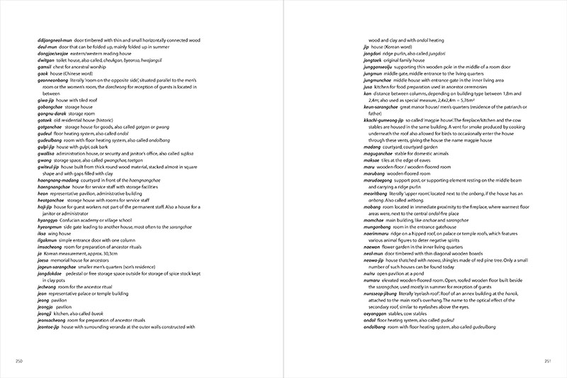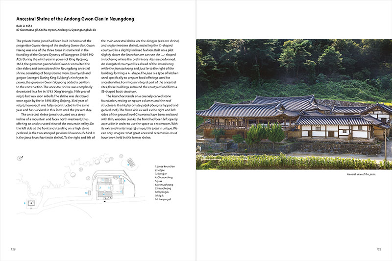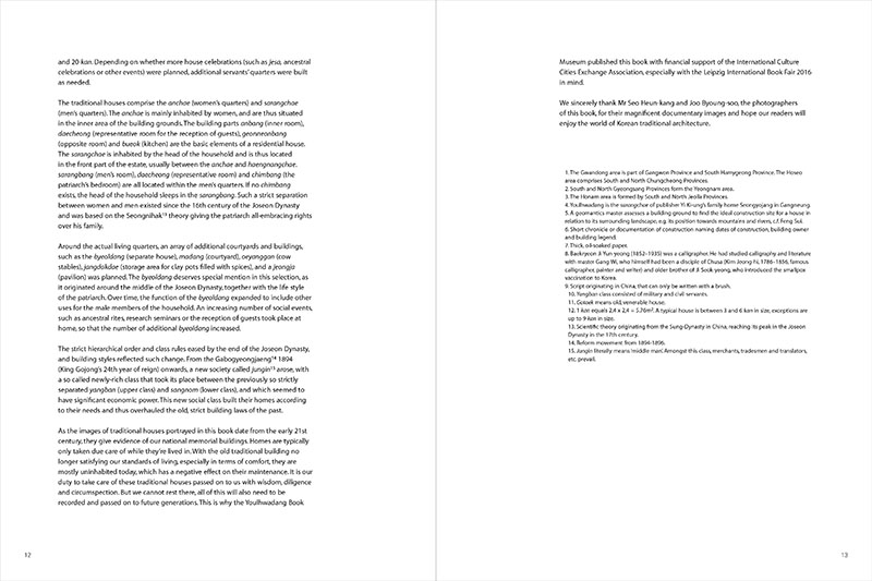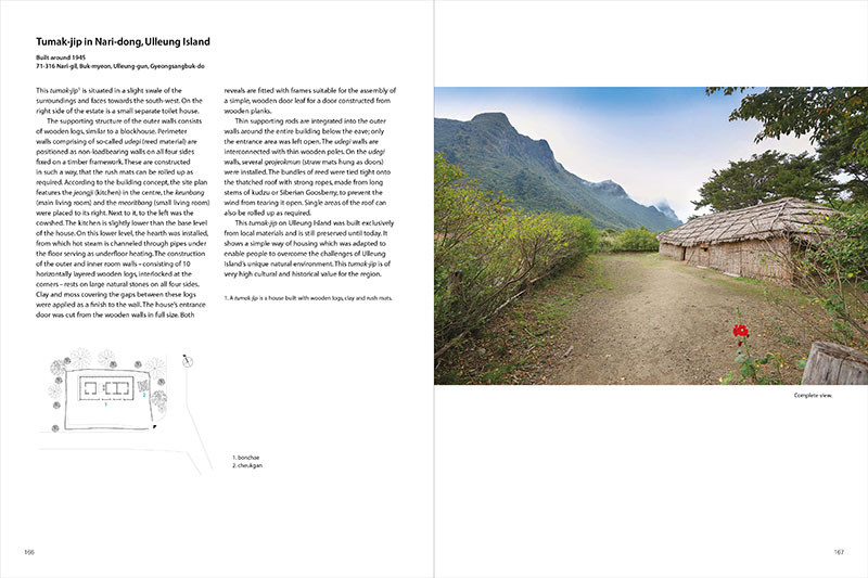 The book gives an overview of the traditional Korean residential house, the Hanok, meaning a ”traditional house”. The Korean hanok style is uniquely different from a Japanese or Western building style, since it was built according to the needs of the country’s very distinct four seasons, with an open veranda for the very warm, humid summers and an under floor heating-system for the harsh, cold winters. With the oldest hanok dating back to 1450 and the most recent built in 1947, the book presents a range of traditional Korean houses over a period of 700 years.
