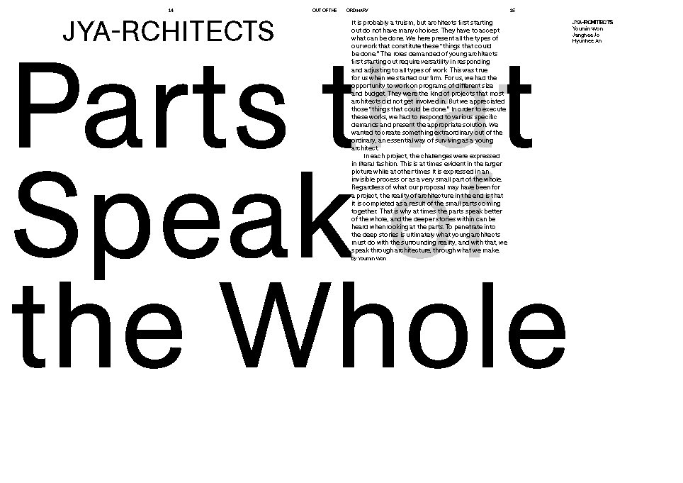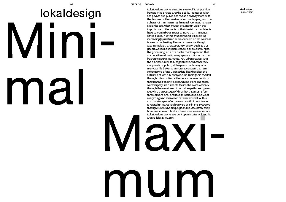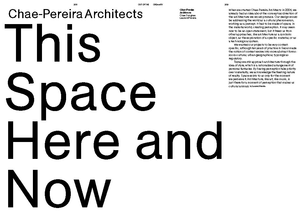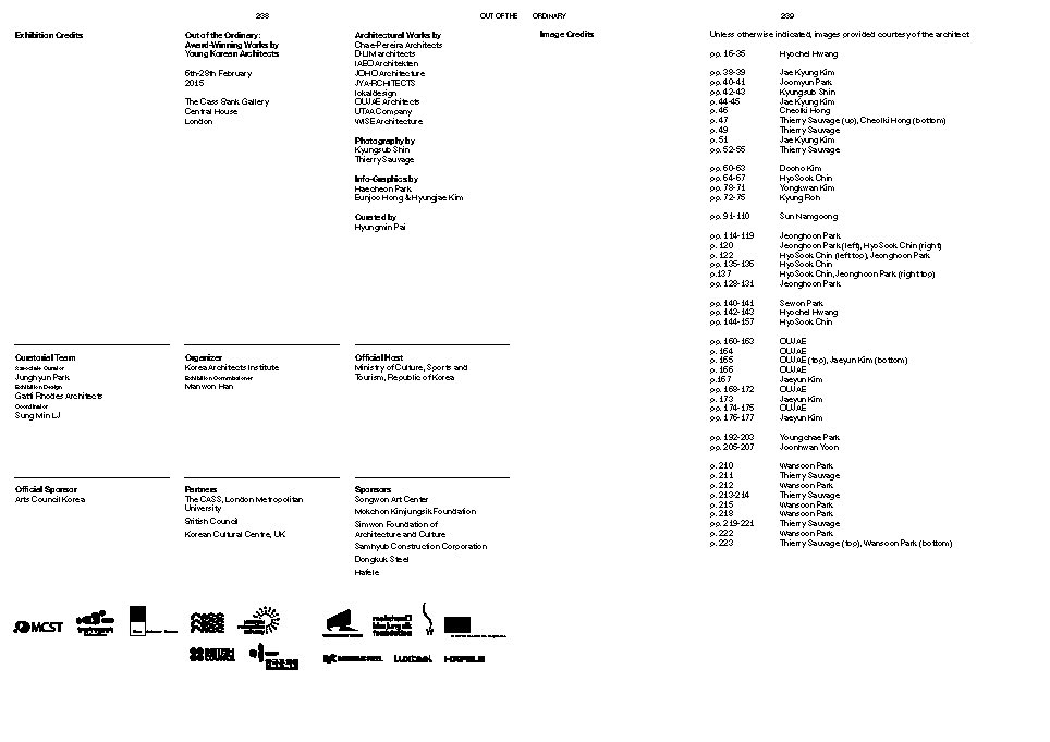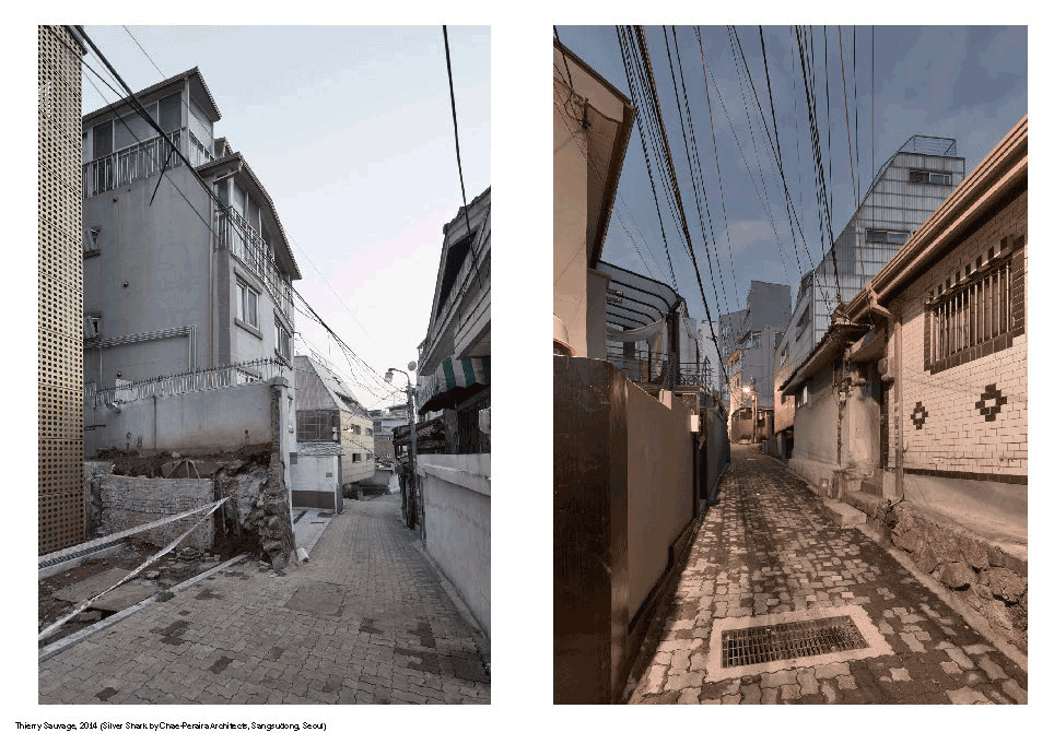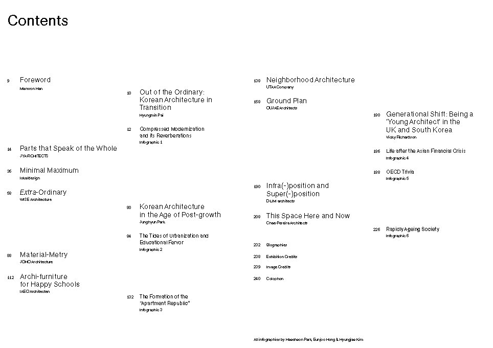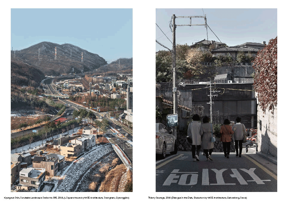 Presenting works by: Chae-Pereira architects, D-LIM architects, IAEO architekten, JOHO architecture, JYA-RCHITECTS, lokaldesign, OUJAE architects, UTAA company, WISE architecture, the photographers Kyungsub Shin & Thierry Sauvage, the designers Haecheon Park & Eunjoo Hong and Hyungjae Kim.
