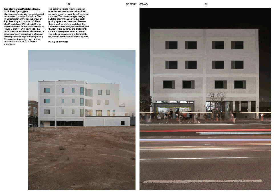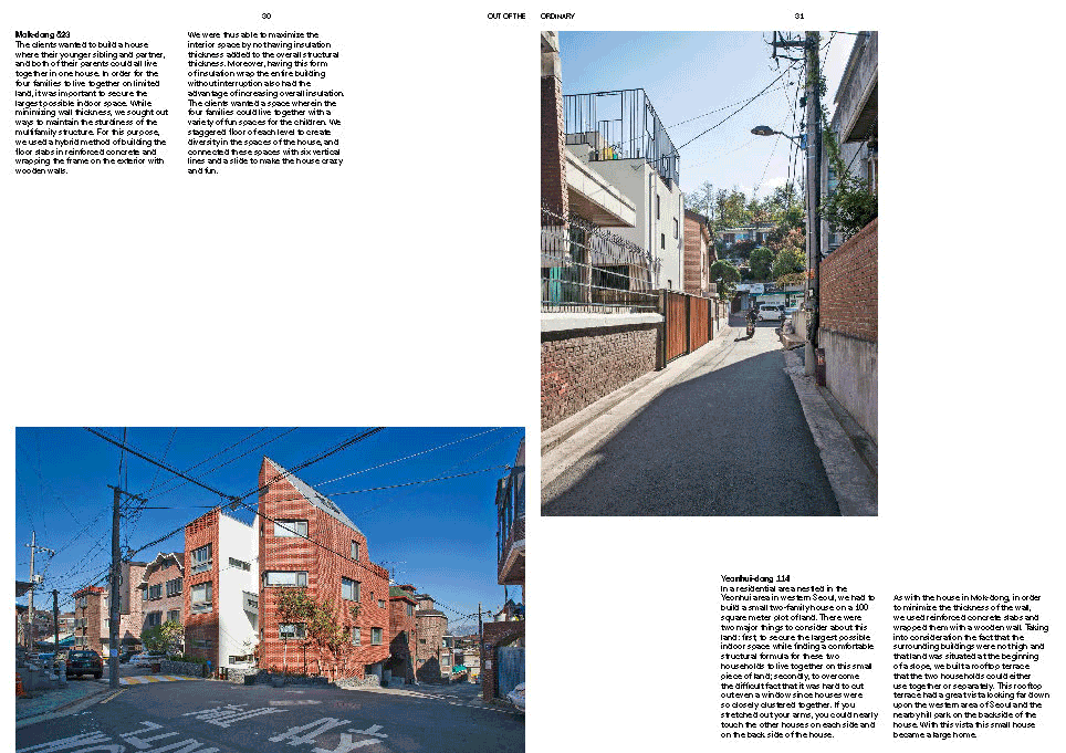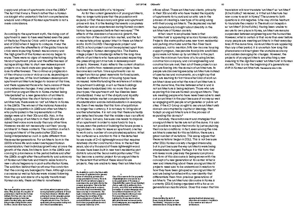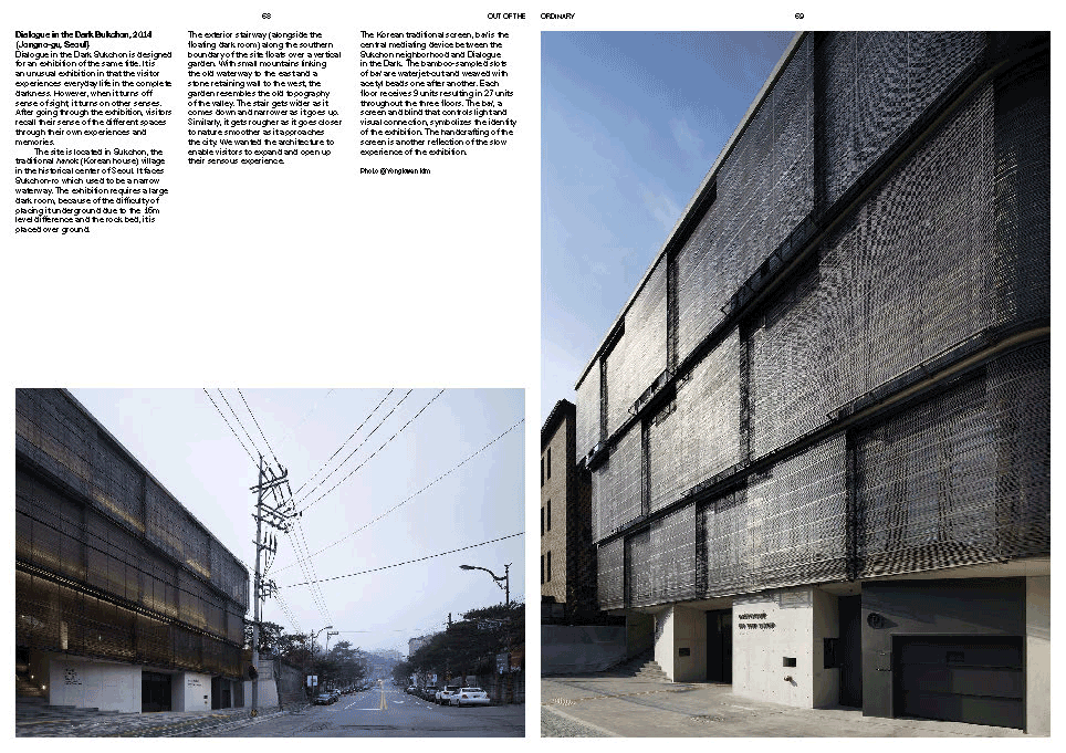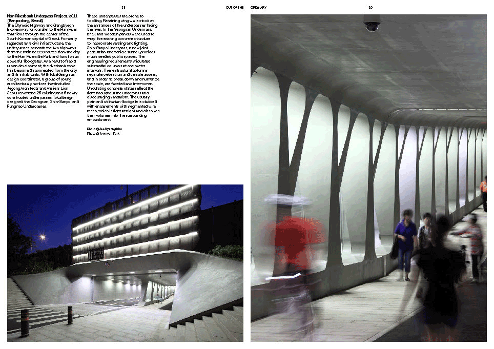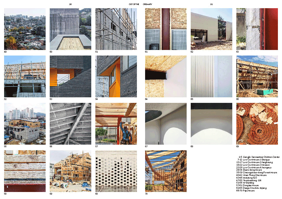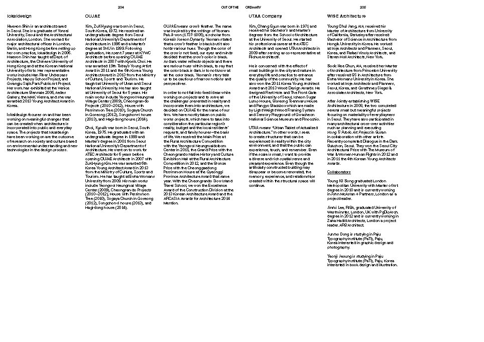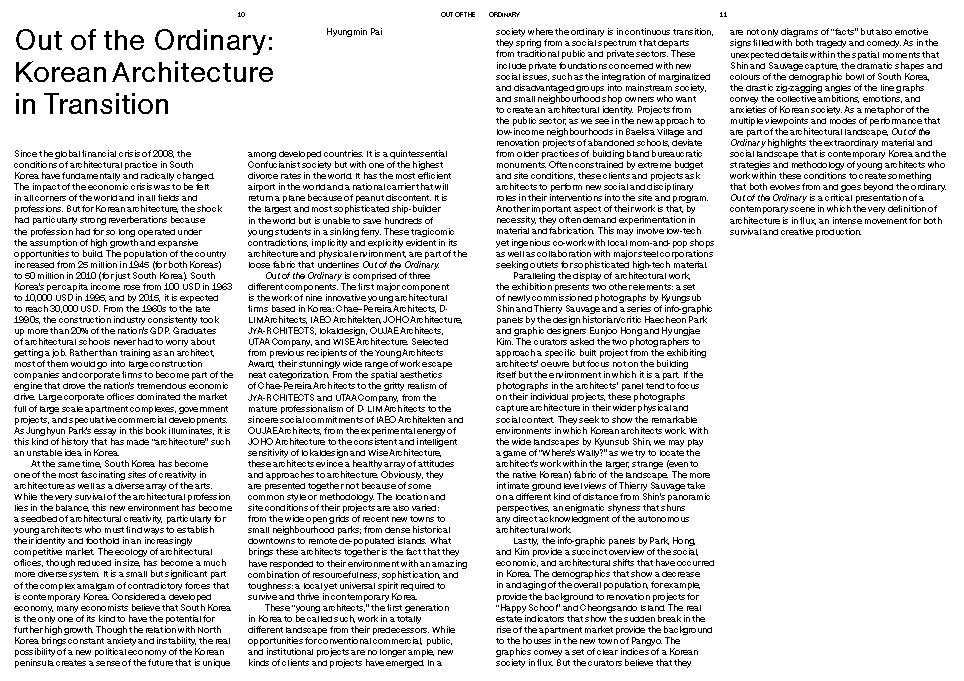Since the global financial crisis of 2008, the conditions of architectural practice in Korea have fundamentally changed. This new environment has also been a seedbed of architectural creativity, particularly for young architects seeking to establish their foothold in a competitive market. Young innovative architects have responded with a combination of resourcefulness, sophistication and toughness in their interventions into the site and program and into materials and fabrication. Presenting the work of nine architects, two photographers, and a team of designers, Out of the Ordinary is a critical presentation of the contemporary conditions of Korean architecture.