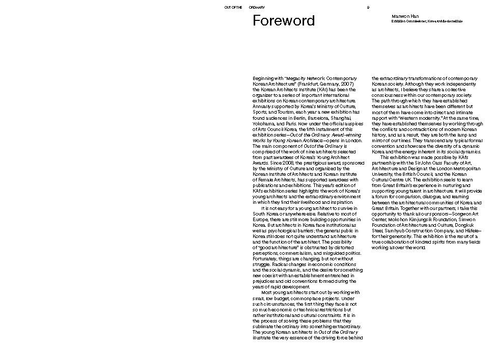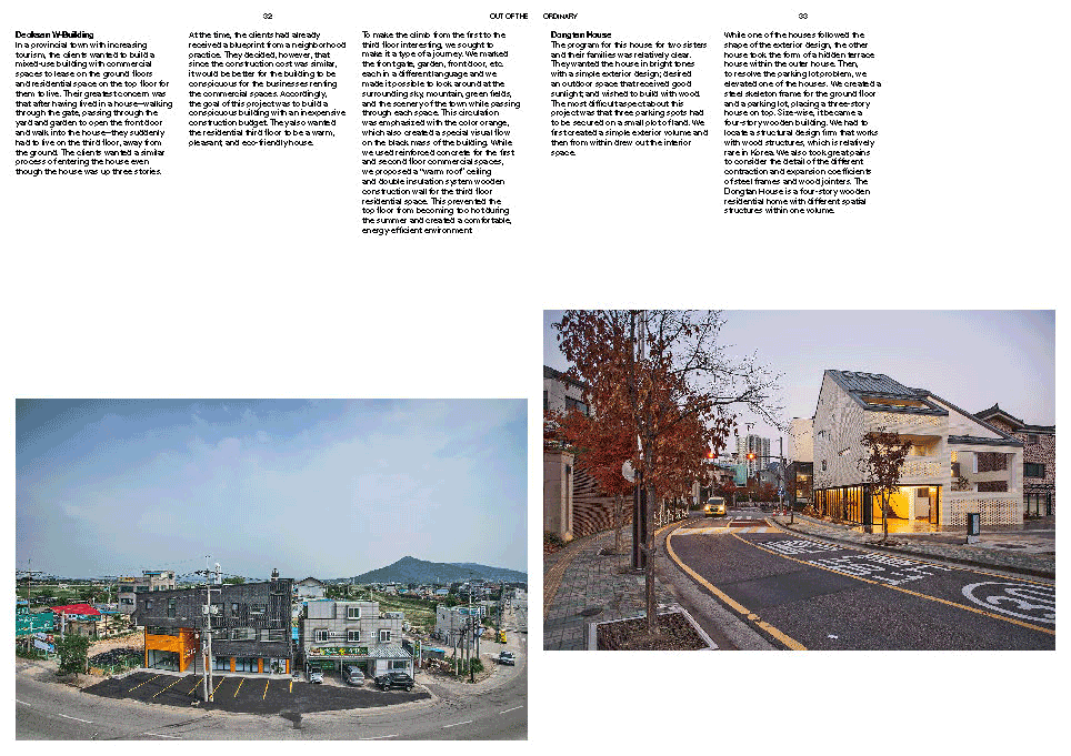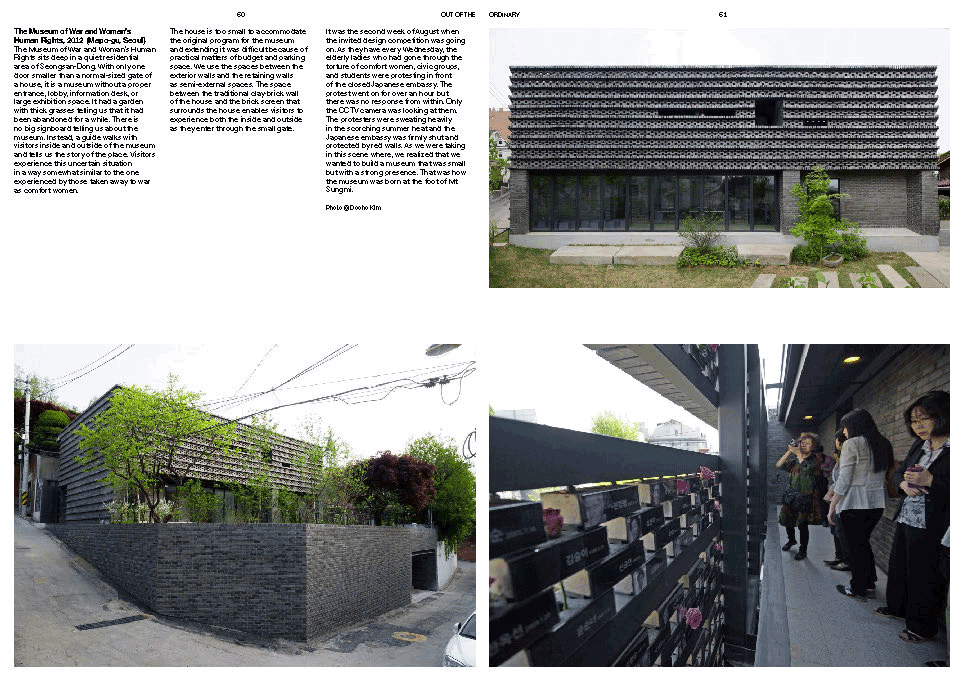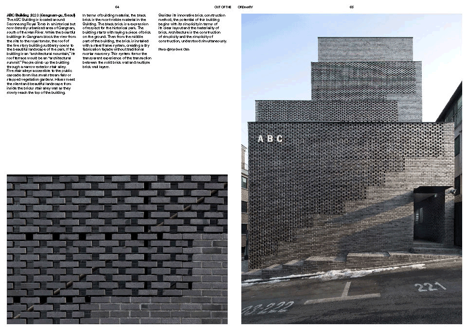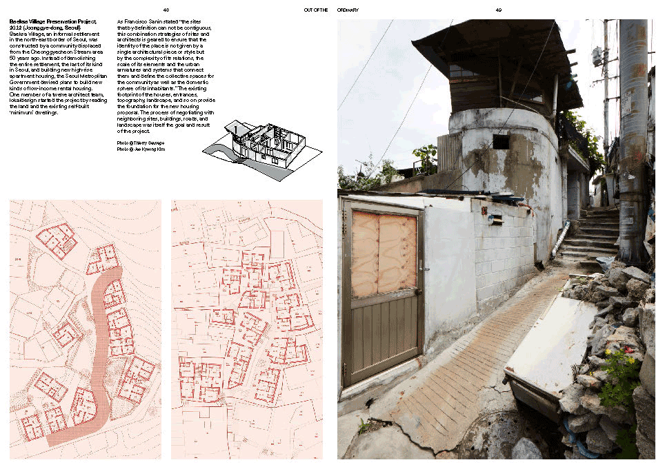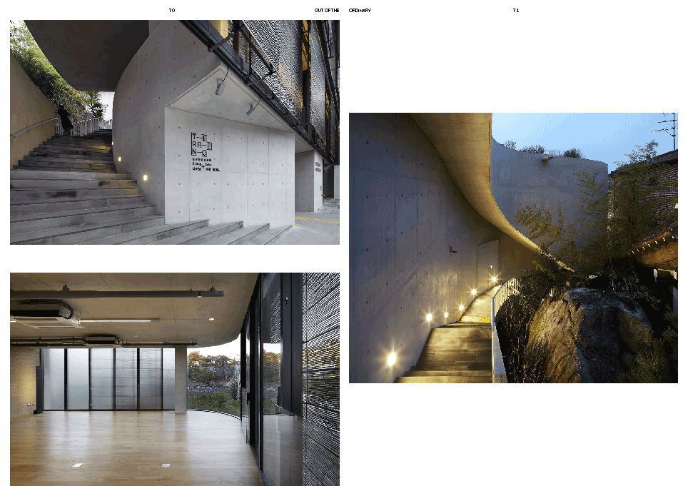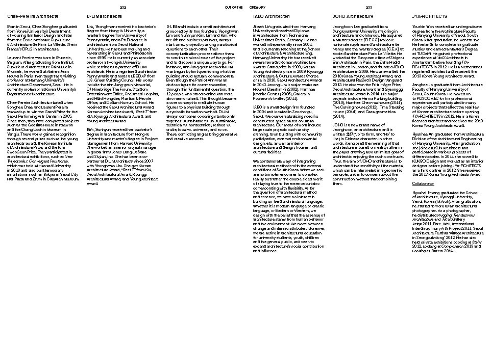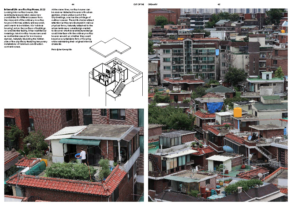 Since the global financial crisis of 2008, the conditions of architectural practice in Korea have fundamentally changed. This new environment has also been a seedbed of architectural creativity, particularly for young architects seeking to establish their foothold in a competitive market. Young innovative architects have responded with a combination of resourcefulness, sophistication and toughness in their interventions into the site and program and into materials and fabrication. Presenting the work of nine architects, two photographers, and a team of designers, Out of the Ordinary is a critical presentation of the contemporary conditions of Korean architecture.