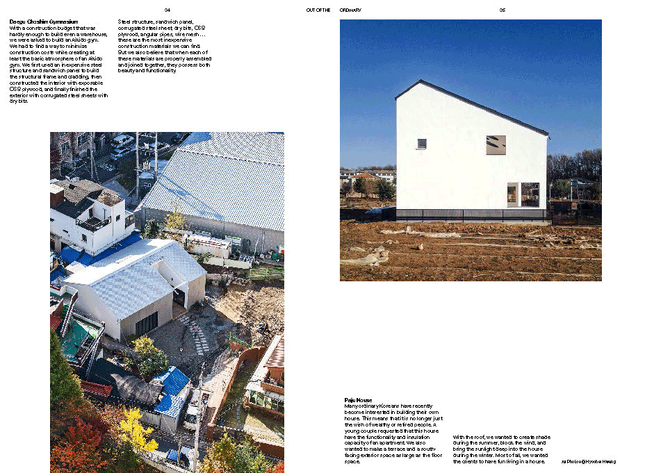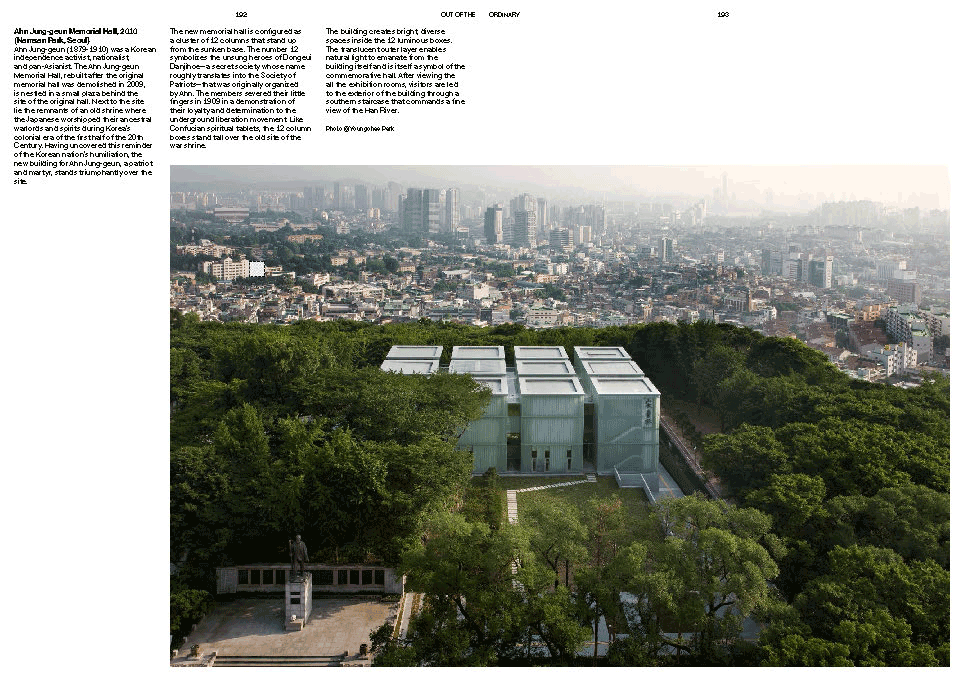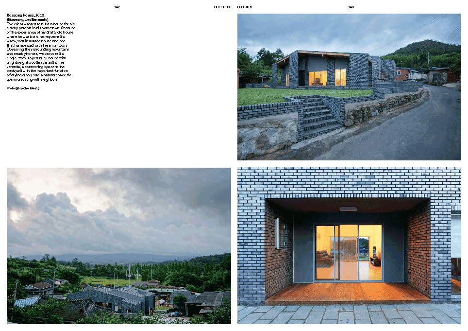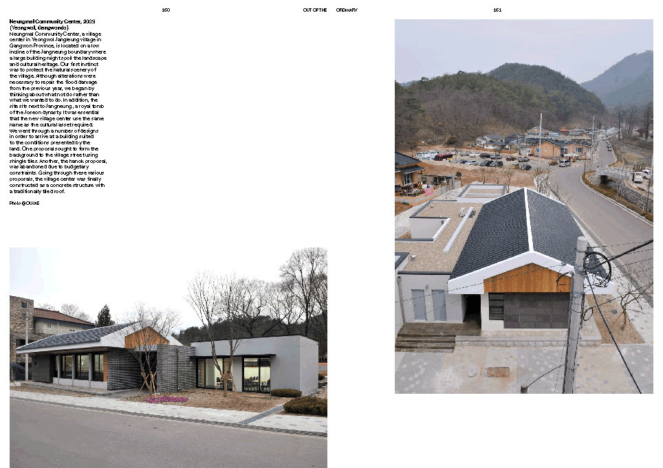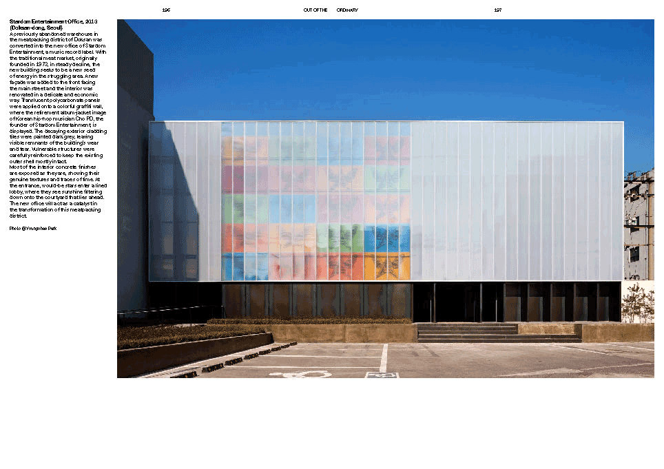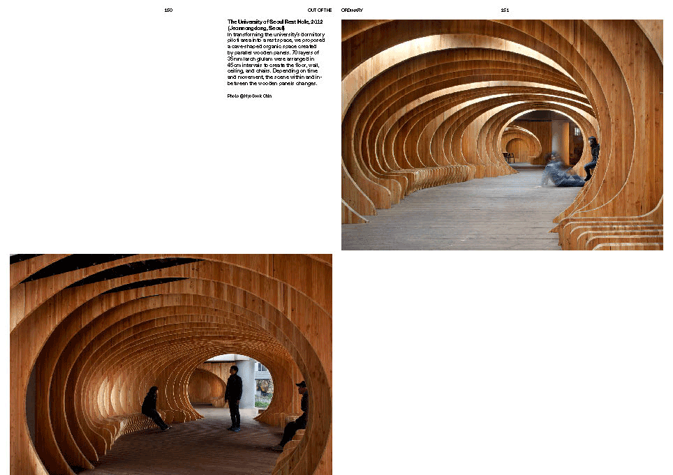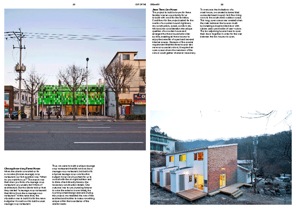 Since the global financial crisis of 2008, the conditions of architectural practice in Korea have fundamentally changed. This new environment has also been a seedbed of architectural creativity, particularly for young architects seeking to establish their foothold in a competitive market. Young innovative architects have responded with a combination of resourcefulness, sophistication and toughness in their interventions into the site and program and into materials and fabrication. Presenting the work of nine architects, two photographers, and a team of designers, Out of the Ordinary is a critical presentation of the contemporary conditions of Korean architecture.