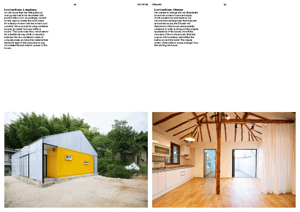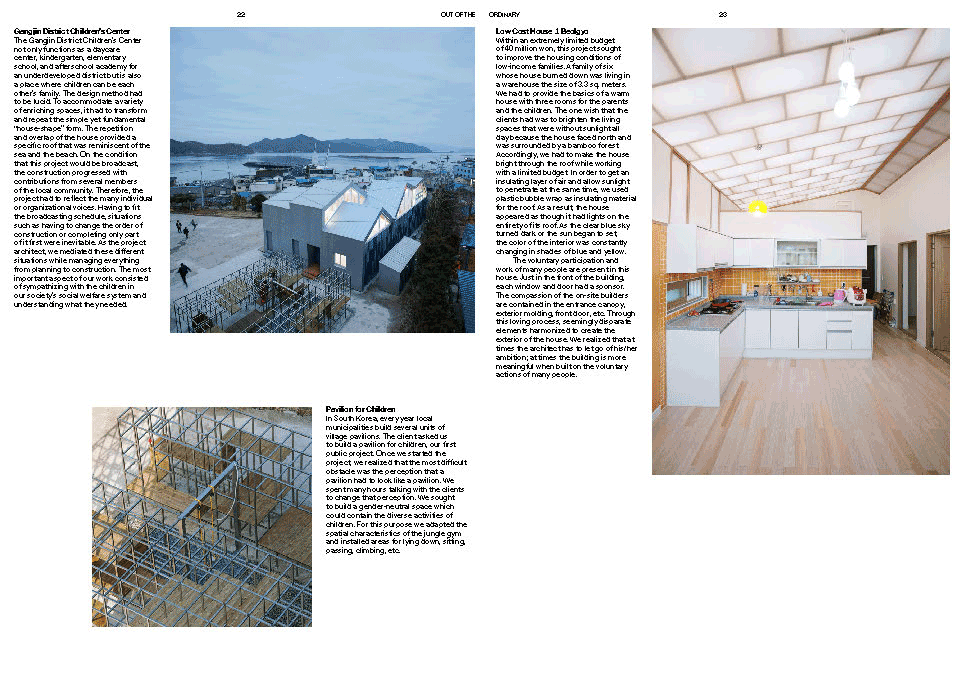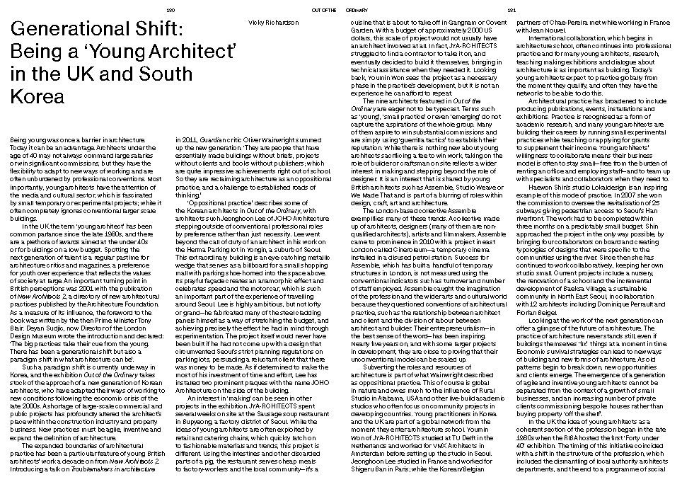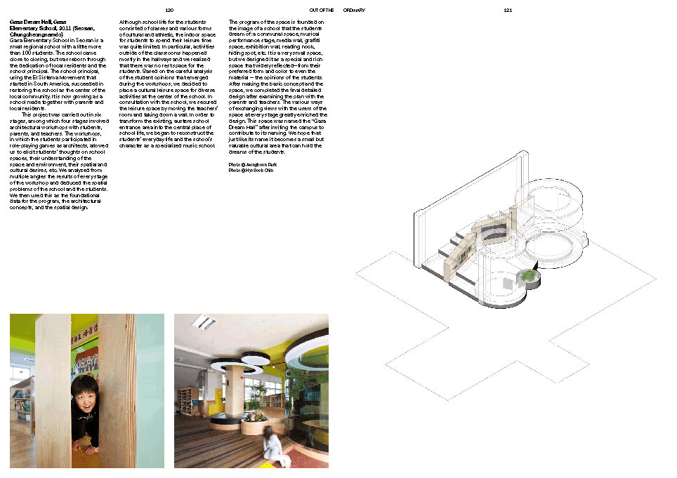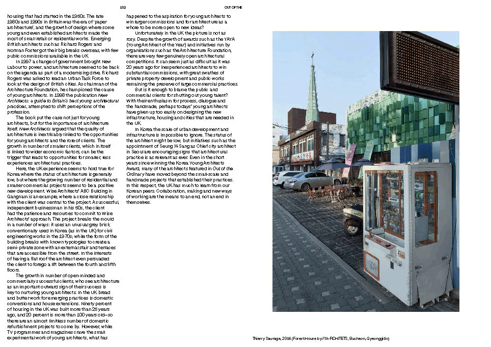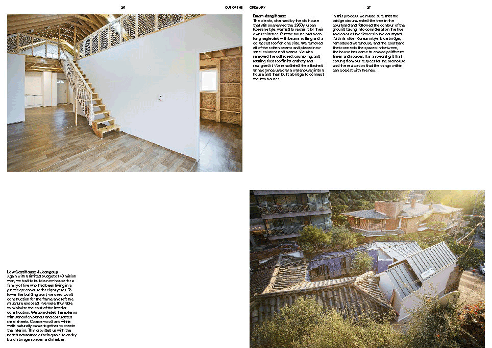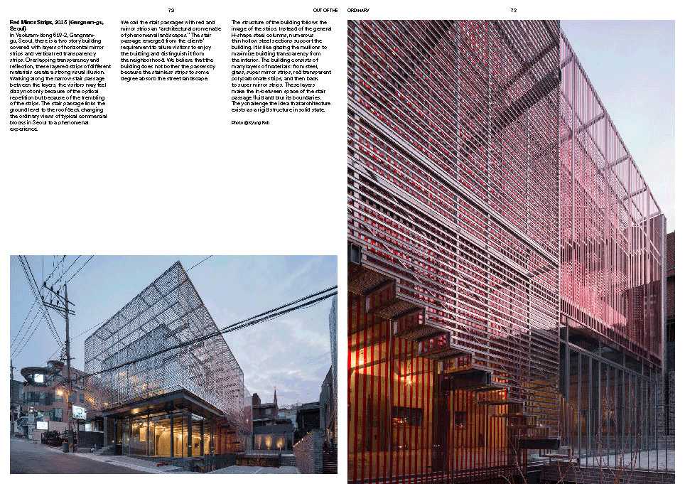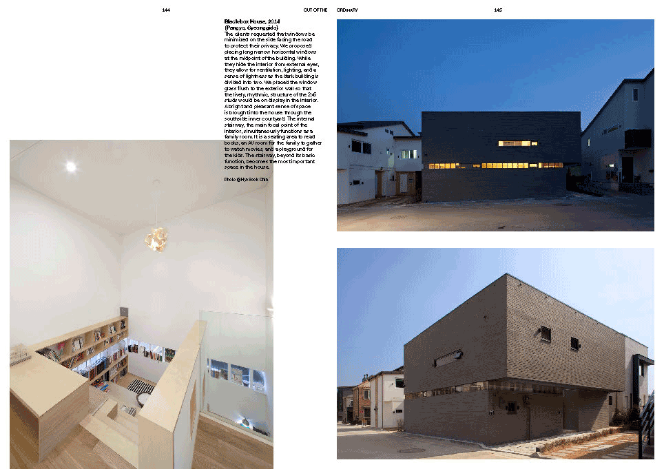 Since the global financial crisis of 2008, the conditions of architectural practice in Korea have fundamentally changed. This new environment has also been a seedbed of architectural creativity, particularly for young architects seeking to establish their foothold in a competitive market. Young innovative architects have responded with a combination of resourcefulness, sophistication and toughness in their interventions into the site and program and into materials and fabrication. Presenting the work of nine architects, two photographers, and a team of designers, Out of the Ordinary is a critical presentation of the contemporary conditions of Korean architecture.