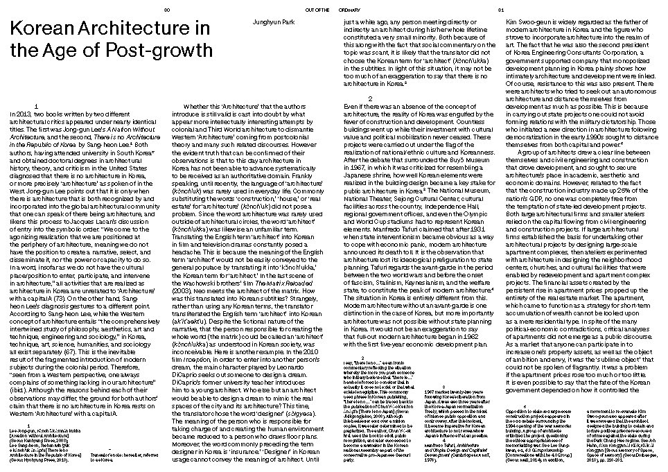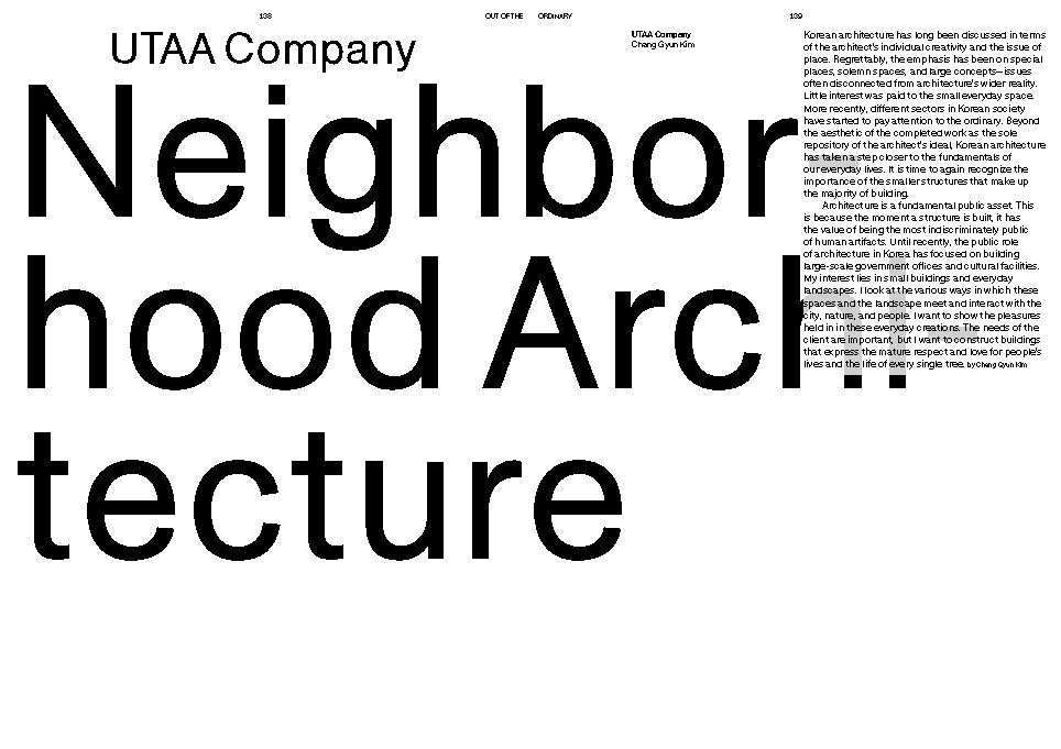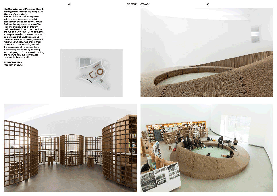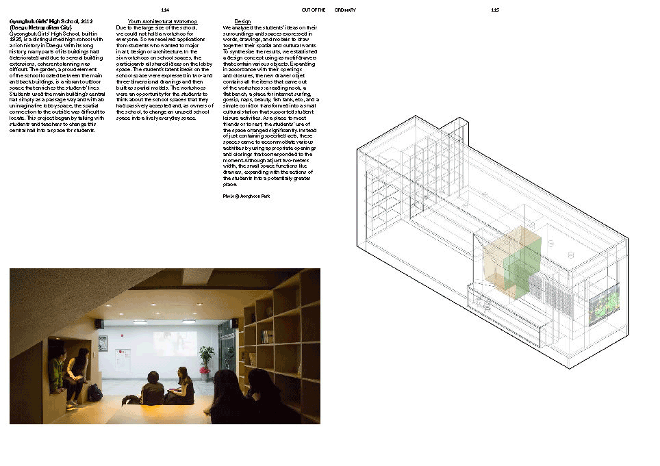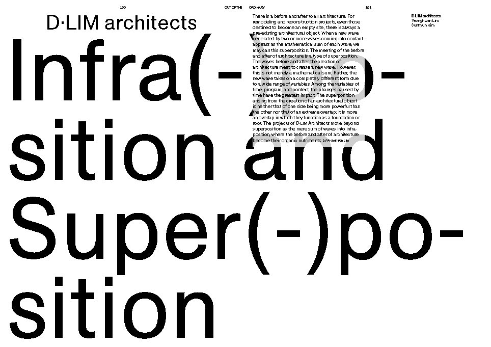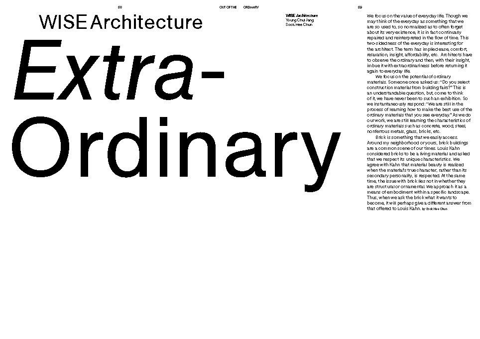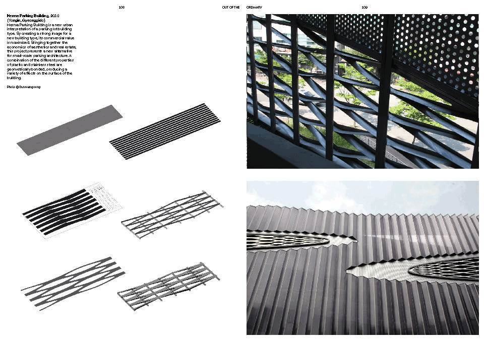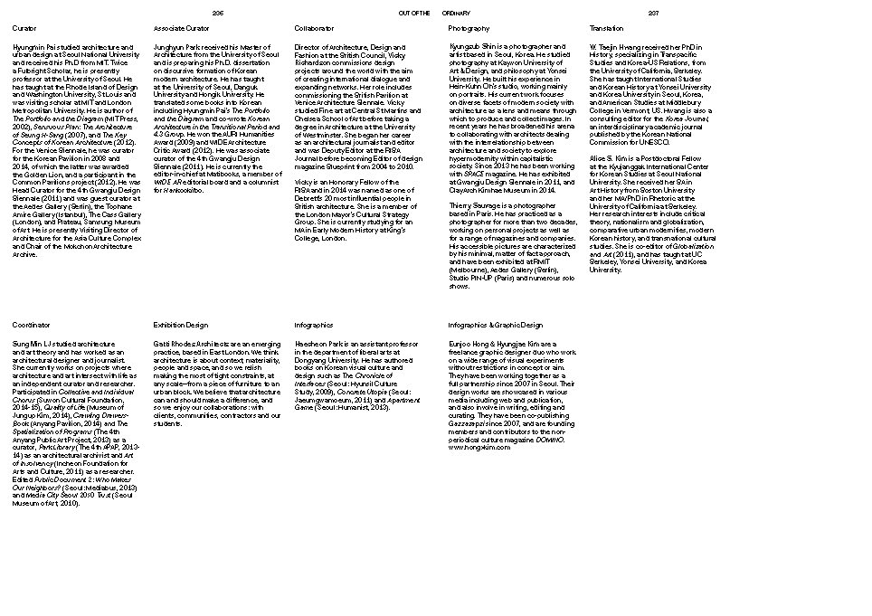 Since the global financial crisis of 2008, the conditions of architectural practice in Korea have fundamentally changed. This new environment has also been a seedbed of architectural creativity, particularly for young architects seeking to establish their foothold in a competitive market. Young innovative architects have responded with a combination of resourcefulness, sophistication and toughness in their interventions into the site and program and into materials and fabrication. Presenting the work of nine architects, two photographers, and a team of designers, Out of the Ordinary is a critical presentation of the contemporary conditions of Korean architecture.