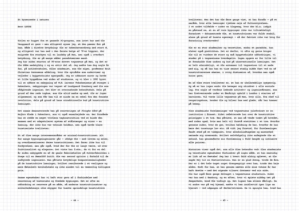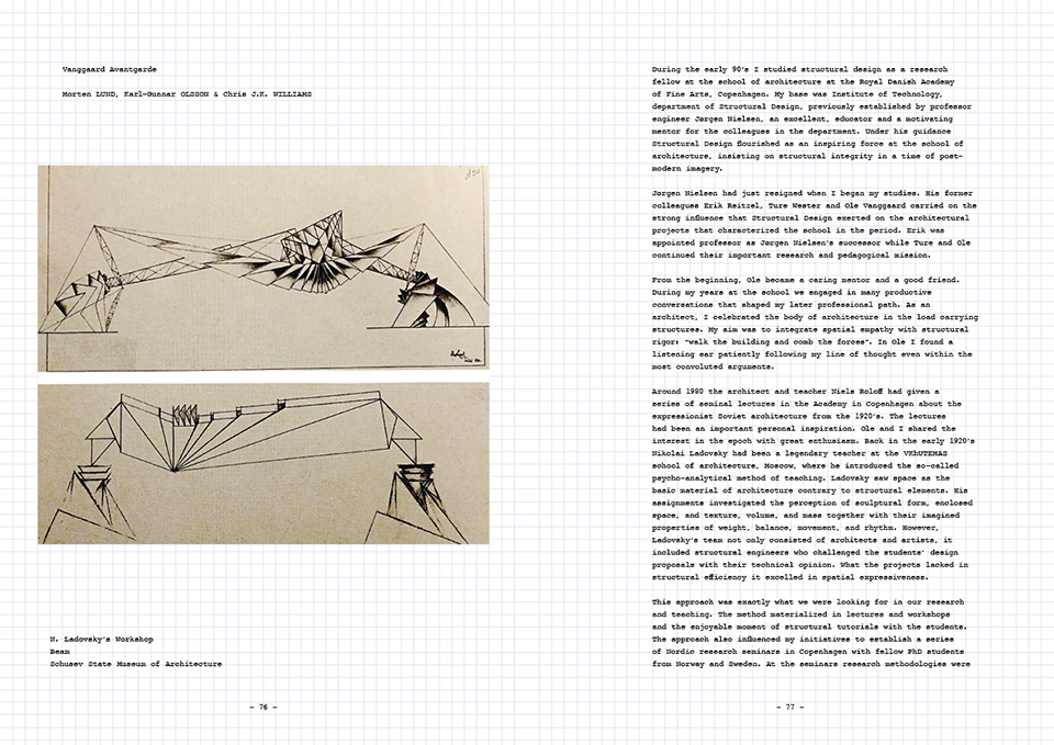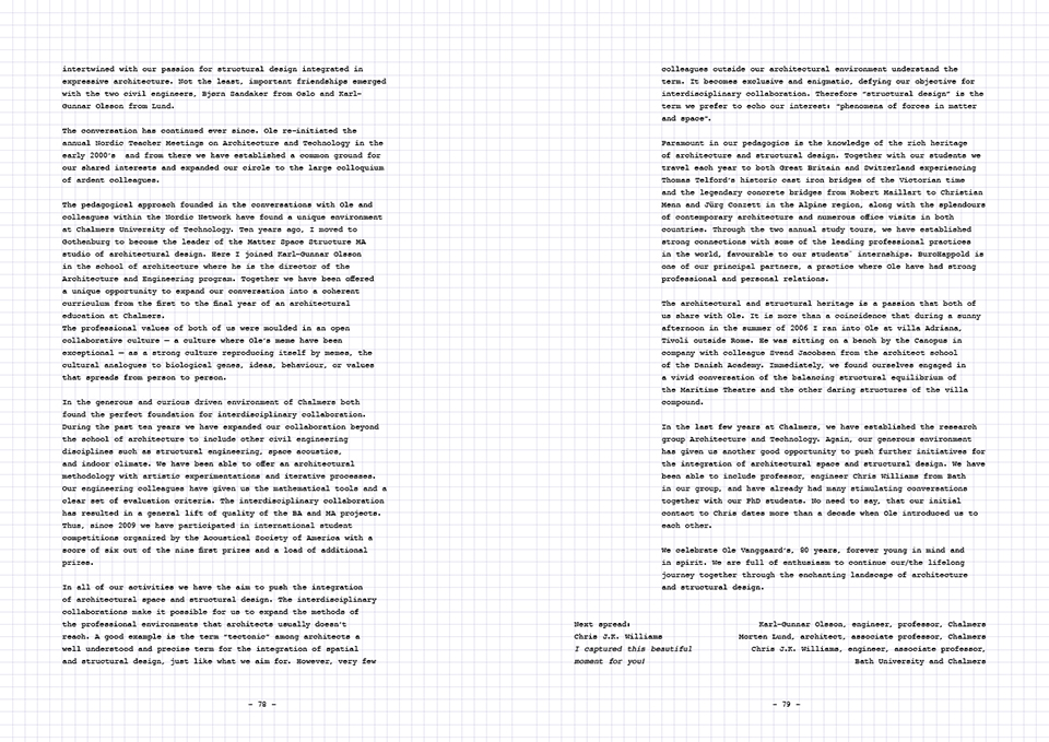 "Engineering with Ole Vanggaard" is a tribute to the works of the Danish engineer Ole Vanggaard, who has been working as an engineer, teacher, consultant, theorist and artist, showing some of his projects and 17 smaller articles by former colleagues and collaborators, telling about projects they have been doing with Ole and displaying the wide range of his career, both at the Royal Academy in Copenhagen and his many consultant jobs for architectural offices and artists. His work also shows how engineers and architects can and should work together.