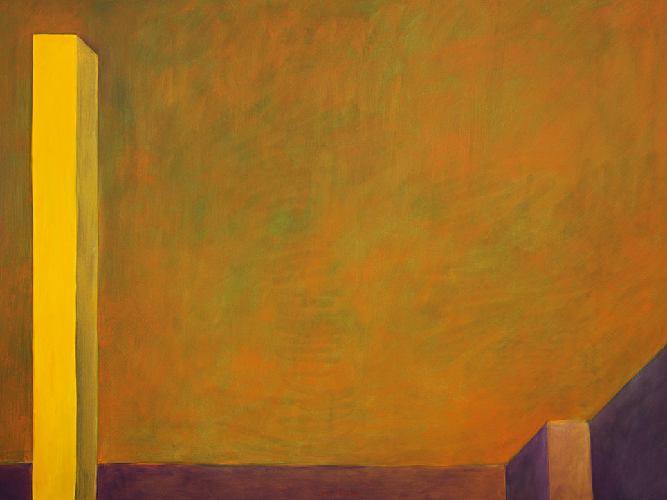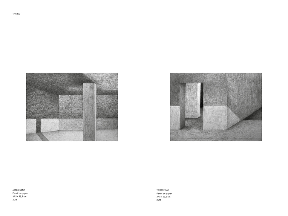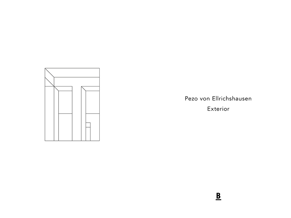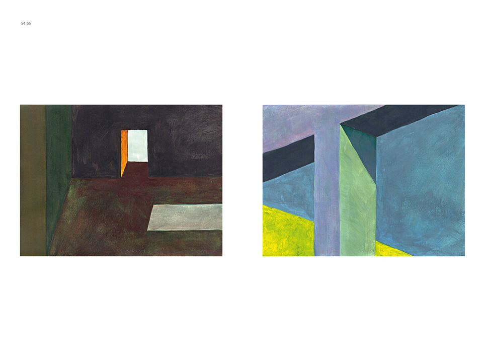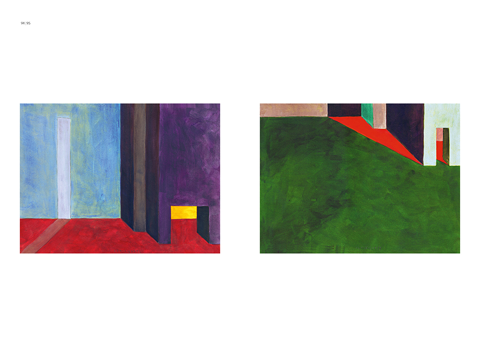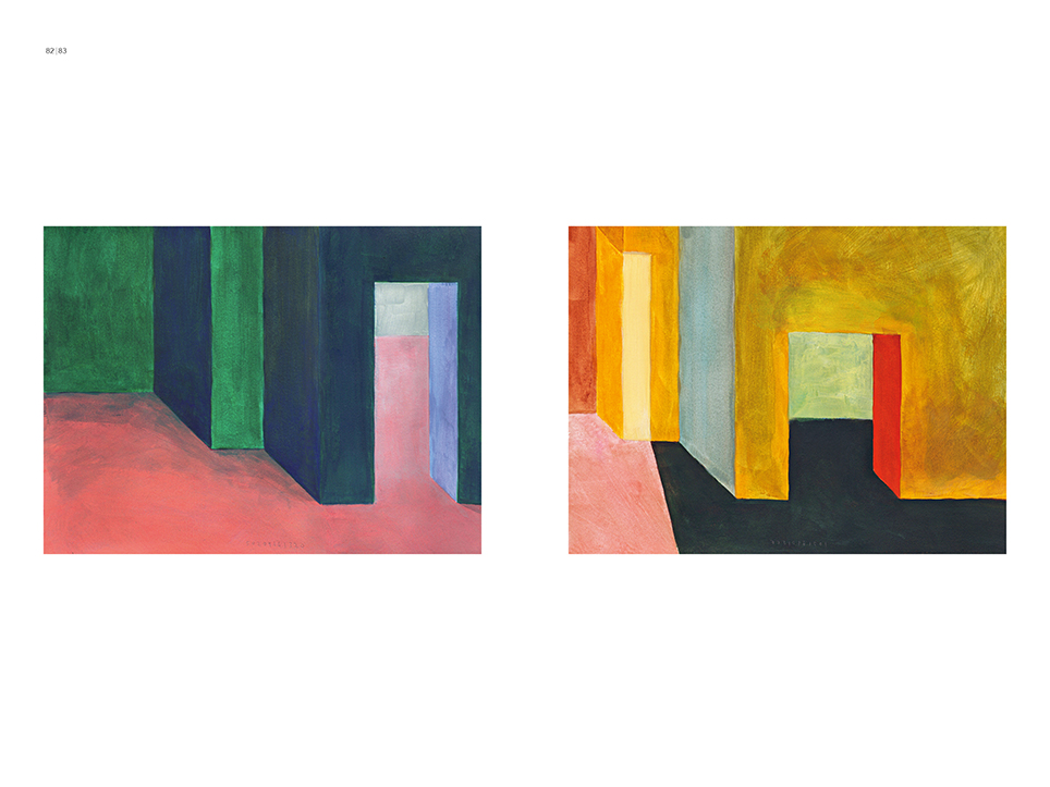 “Exterior” is an explicit counterpart to Pezo von Ellrichshausen’s previous self-contained axonometric structures. In their large and immersive format, as both abstract and figurative compositions, these latest paintings are portraying the reversible quality of rather familiar architectonic spaces. The relative scale, rawness and depth depicted in these simple rooms can be read as carefully selected fragments taken from no particular building, from a pervasive and perhaps idealized laconic architecture. As an incomplete open reality, every picture is framing a discreet, quiet and typical encounter of walls, floors and ceilings; with a precise articulation of corners by means of a few basic architectural elements such as openings, steps, columns and beams. These are intimate and lively atmospheres that evoke an implicit memory of a well known place while conveying those oblique yet personal instants of attention in our everyday life.