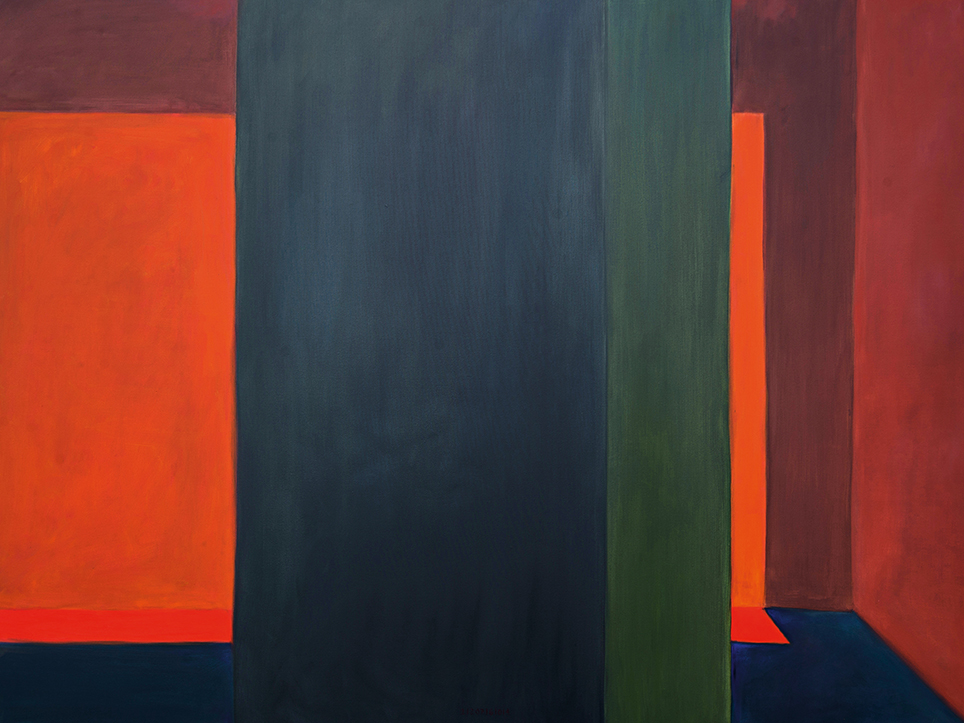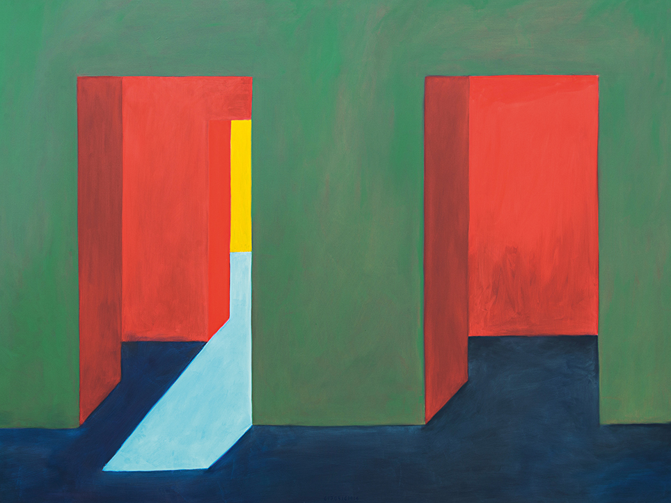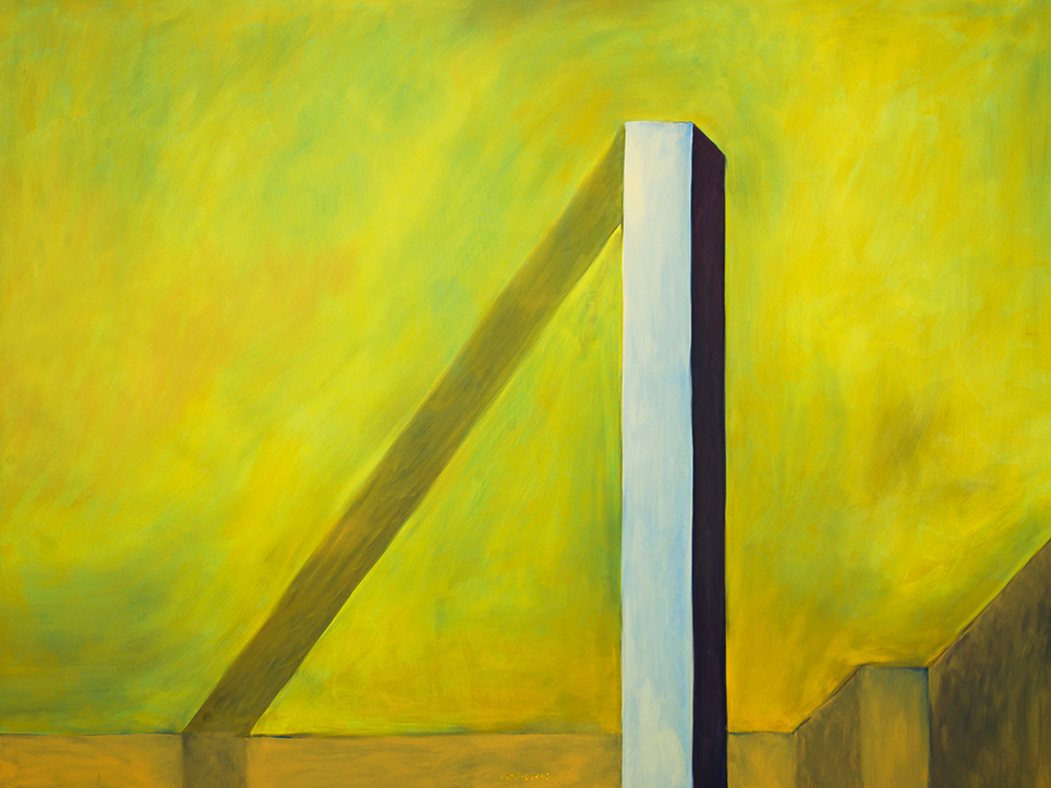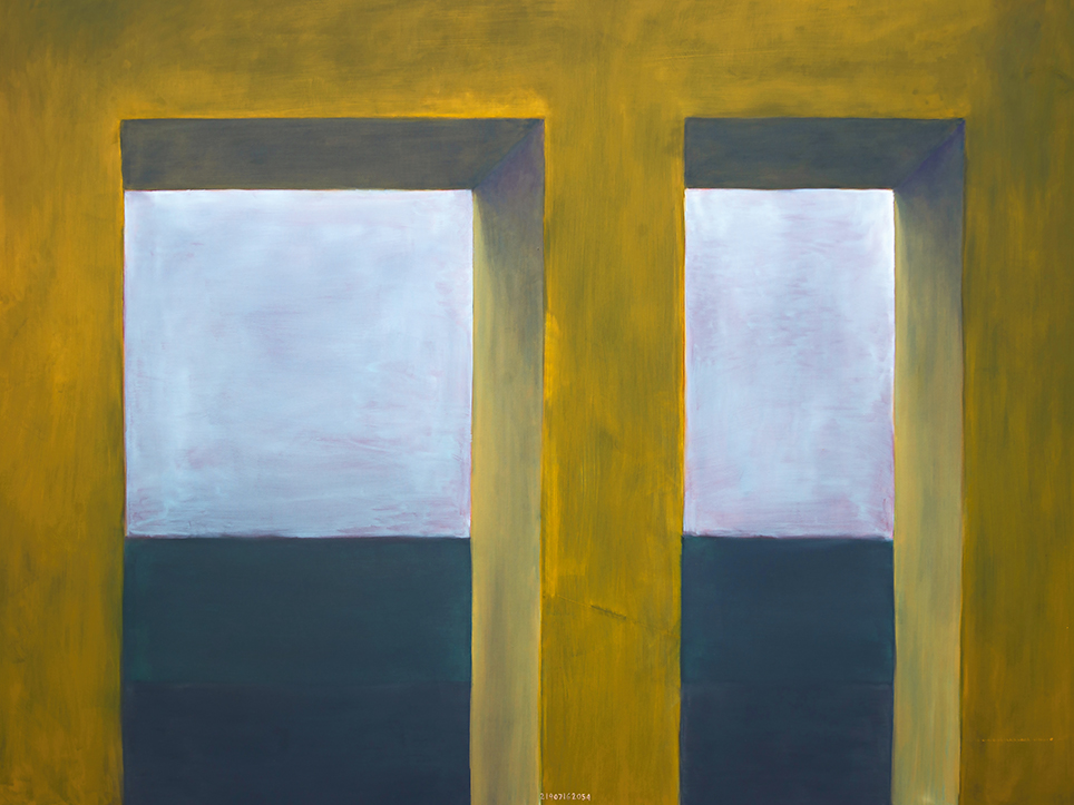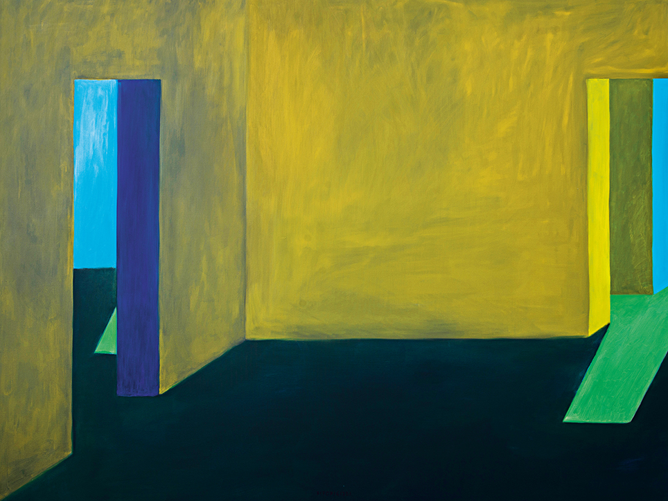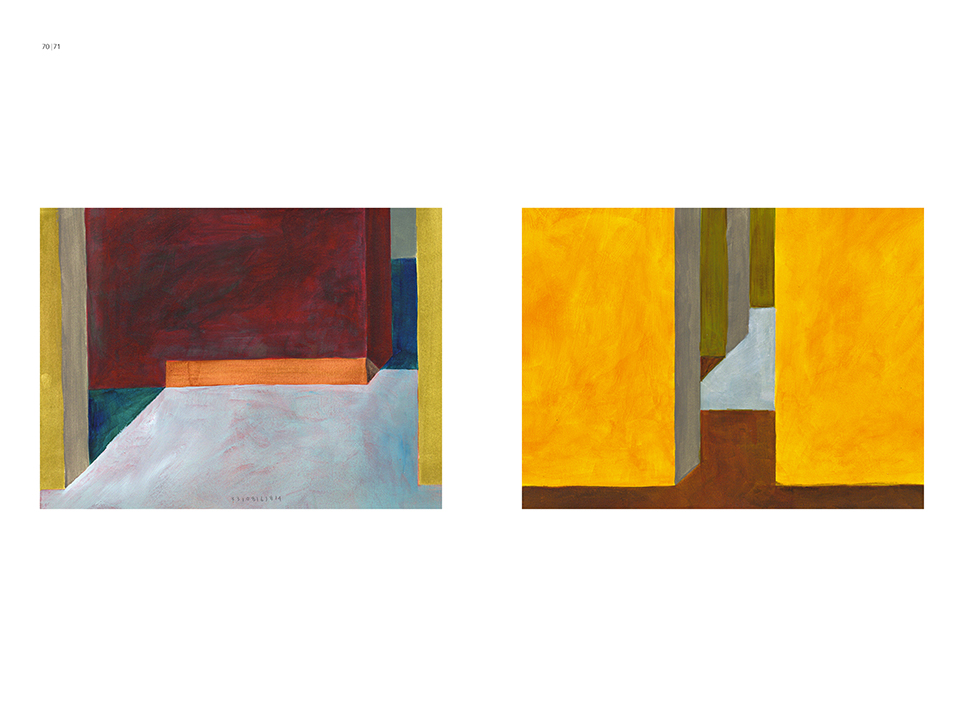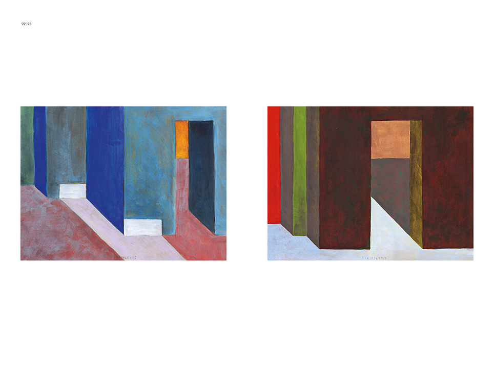 “Exterior” is an explicit counterpart to Pezo von Ellrichshausen’s previous self-contained axonometric structures. In their large and immersive format, as both abstract and figurative compositions, these latest paintings are portraying the reversible quality of rather familiar architectonic spaces. The relative scale, rawness and depth depicted in these simple rooms can be read as carefully selected fragments taken from no particular building, from a pervasive and perhaps idealized laconic architecture. As an incomplete open reality, every picture is framing a discreet, quiet and typical encounter of walls, floors and ceilings; with a precise articulation of corners by means of a few basic architectural elements such as openings, steps, columns and beams. These are intimate and lively atmospheres that evoke an implicit memory of a well known place while conveying those oblique yet personal instants of attention in our everyday life.