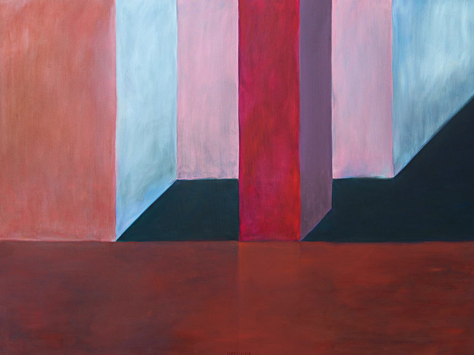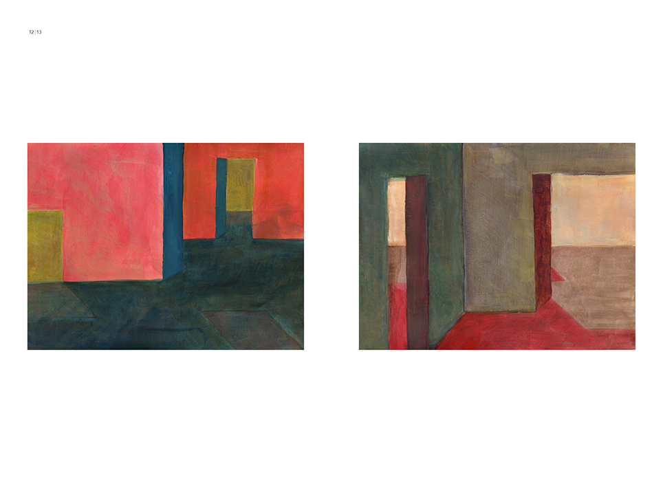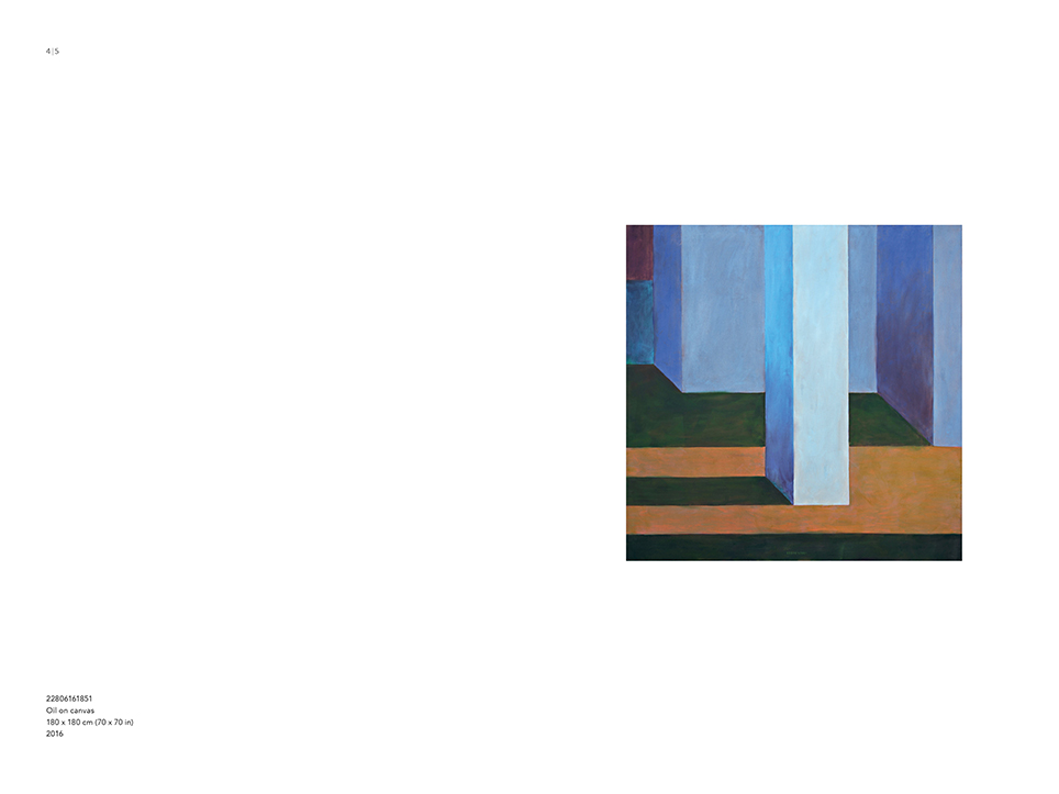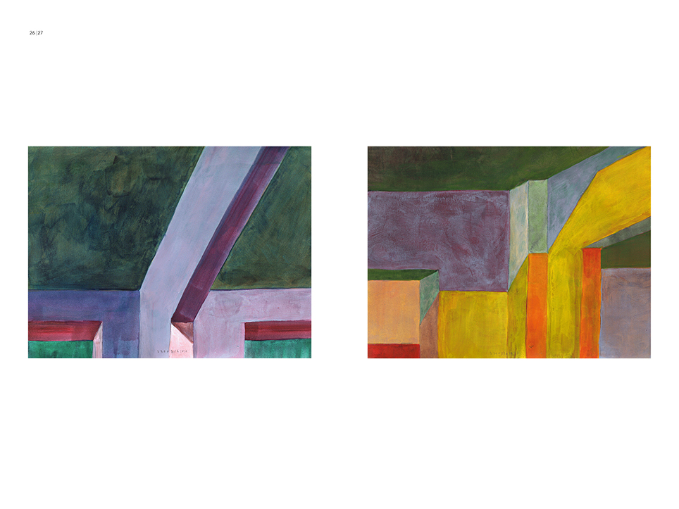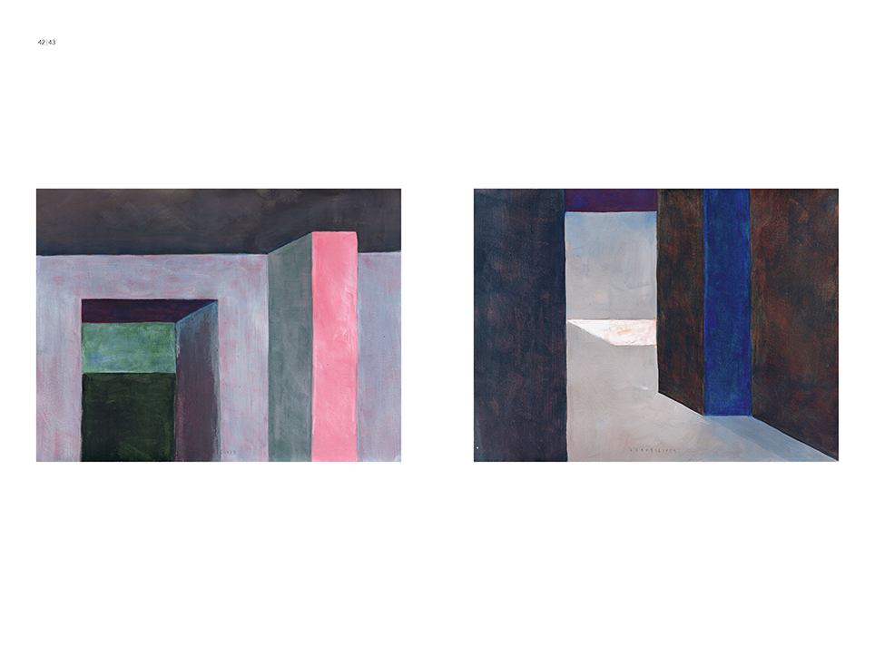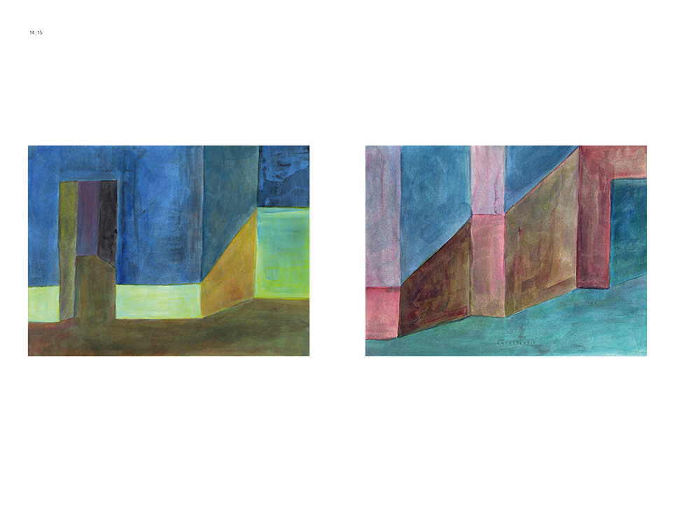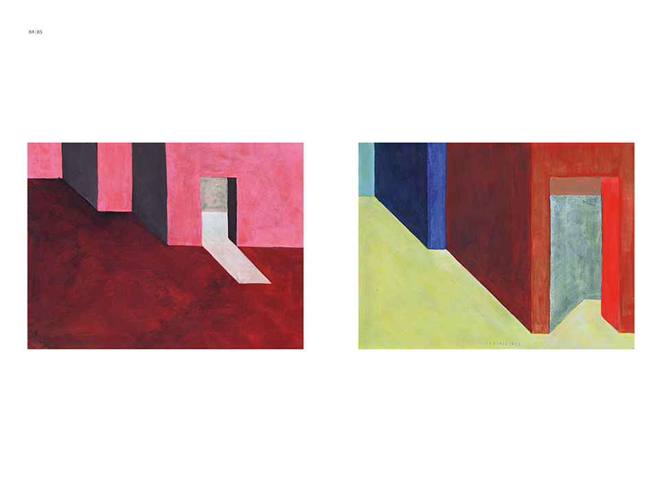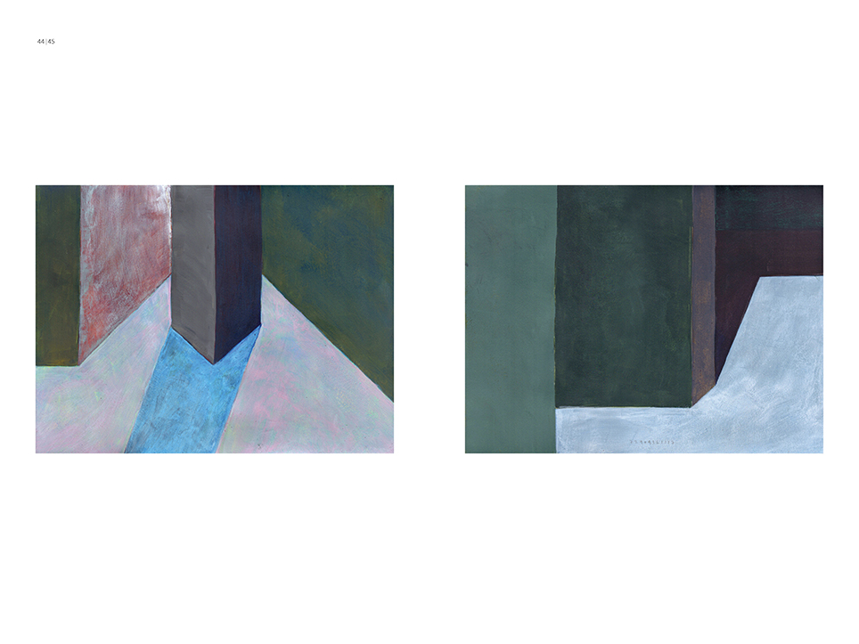 “Exterior” is an explicit counterpart to Pezo von Ellrichshausen’s previous self-contained axonometric structures. In their large and immersive format, as both abstract and figurative compositions, these latest paintings are portraying the reversible quality of rather familiar architectonic spaces. The relative scale, rawness and depth depicted in these simple rooms can be read as carefully selected fragments taken from no particular building, from a pervasive and perhaps idealized laconic architecture. As an incomplete open reality, every picture is framing a discreet, quiet and typical encounter of walls, floors and ceilings; with a precise articulation of corners by means of a few basic architectural elements such as openings, steps, columns and beams. These are intimate and lively atmospheres that evoke an implicit memory of a well known place while conveying those oblique yet personal instants of attention in our everyday life.