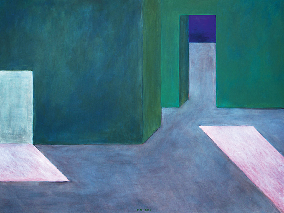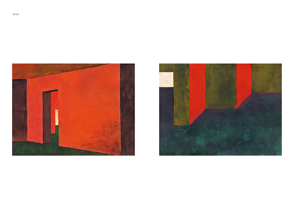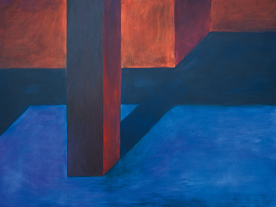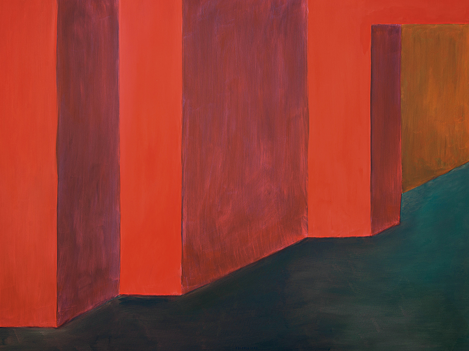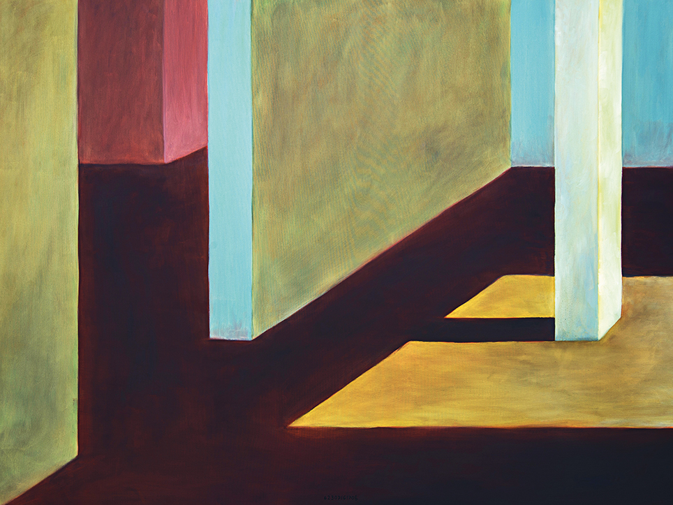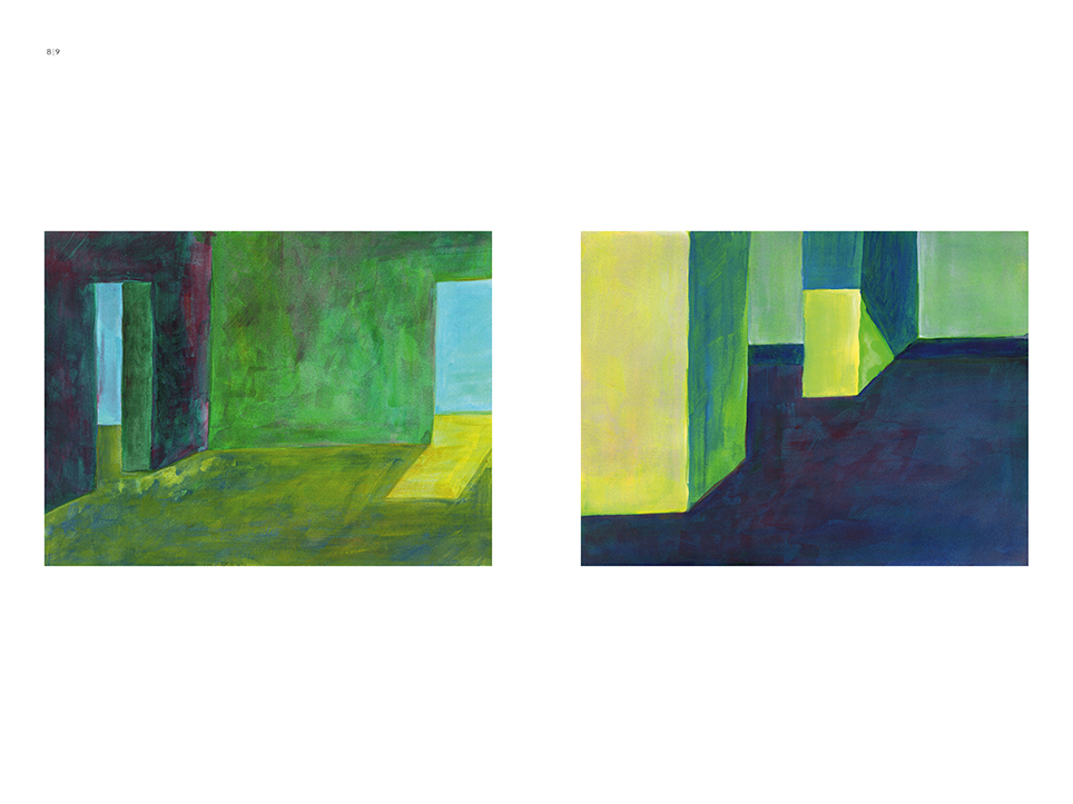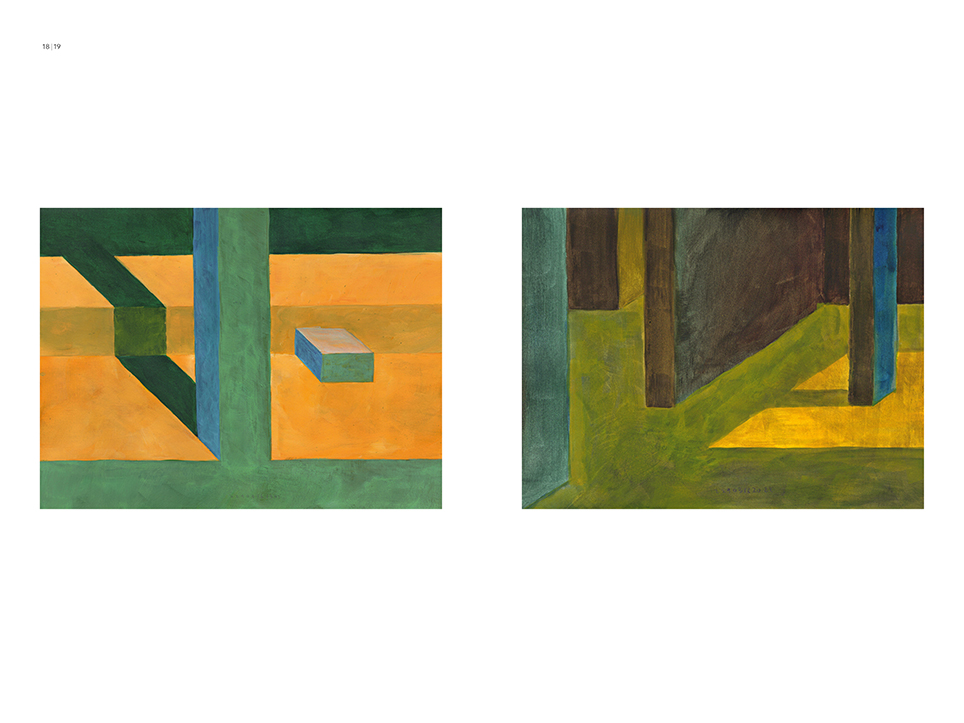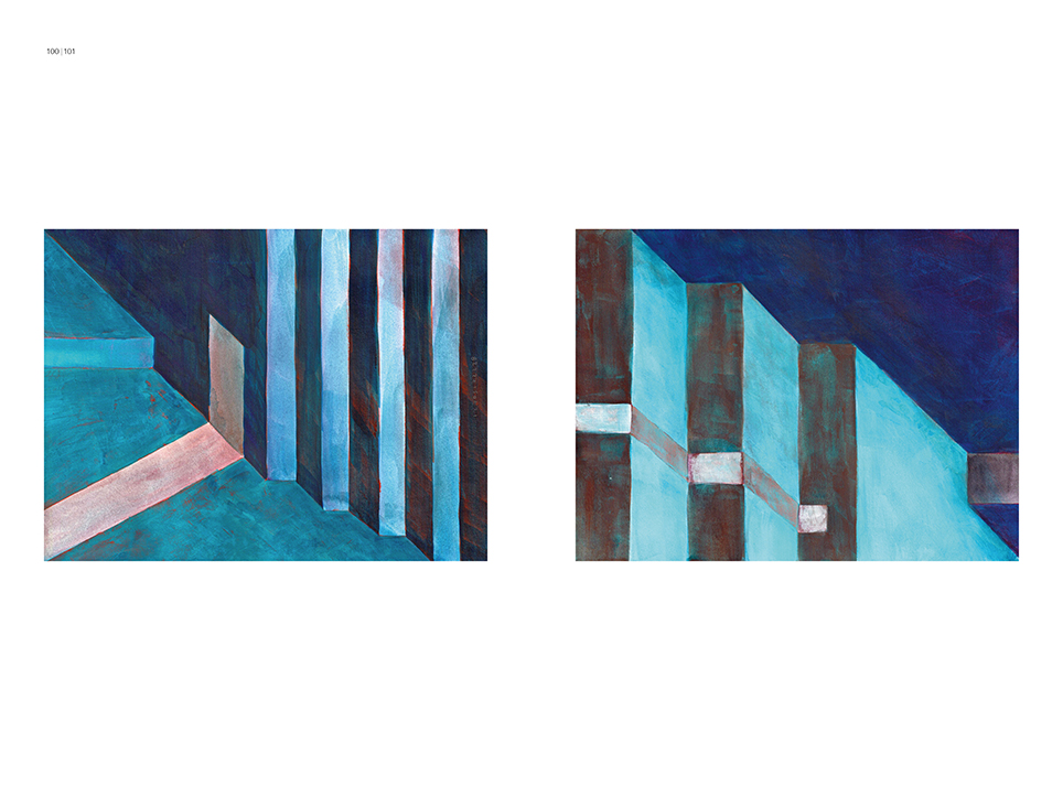 “Exterior” is an explicit counterpart to Pezo von Ellrichshausen’s previous self-contained axonometric structures. In their large and immersive format, as both abstract and figurative compositions, these latest paintings are portraying the reversible quality of rather familiar architectonic spaces. The relative scale, rawness and depth depicted in these simple rooms can be read as carefully selected fragments taken from no particular building, from a pervasive and perhaps idealized laconic architecture. As an incomplete open reality, every picture is framing a discreet, quiet and typical encounter of walls, floors and ceilings; with a precise articulation of corners by means of a few basic architectural elements such as openings, steps, columns and beams. These are intimate and lively atmospheres that evoke an implicit memory of a well known place while conveying those oblique yet personal instants of attention in our everyday life.