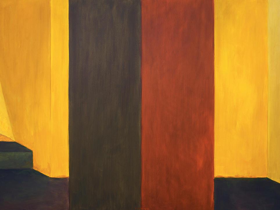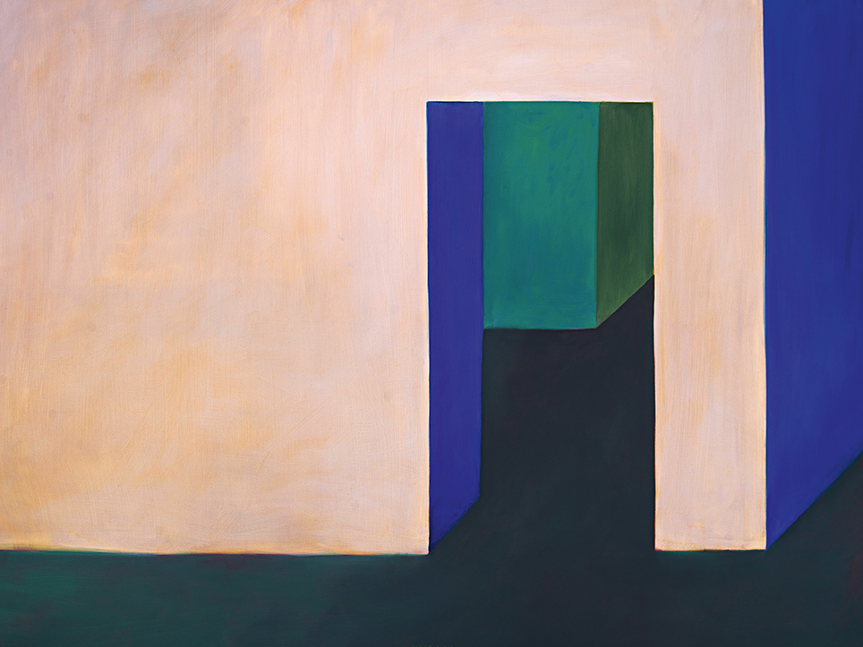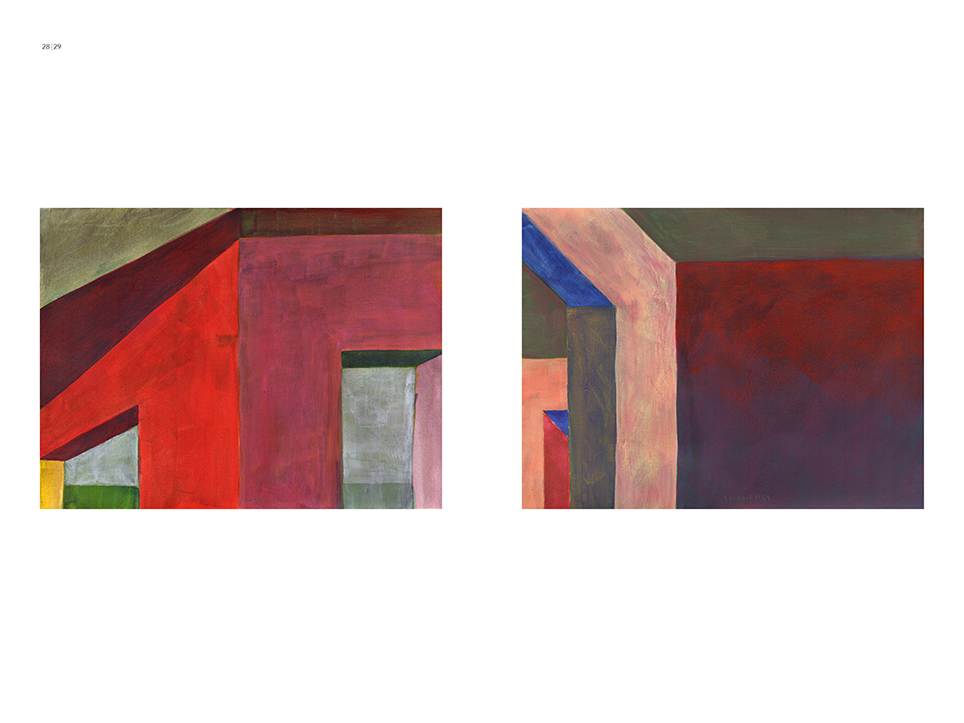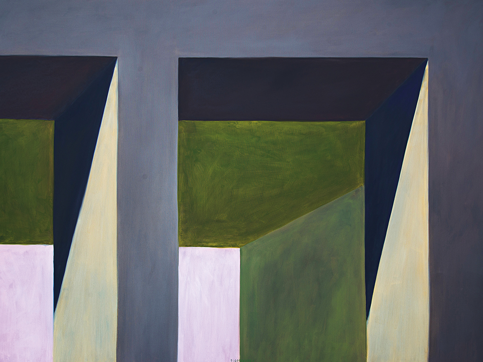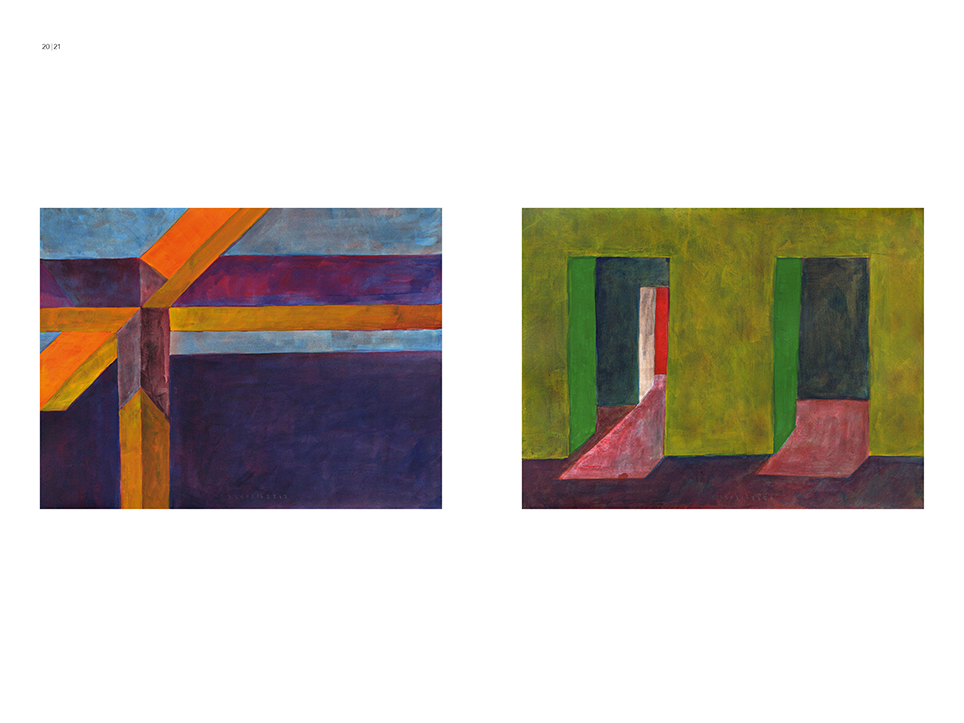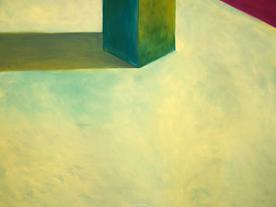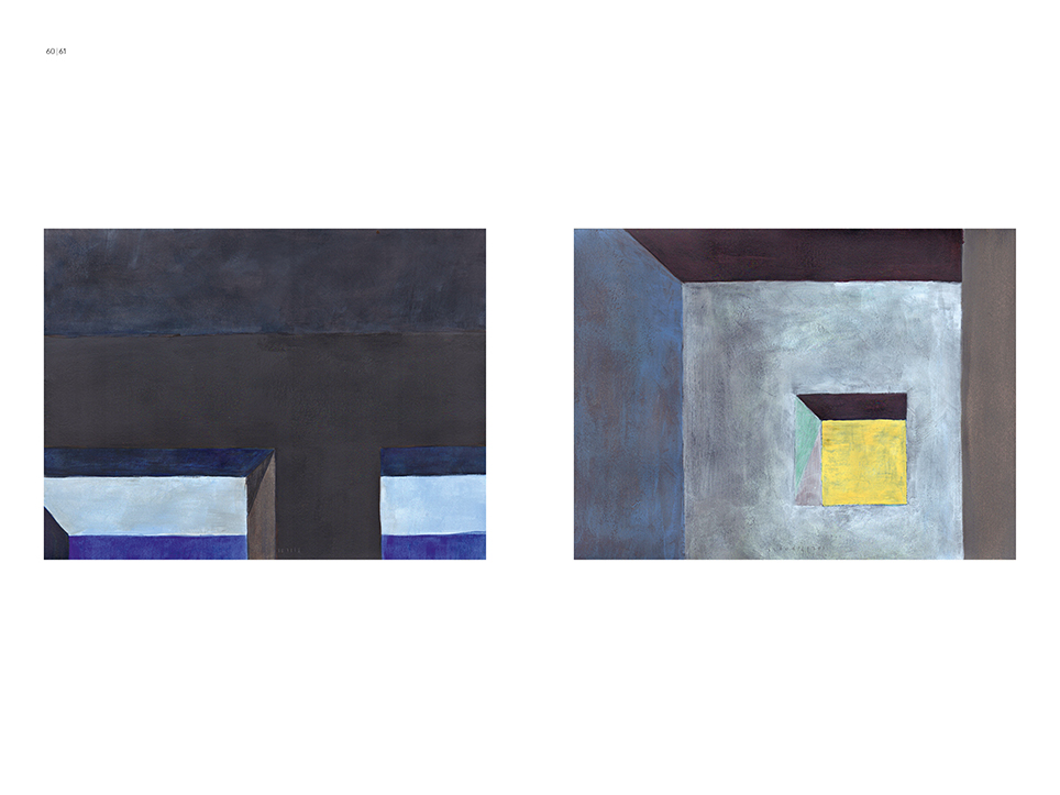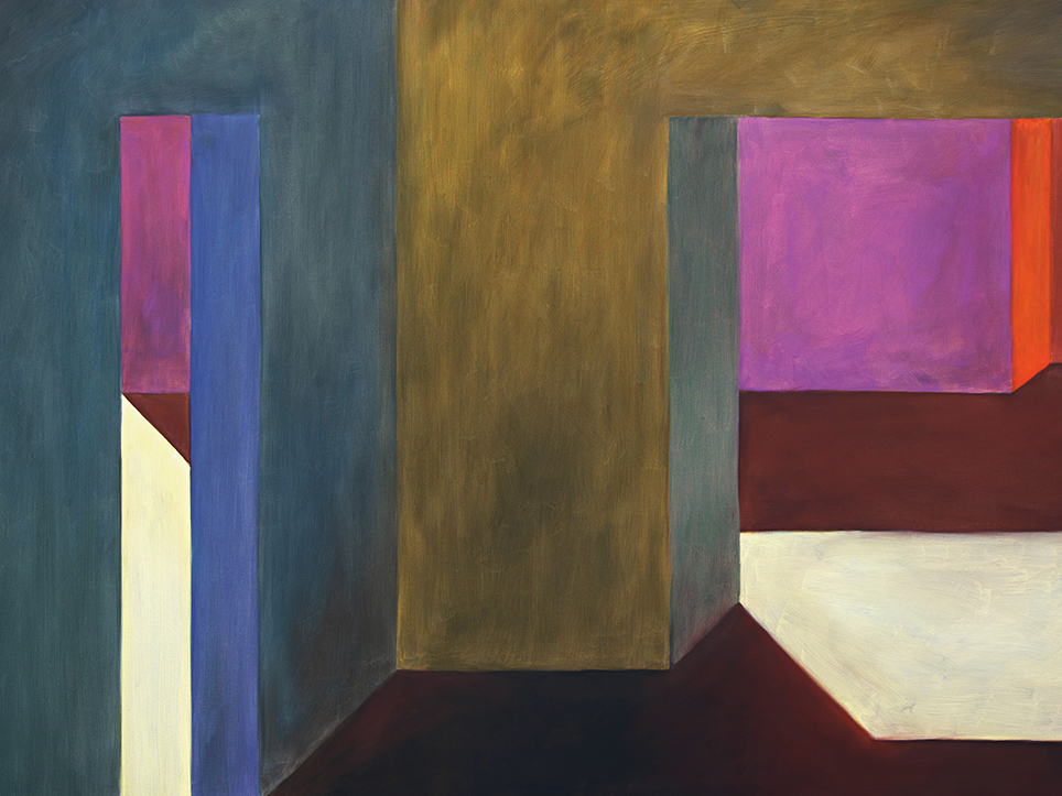 “Exterior” is an explicit counterpart to Pezo von Ellrichshausen’s previous self-contained axonometric structures. In their large and immersive format, as both abstract and figurative compositions, these latest paintings are portraying the reversible quality of rather familiar architectonic spaces. The relative scale, rawness and depth depicted in these simple rooms can be read as carefully selected fragments taken from no particular building, from a pervasive and perhaps idealized laconic architecture. As an incomplete open reality, every picture is framing a discreet, quiet and typical encounter of walls, floors and ceilings; with a precise articulation of corners by means of a few basic architectural elements such as openings, steps, columns and beams. These are intimate and lively atmospheres that evoke an implicit memory of a well known place while conveying those oblique yet personal instants of attention in our everyday life.