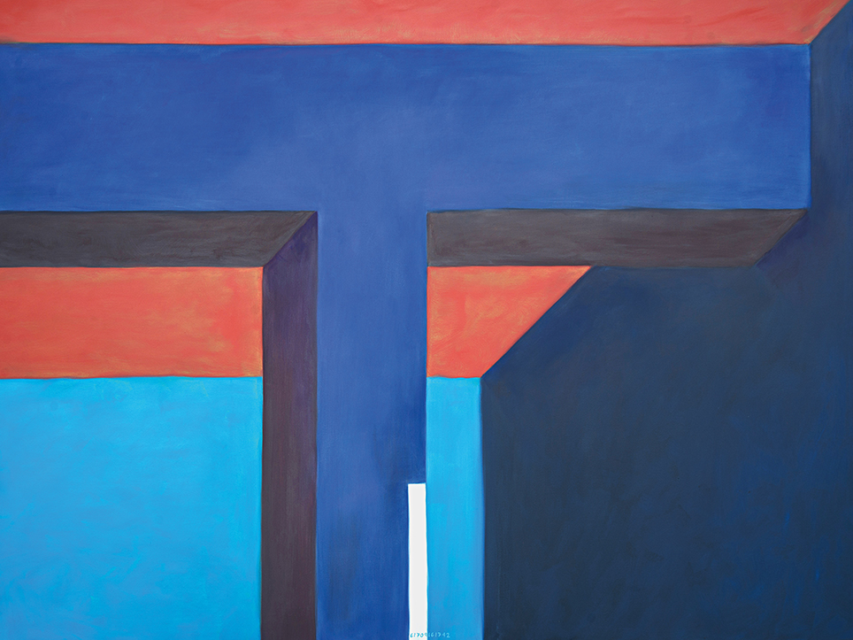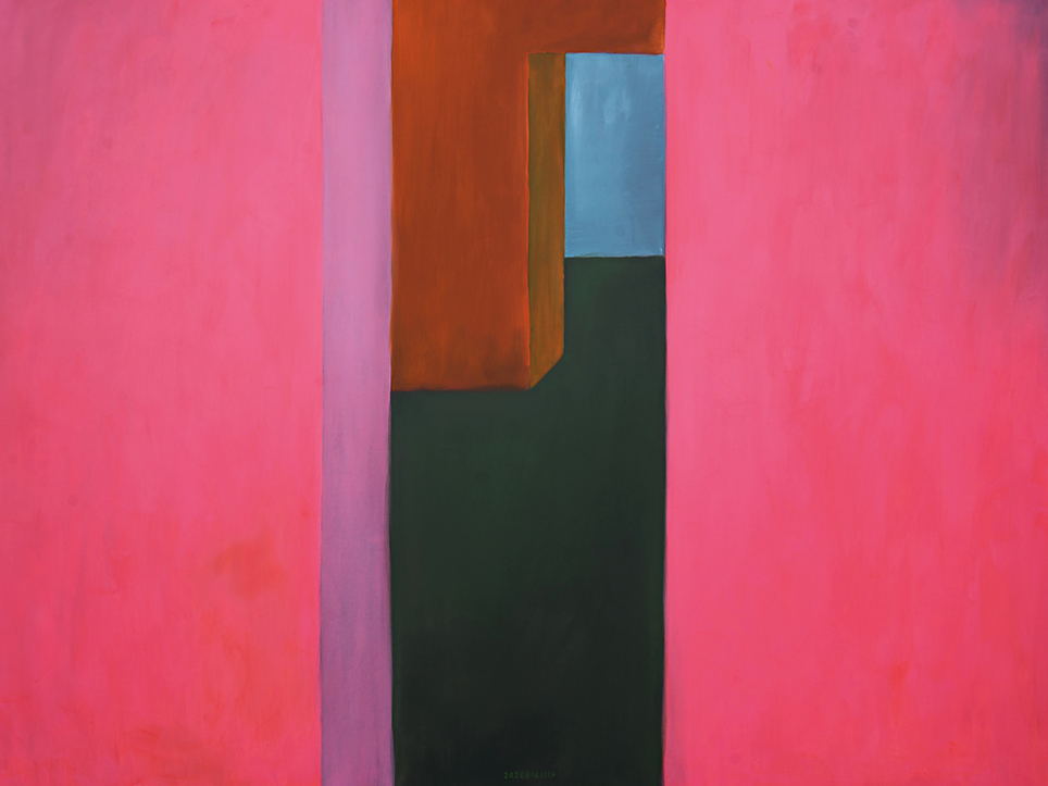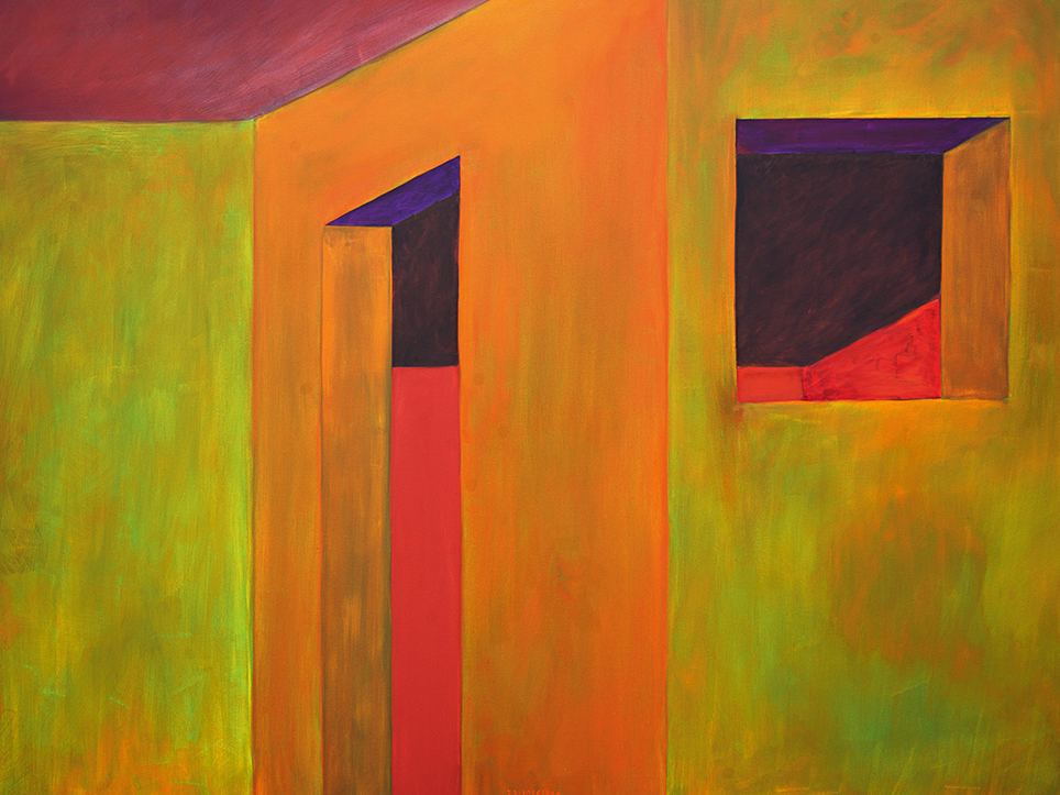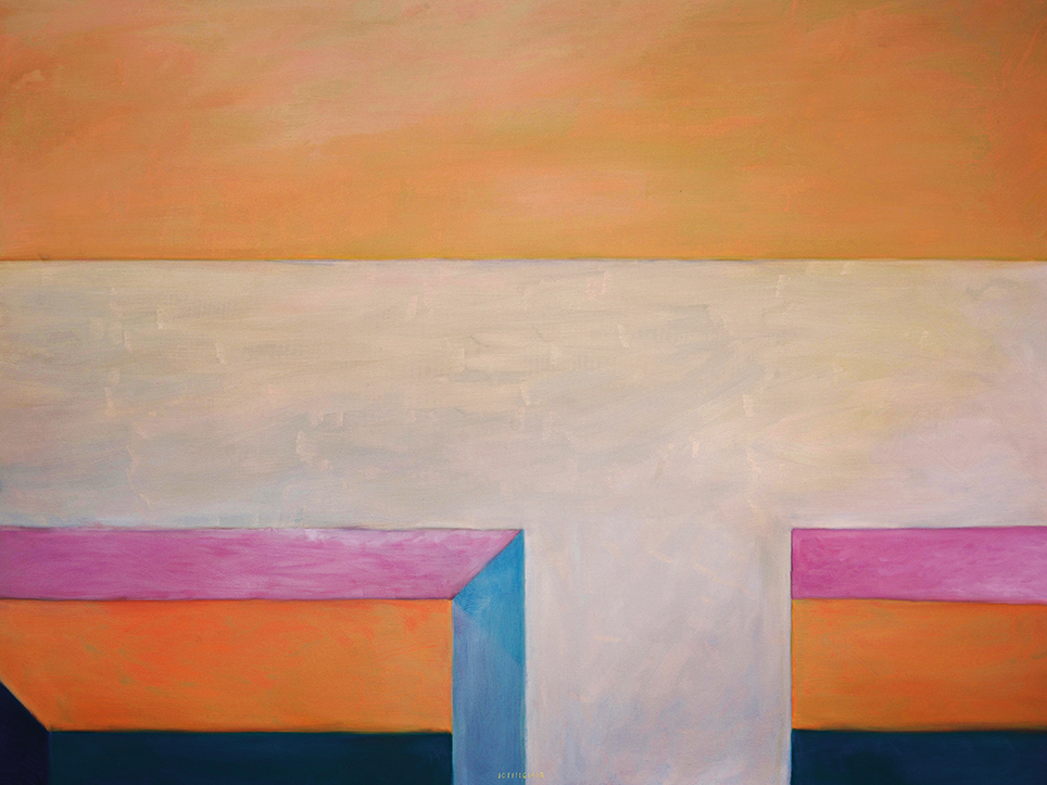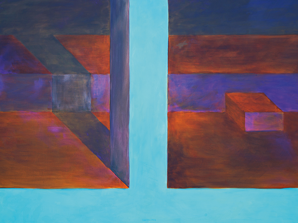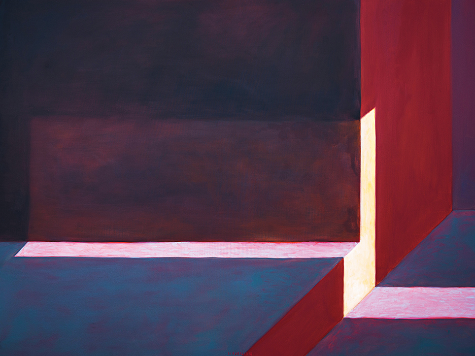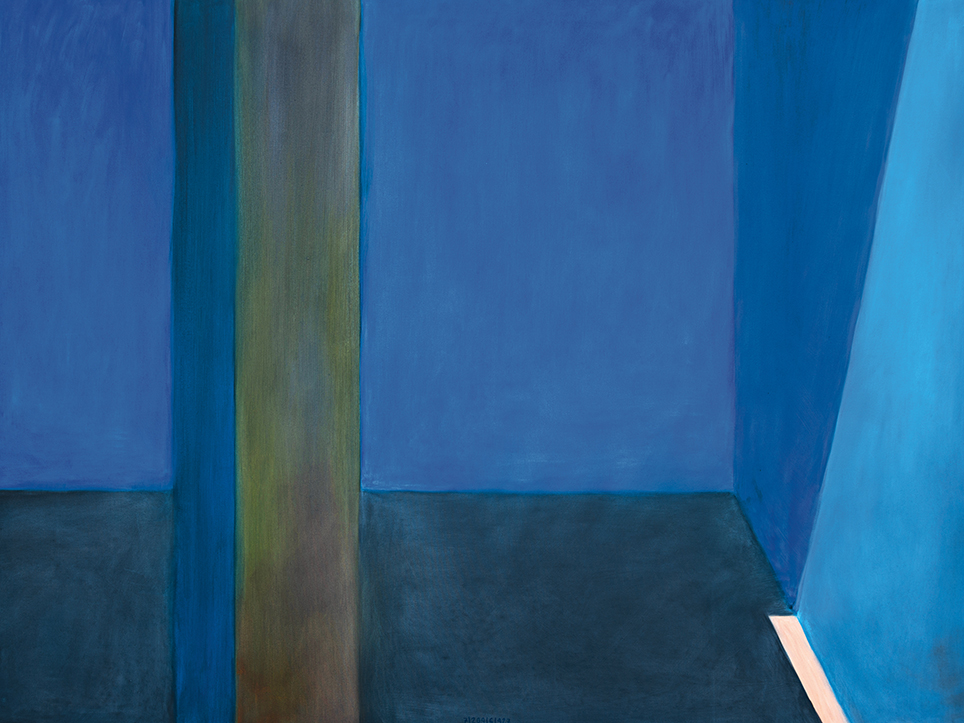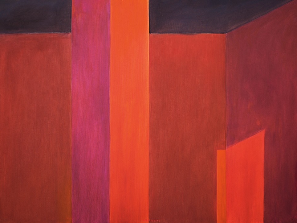 “Exterior” is an explicit counterpart to Pezo von Ellrichshausen’s previous self-contained axonometric structures. In their large and immersive format, as both abstract and figurative compositions, these latest paintings are portraying the reversible quality of rather familiar architectonic spaces. The relative scale, rawness and depth depicted in these simple rooms can be read as carefully selected fragments taken from no particular building, from a pervasive and perhaps idealized laconic architecture. As an incomplete open reality, every picture is framing a discreet, quiet and typical encounter of walls, floors and ceilings; with a precise articulation of corners by means of a few basic architectural elements such as openings, steps, columns and beams. These are intimate and lively atmospheres that evoke an implicit memory of a well known place while conveying those oblique yet personal instants of attention in our everyday life.