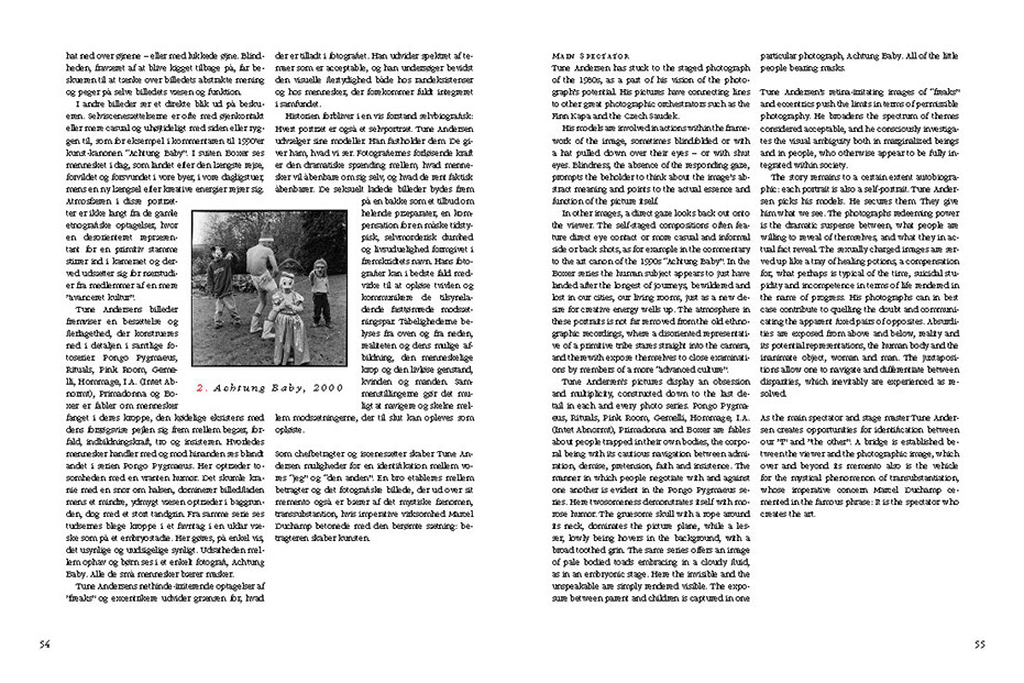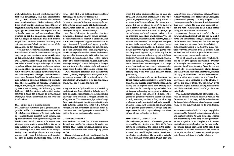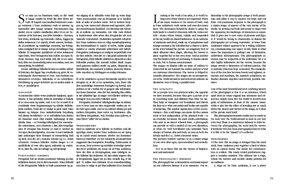 "Tune Andersen has stuck to the staged photograph of the 1980s, as a part of his vision of the photograph’s potential. His pictures have connecting lines to other great photographic orchestrators such as the Finn Kapa and the Czech Saudek.